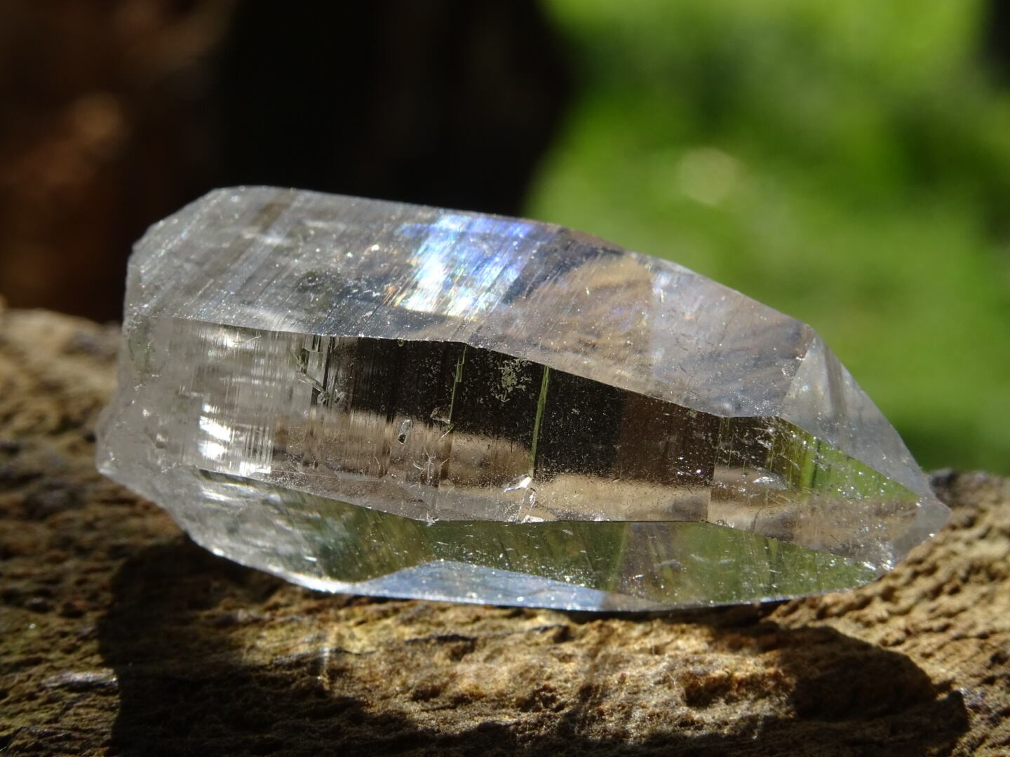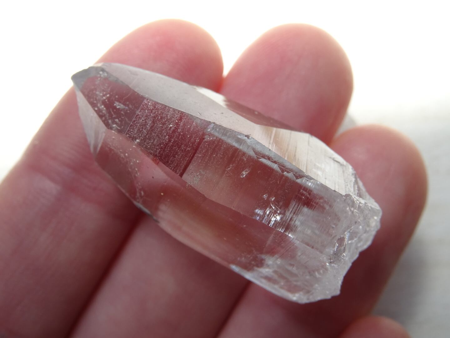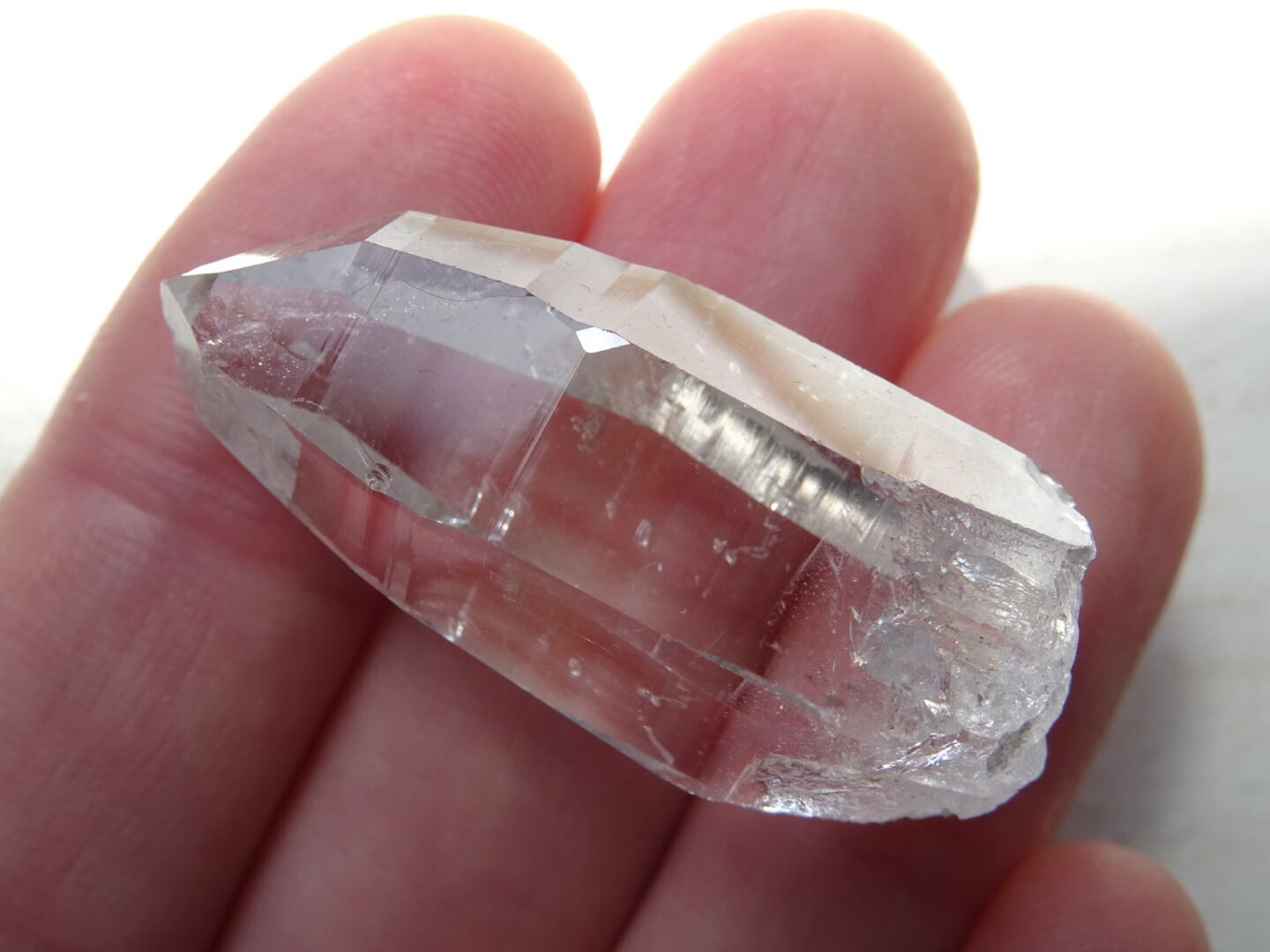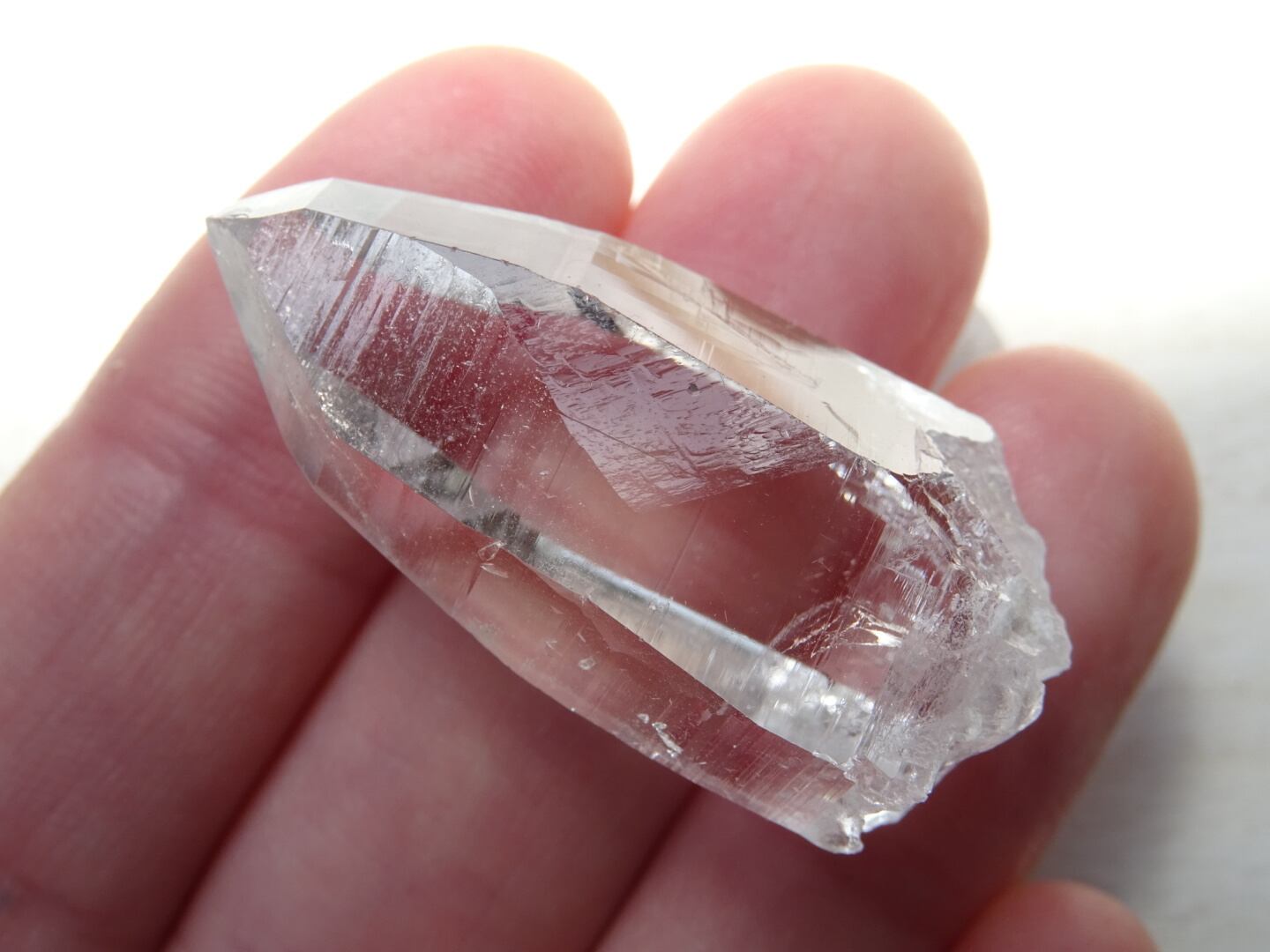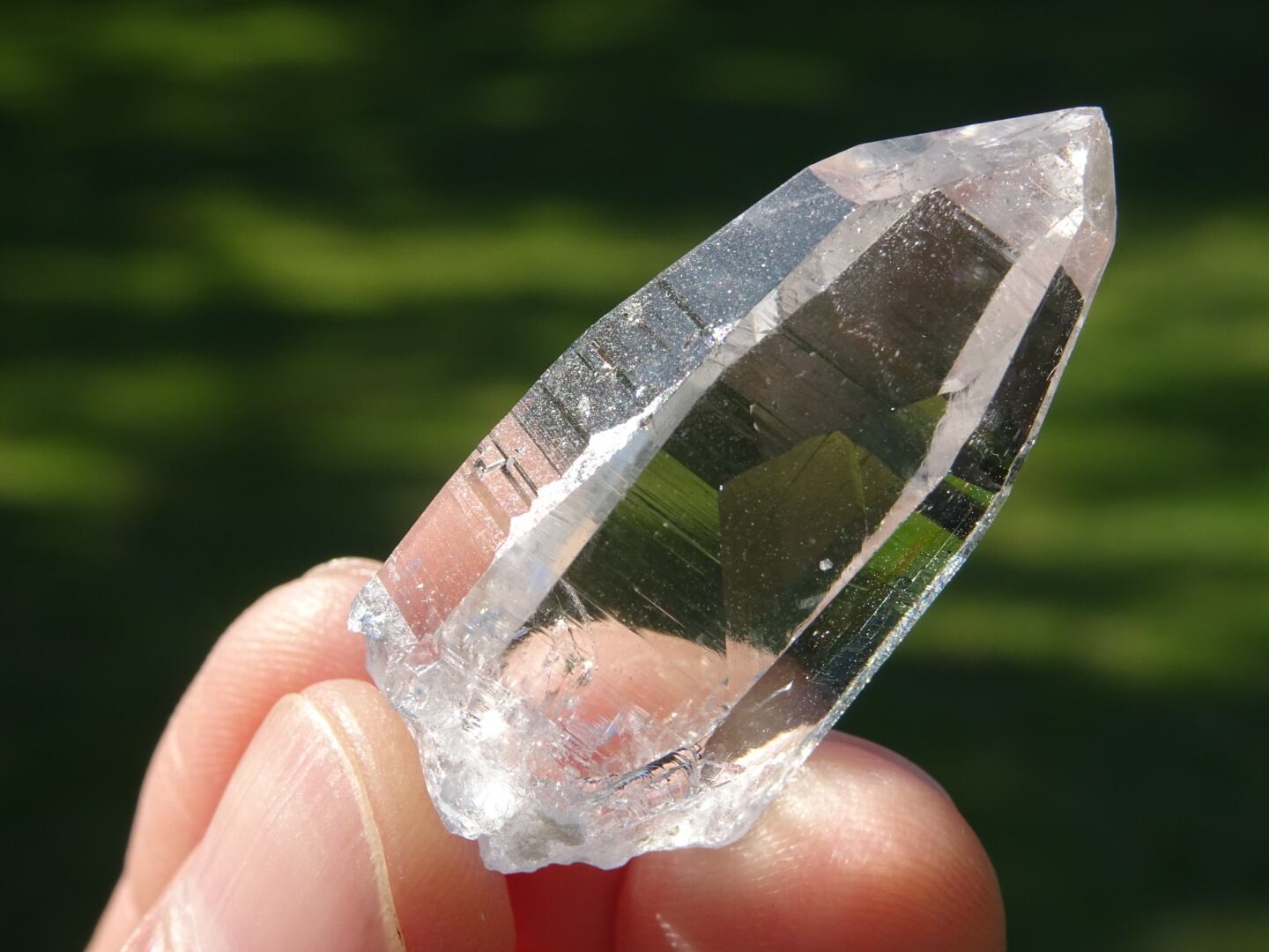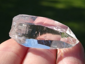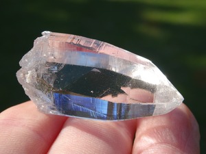 お水がそのまま結晶になったような透明感はご覧頂ける通りで、柱面に反射する虹色も綺麗。ファセットの2面にレコードキーパーのパターンが見られます。