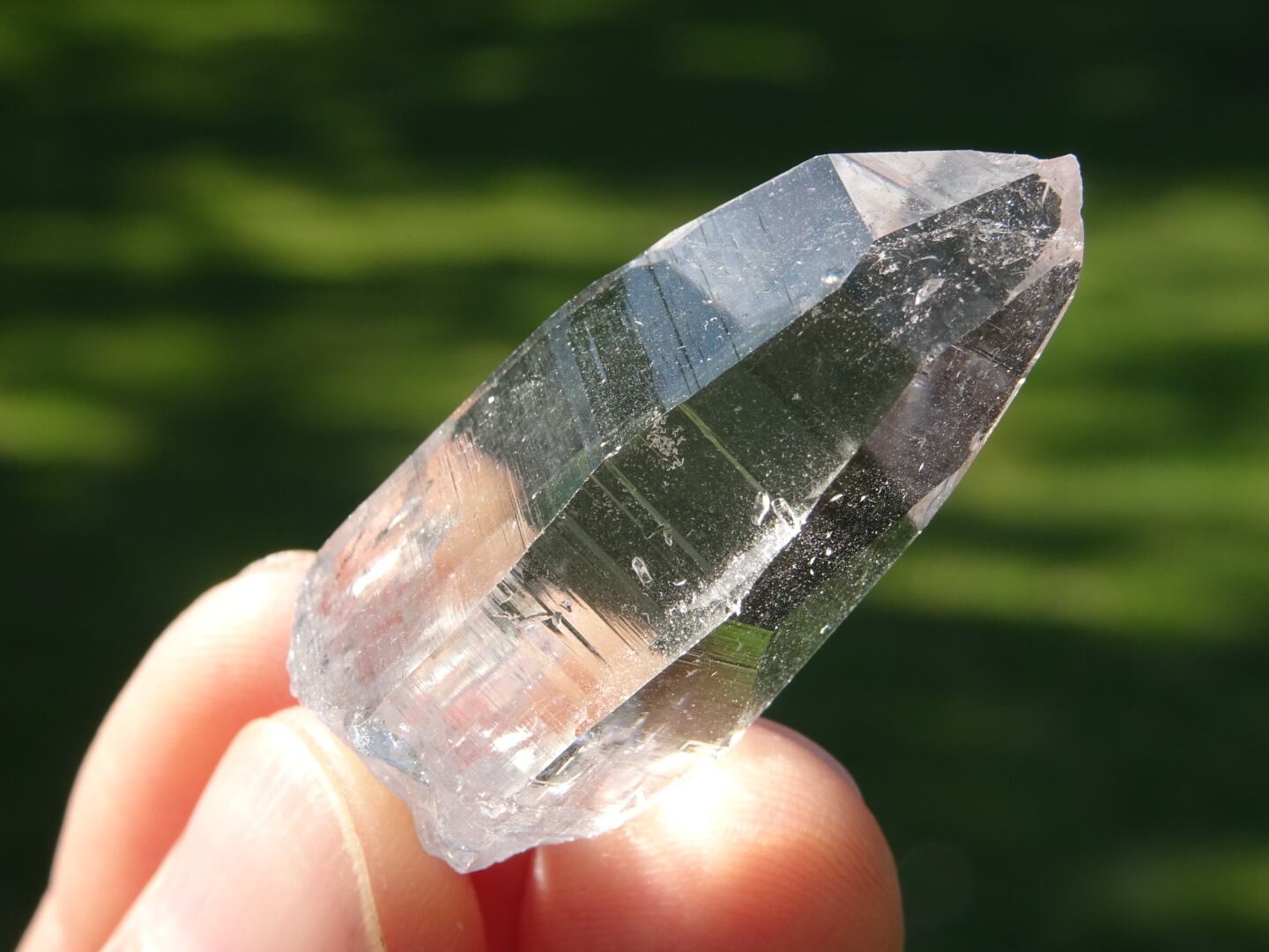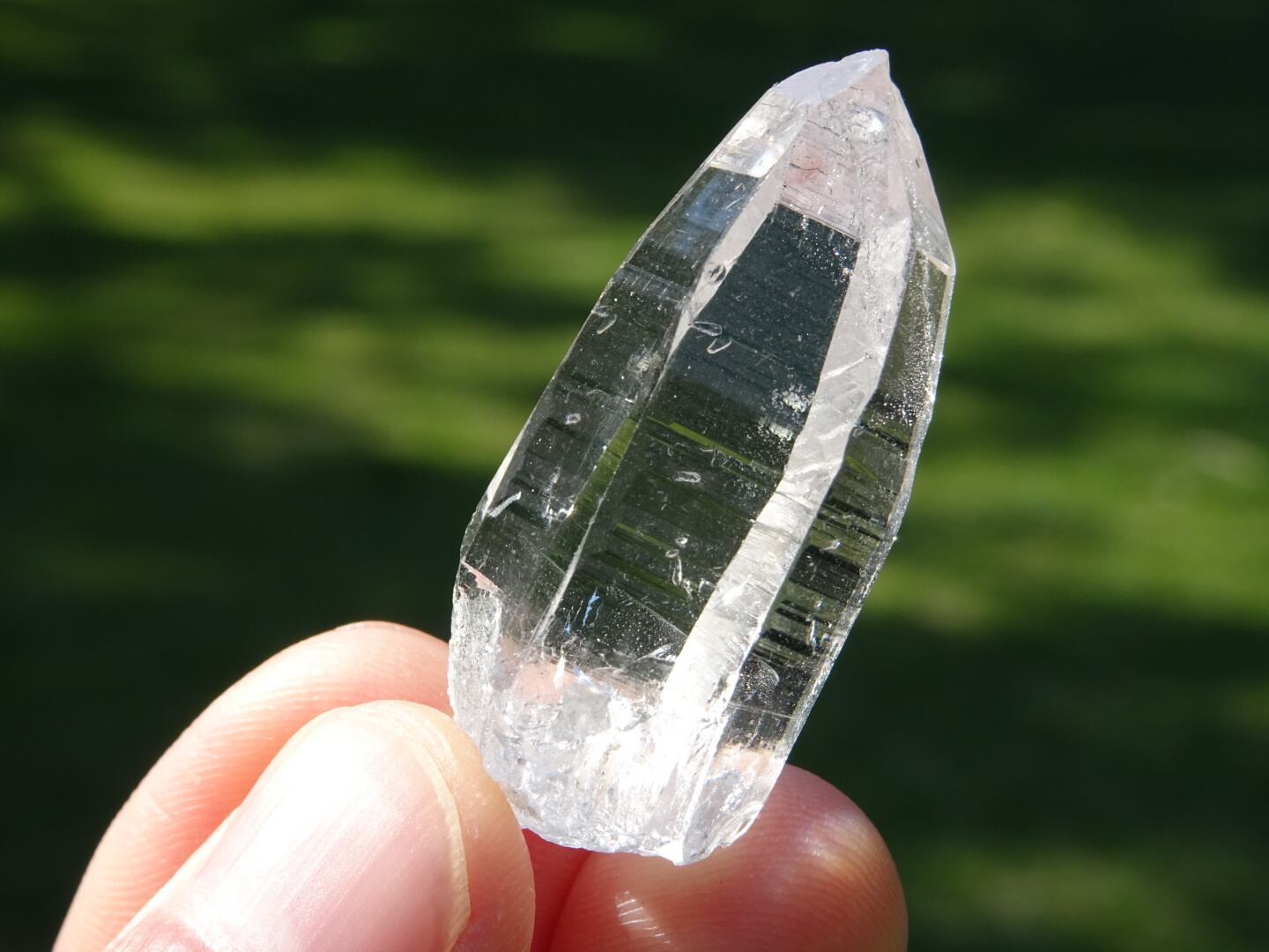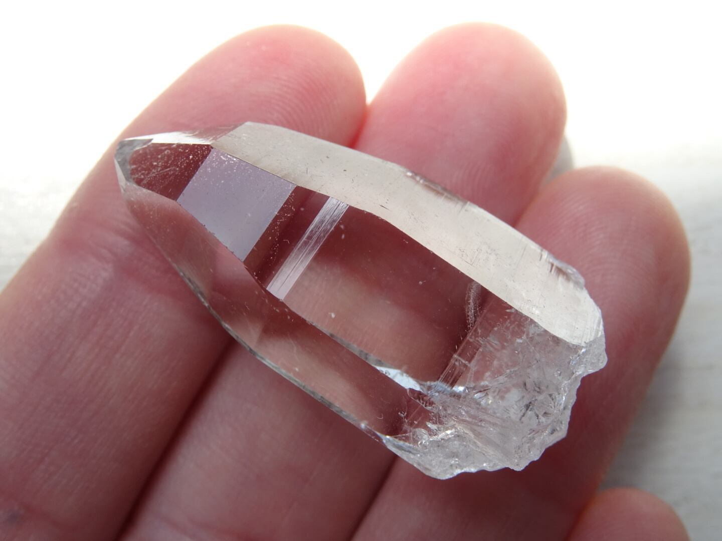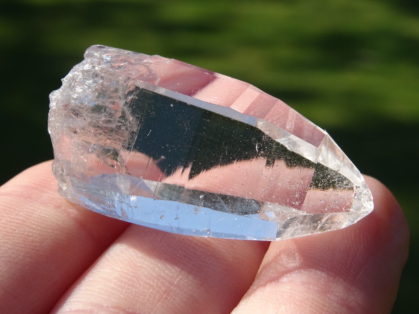 お水がそのまま結晶になったような透明感はご覧頂ける通りで、柱面に反射する虹色も綺麗。ファセットの2面にレコードキーパーのパターンが見られます。