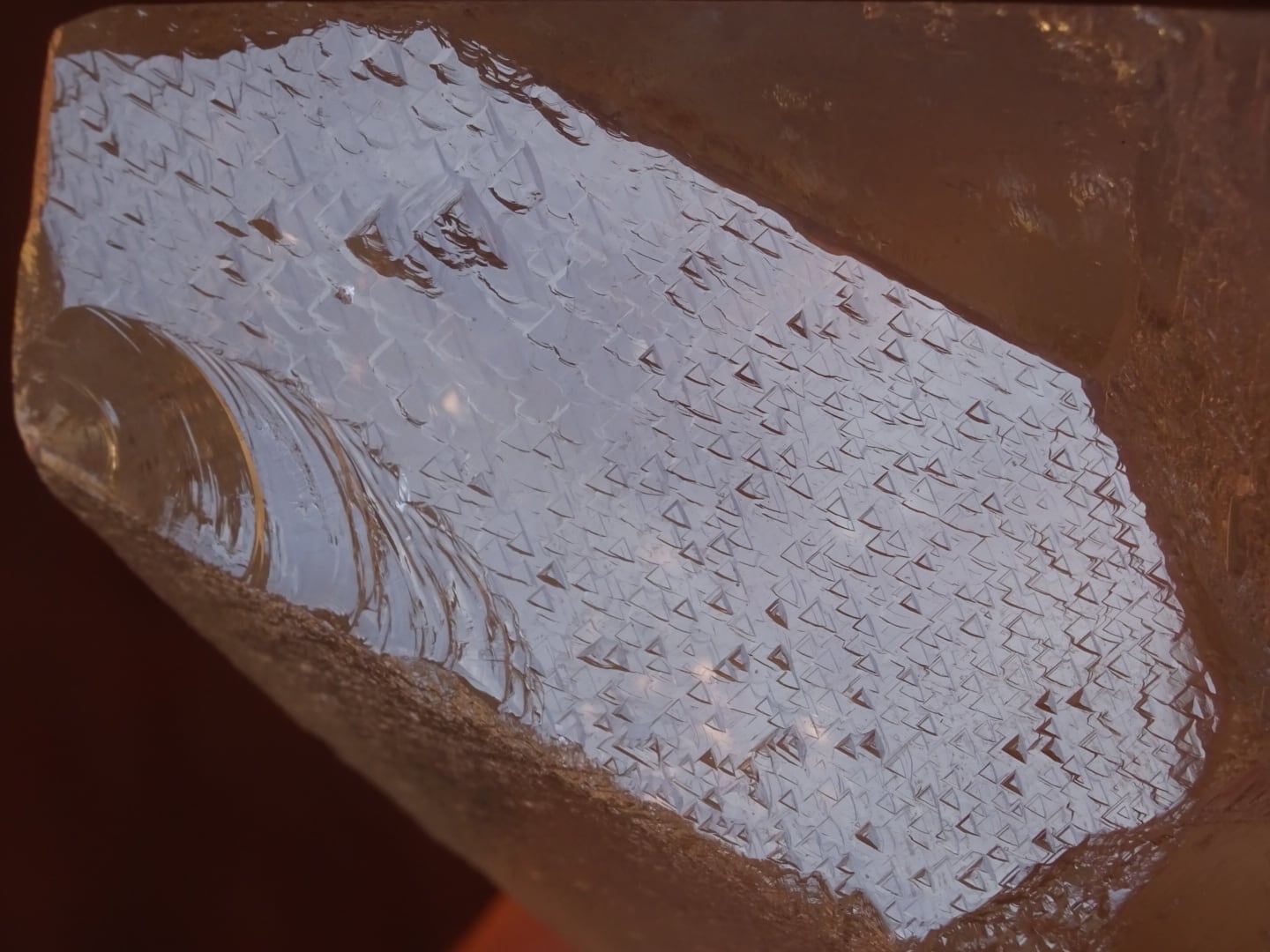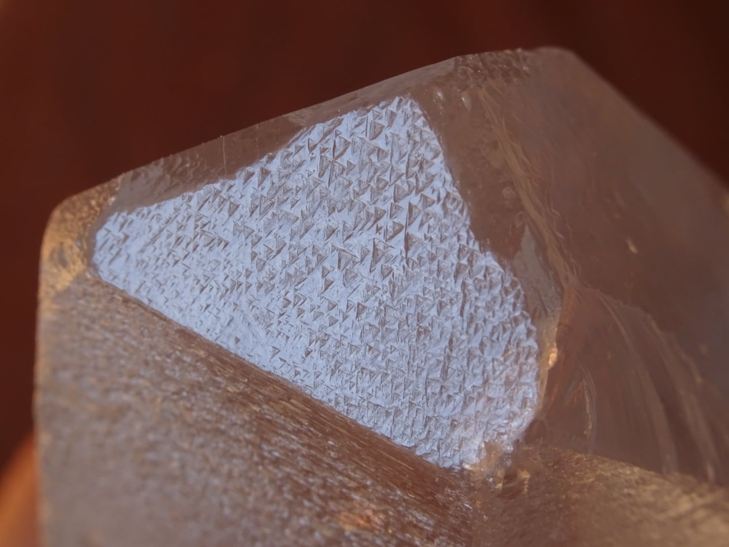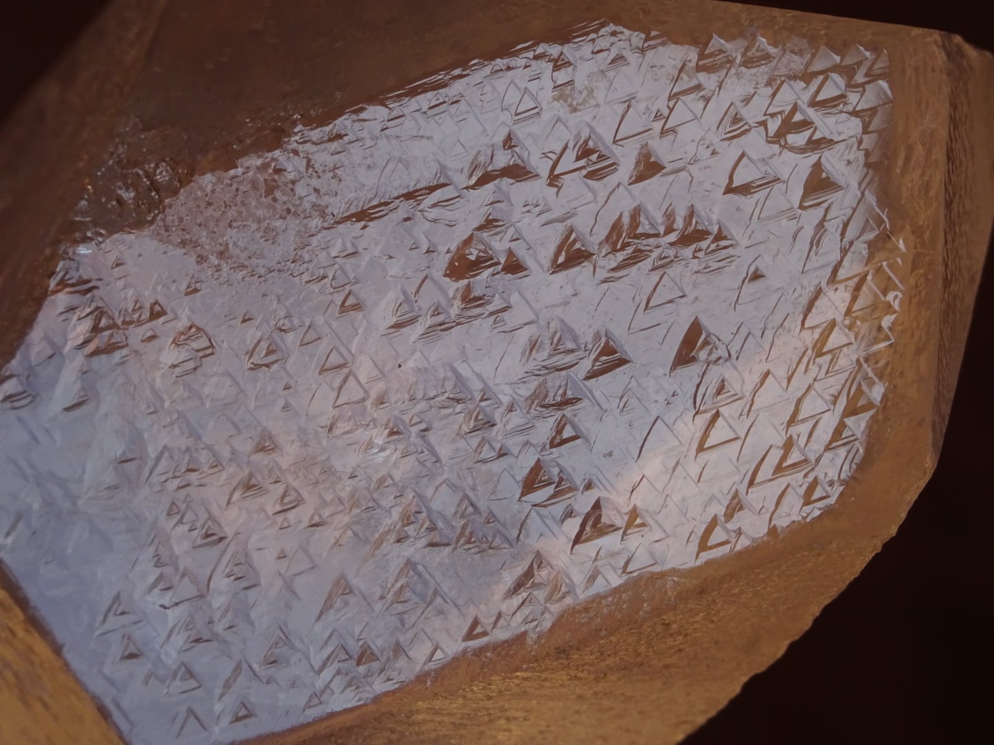 やはり特筆すべきはダイナミックに露出しているトライゴーニック群で、正面の3角ファセットを挟んだ2つの面に、上から下までびっしりと、▽▽▽群が深く浅く、とても美しく刻まれています。