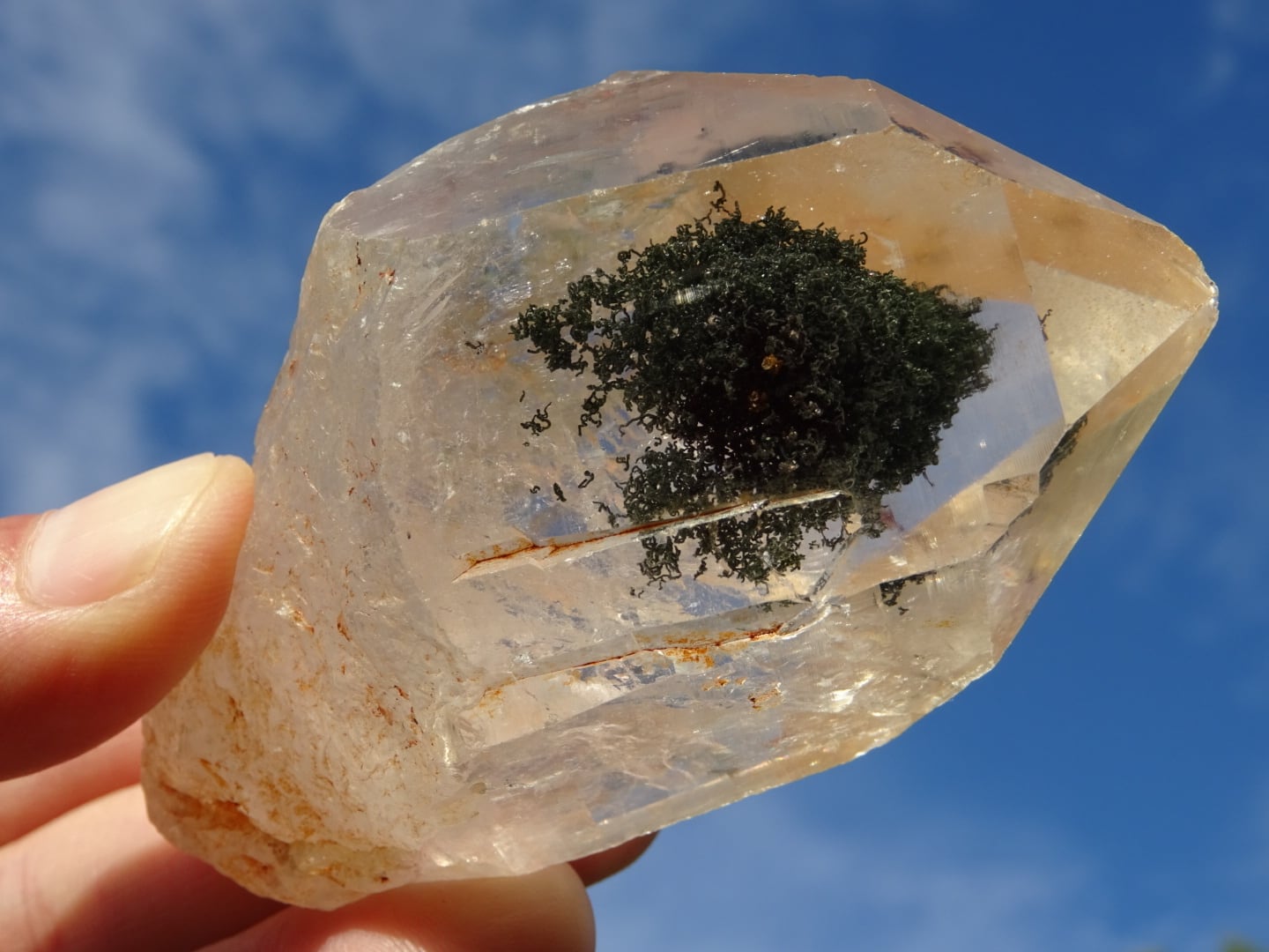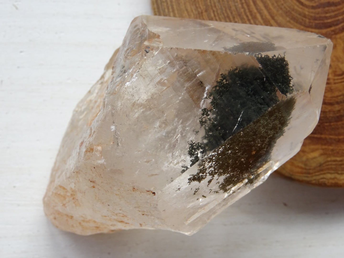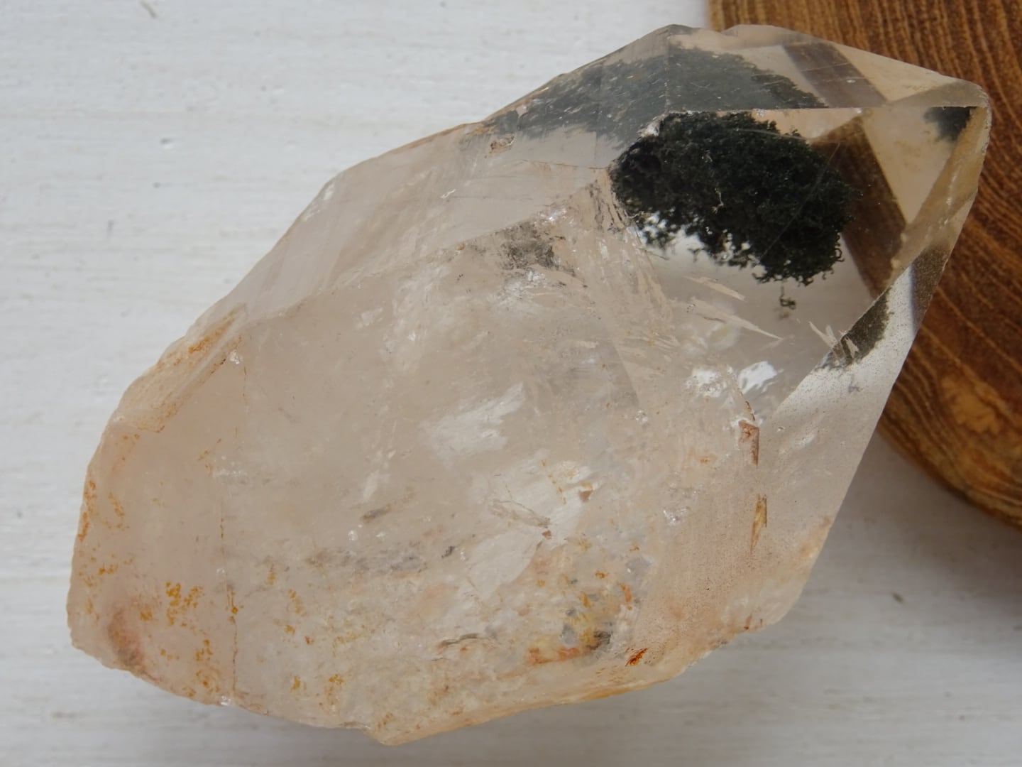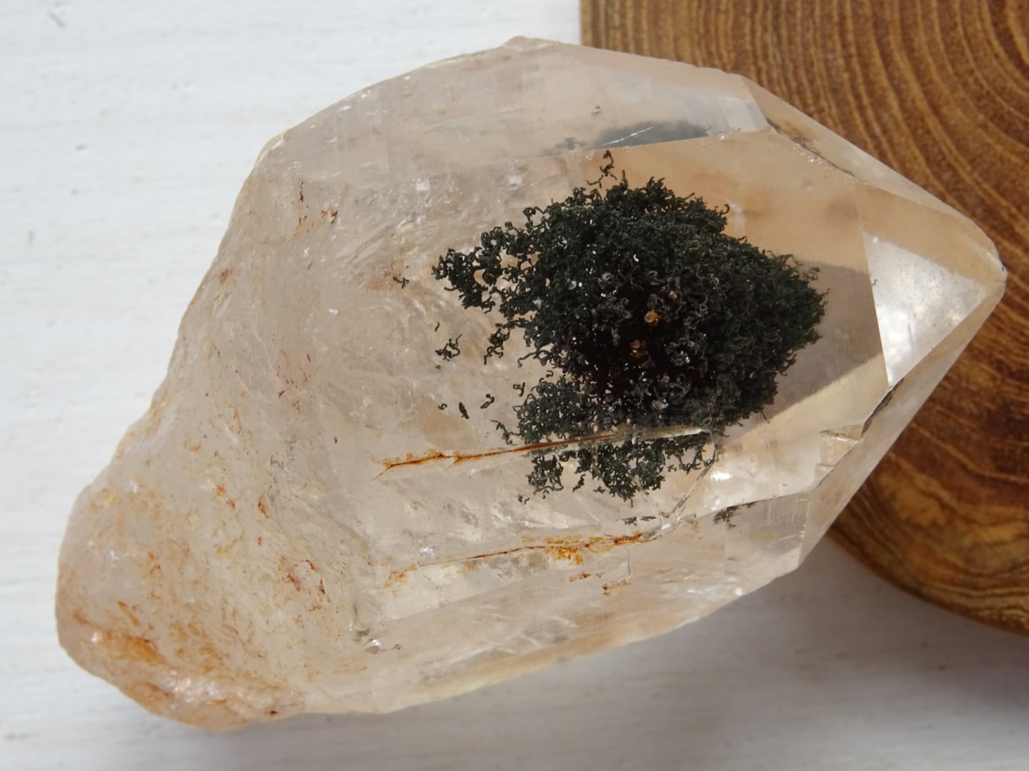 鉄分によってクリスタルが薄い夕日に照らされたように色づいているのも、ワイルドで素敵。内包されている苔のようなモスグリーンは、クローライト(緑泥石)。