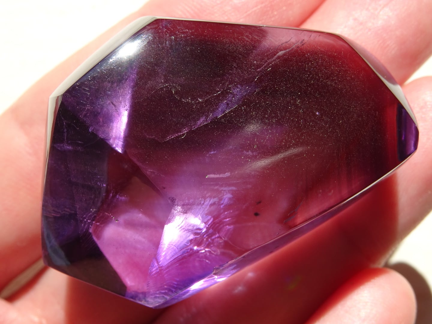 光に透かすとライトカラーになるのですが、手のひらに載せて見ると「紫色の影」が映るほどの深いパープル。