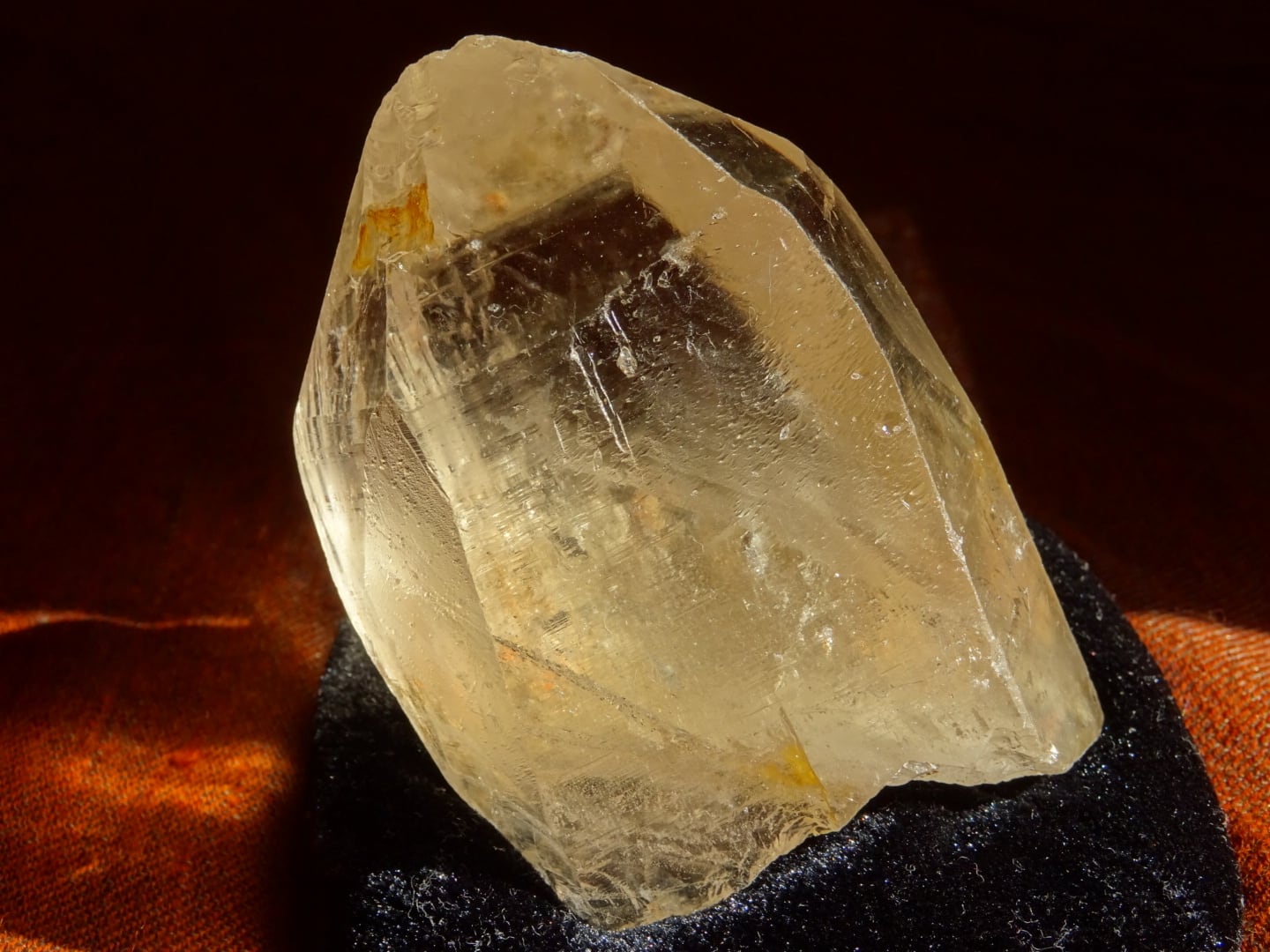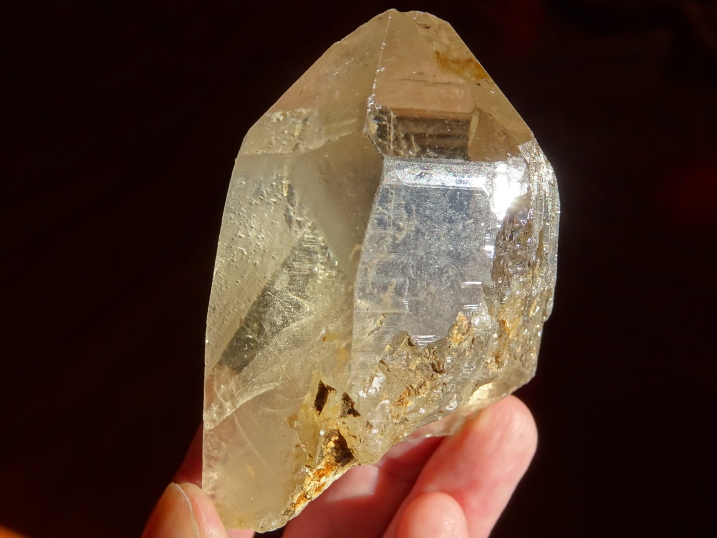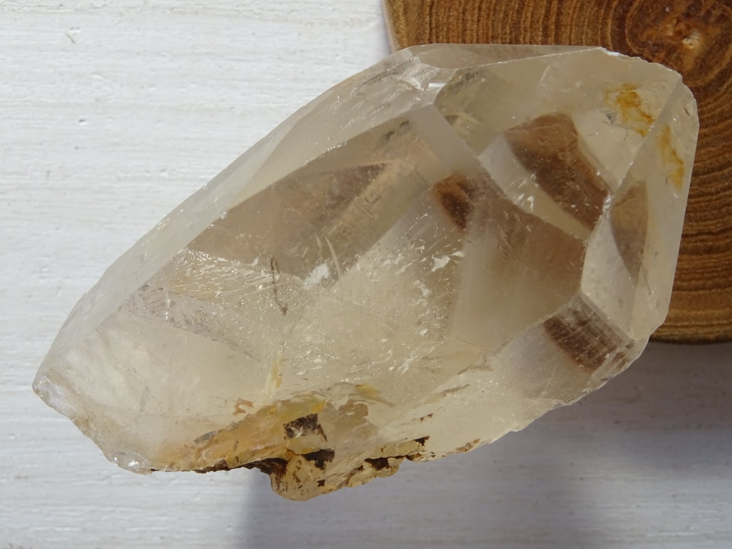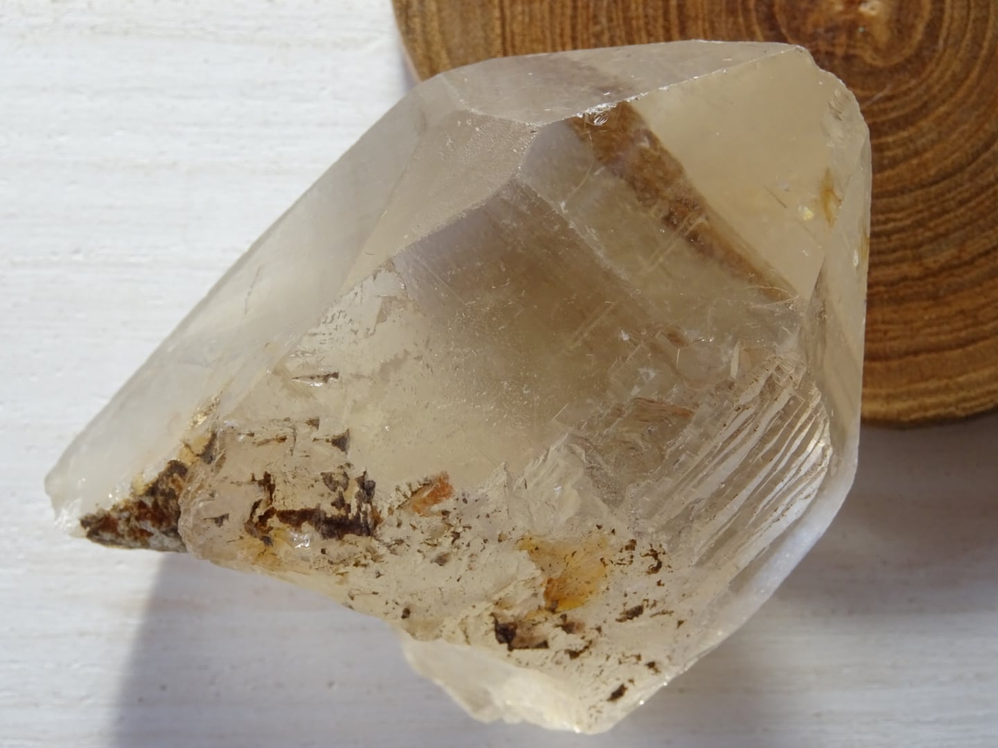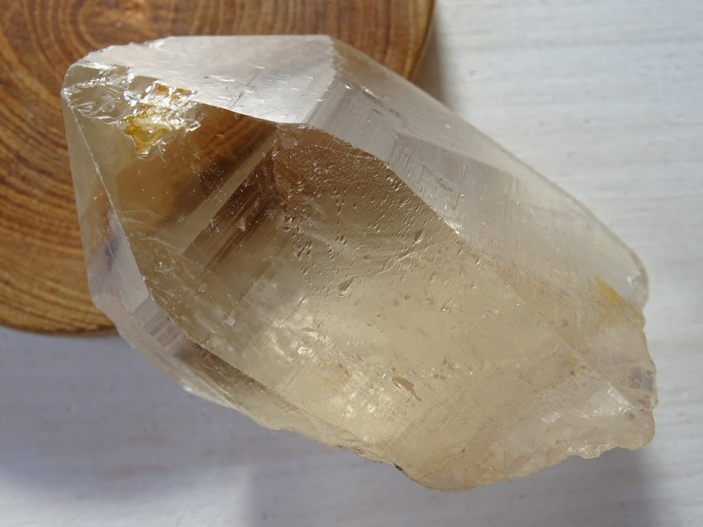 カケやえぐれなどはありますが、比較的に透明度も高く、結晶フォルムもしっかりしたもの。リモナイトの影響で少しだけ色づいて見えます。