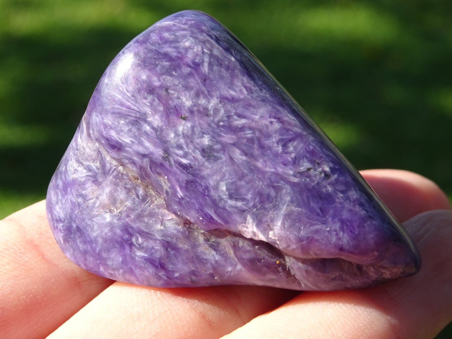 チャロアイトのやわらかいけれど深い紫の色は、やさしい慈しみのEnergyのようで、手にしていると自分の全体がそれによって保護されているような感覚にもなります。また、こころの痛みを中和してくれるようにも思います。