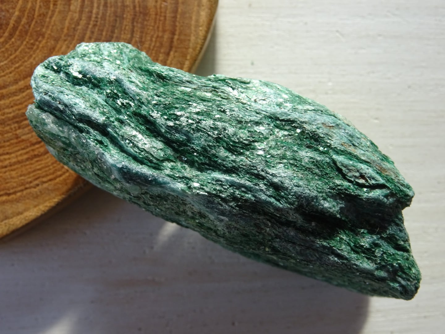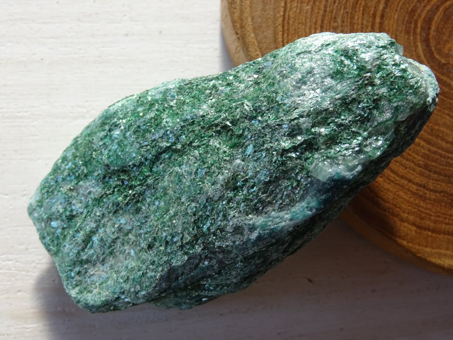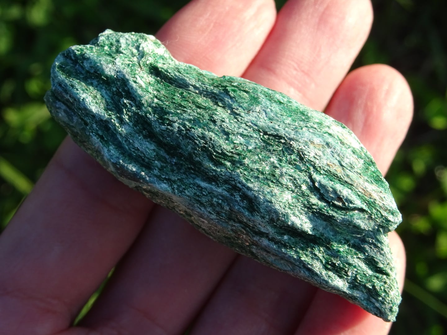 フックサイトは雲母、つまりマイカの一種なのですが、クロムを含むことによって美しいGreenの色合いになります。クロムの含有率によって濃淡が決まるそうなので、その意味ではこちらは「クロムたっぷり」の濃いめの色合いかも知れません。