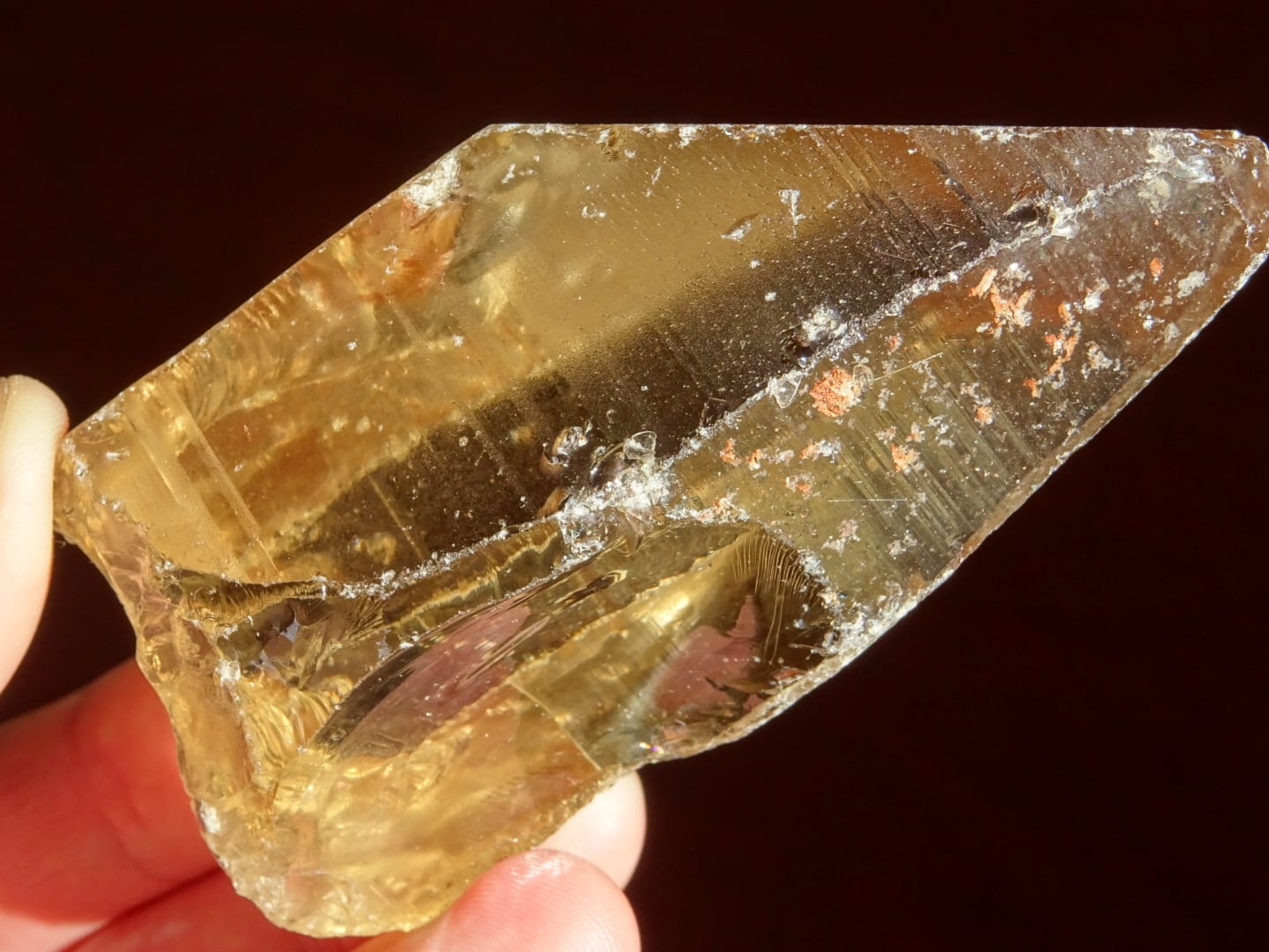 なんだかガラスそのもののようでとても素敵なのですが、正面部分からはとっても綺麗な虹を出していて(2本目の動画をご覧ください)。それもこの結晶の大きなポイントです。