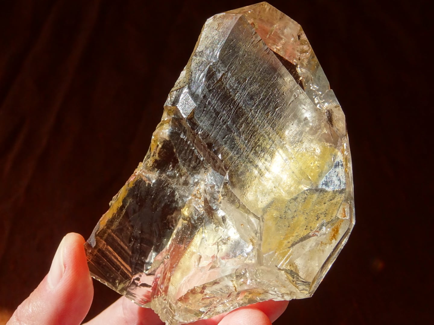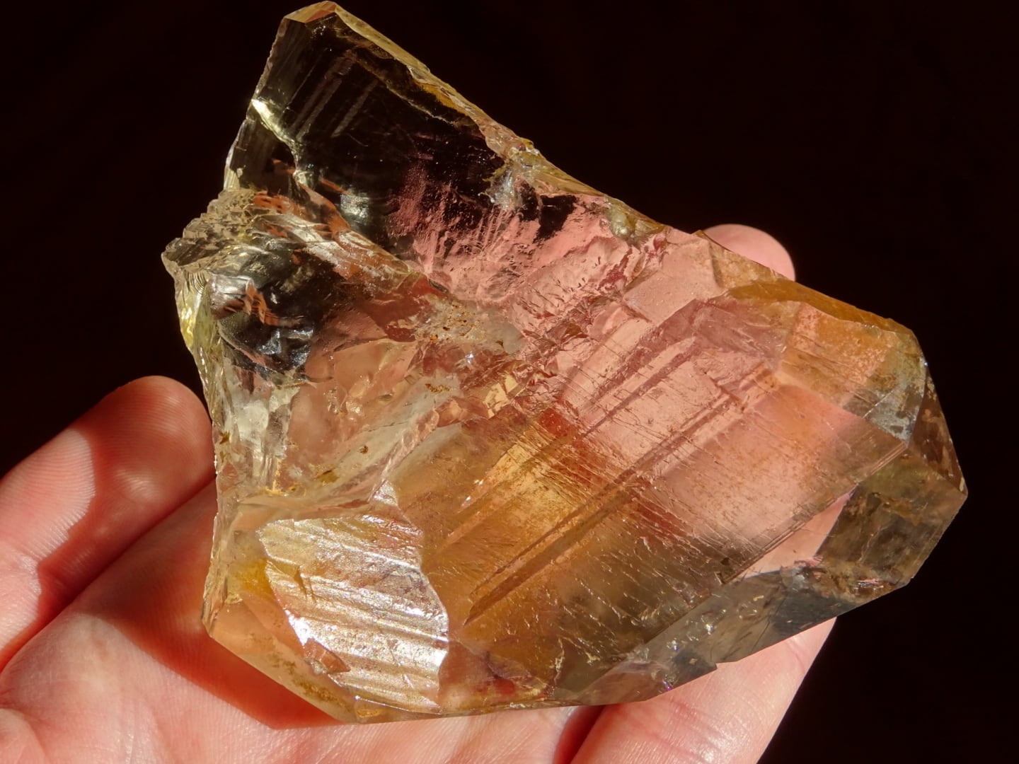 背面の剥離している面にリモナイト(鉄分)が付着していて、それがこの石をクリアなゴールドカラーに染めています。