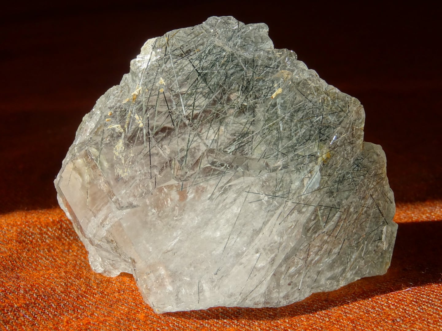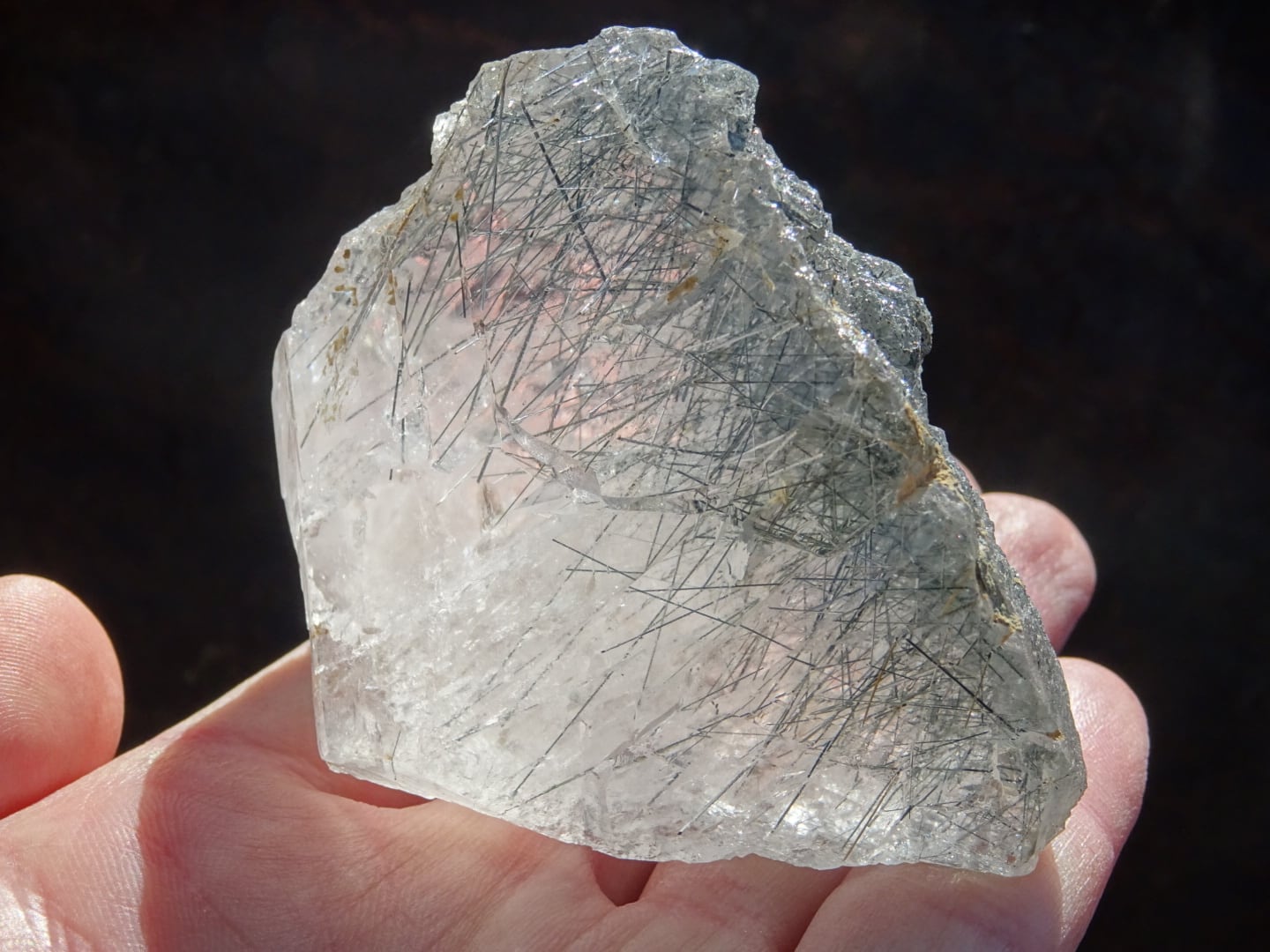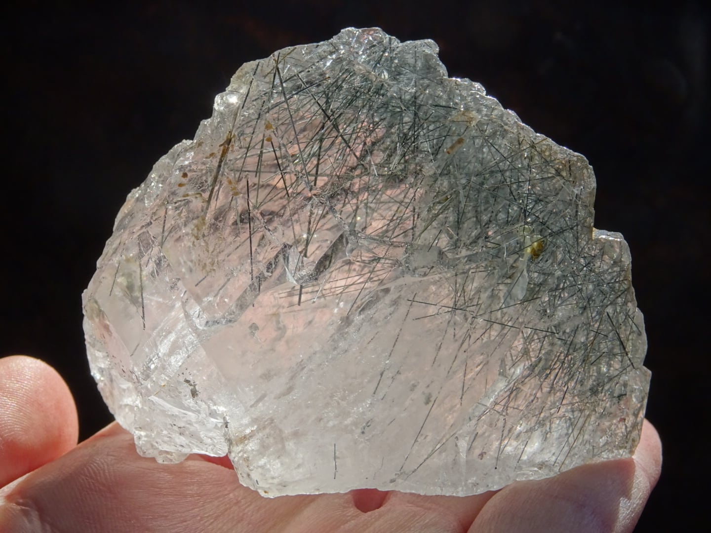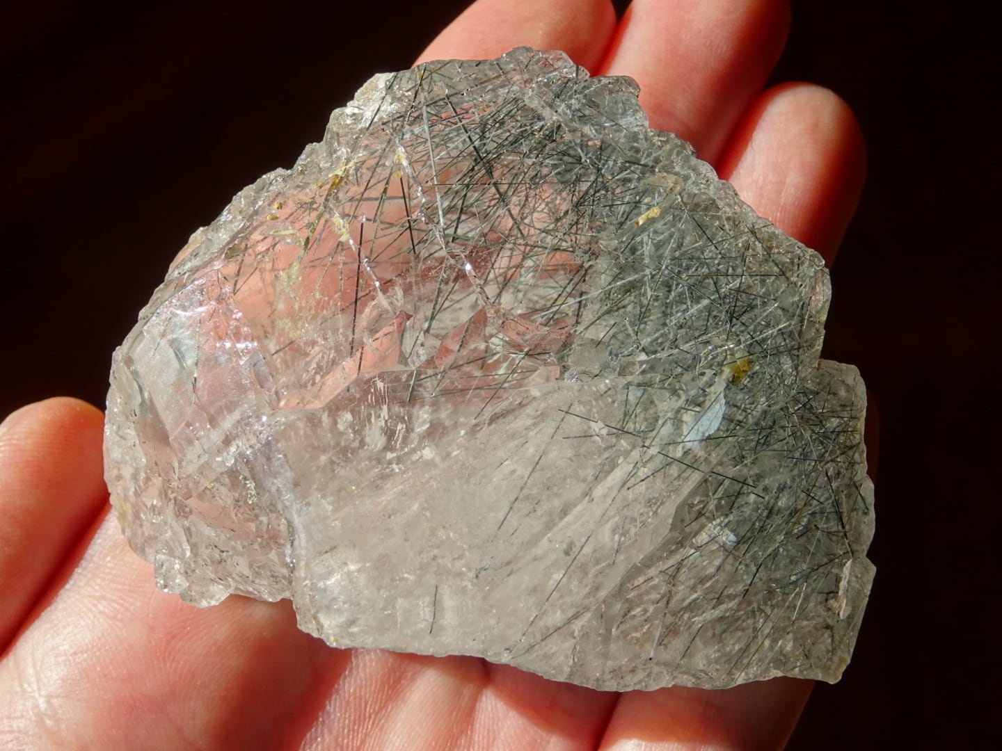 おそらくリーベカイトと思われますが、黒~青灰色の針をきりりとたくさん伸ばしていて。よく見るとゴールドのルチルも数本ばかり入っています。