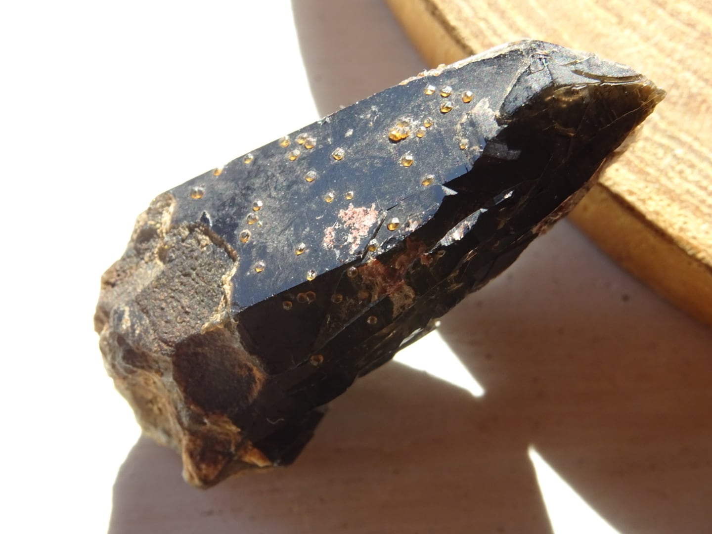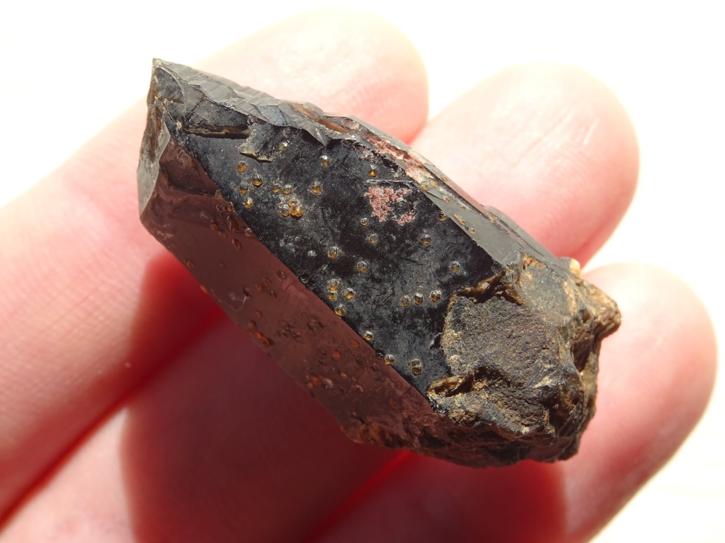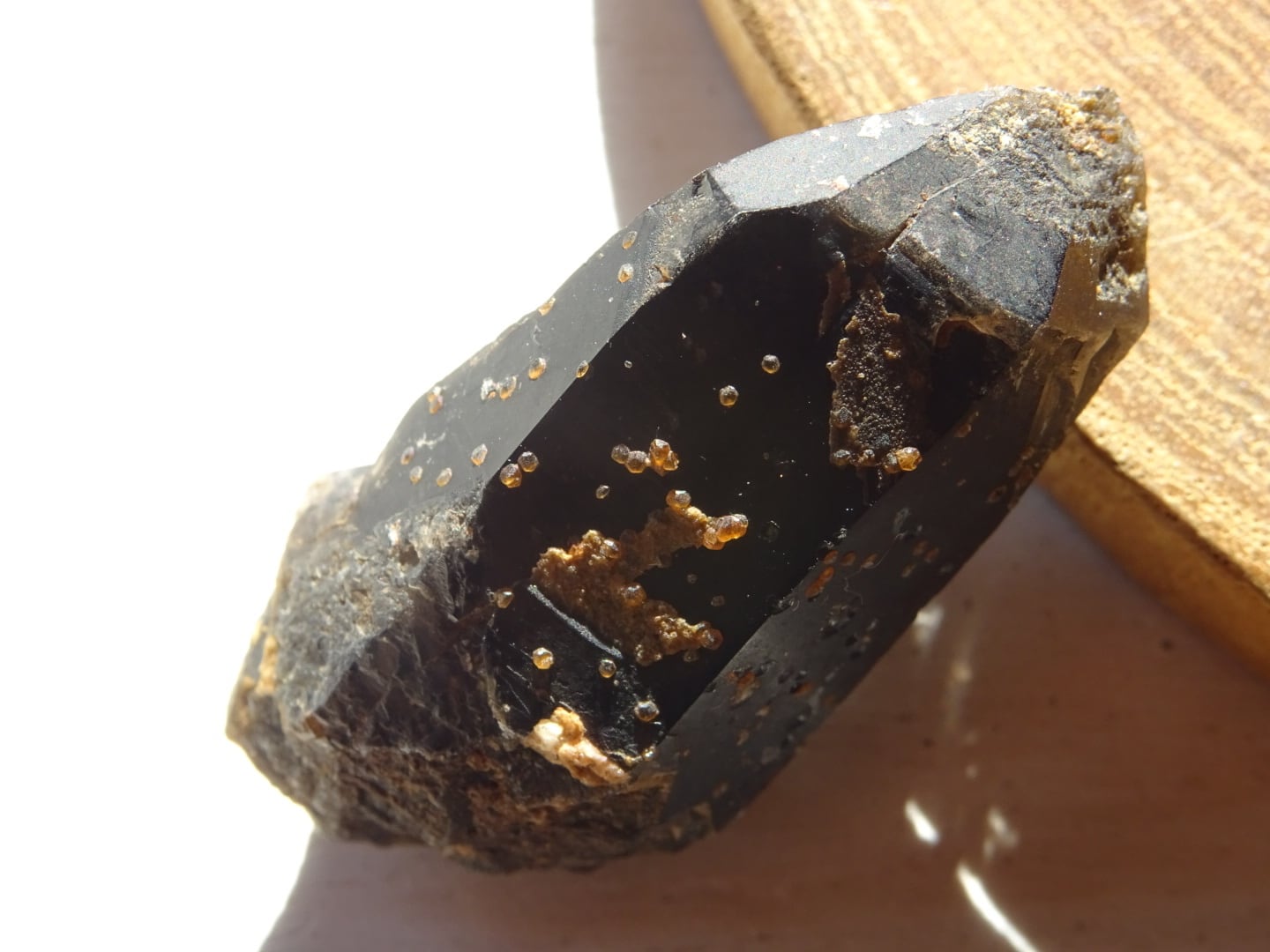 こちらは黒水晶にオレンジ・レッドのスペサルティンガーネットが粒状に共生している1点。