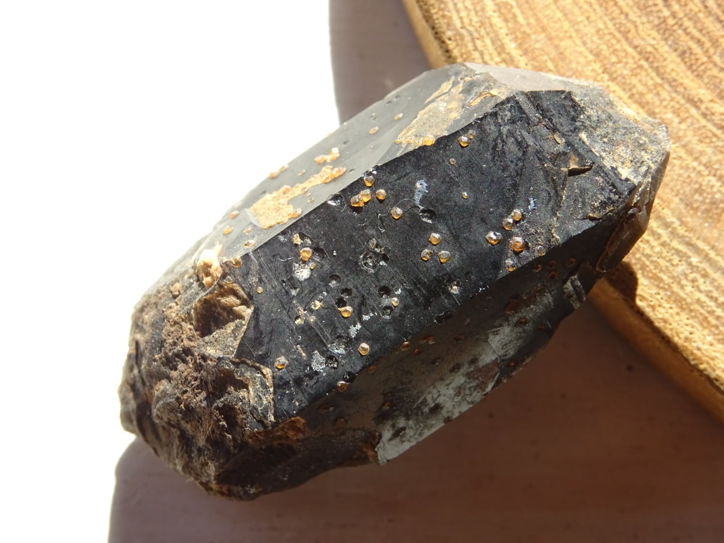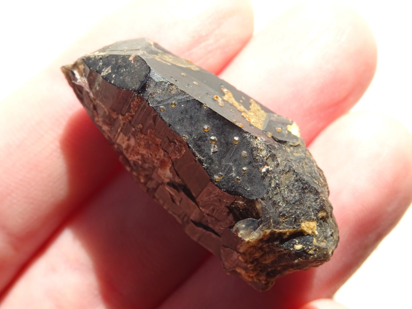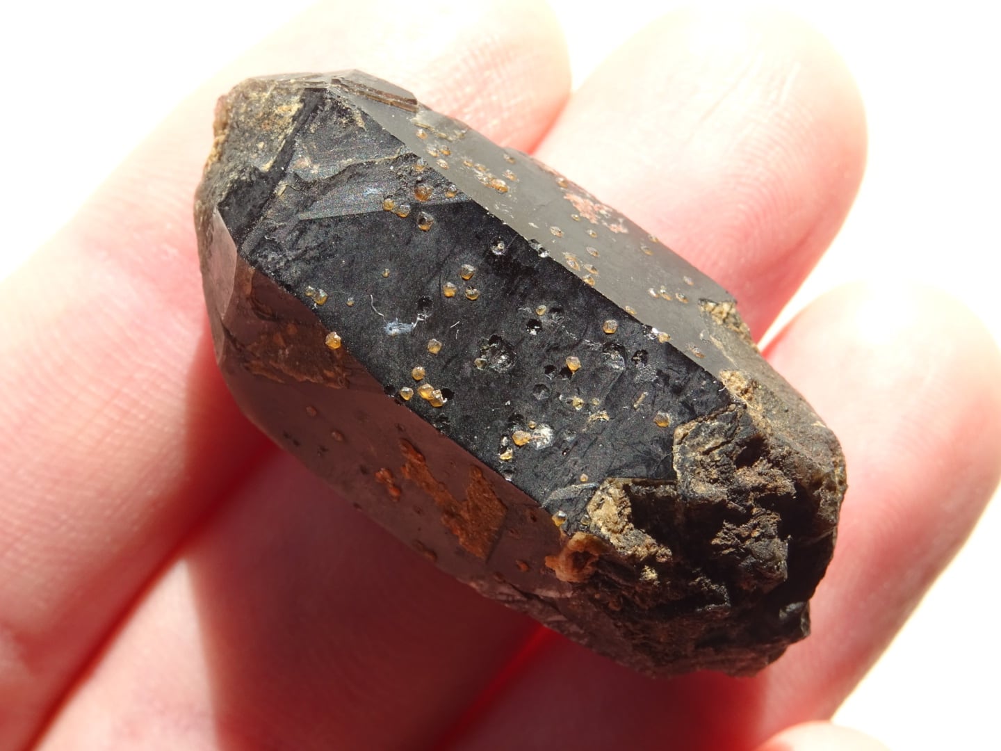 こちらは黒水晶にオレンジ・レッドのスペサルティンガーネットが粒状に共生している1点。