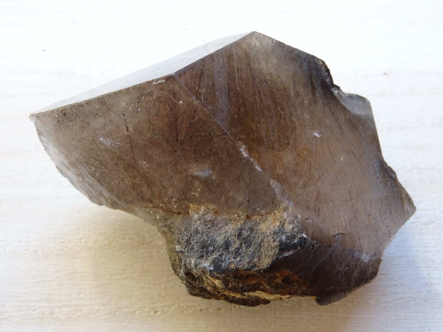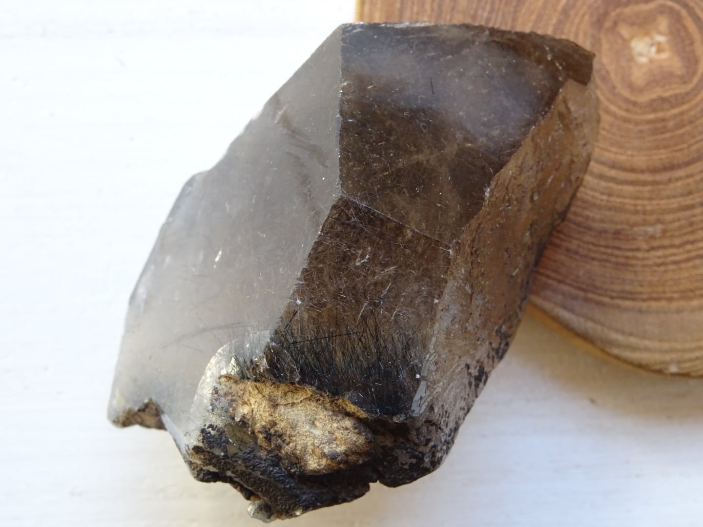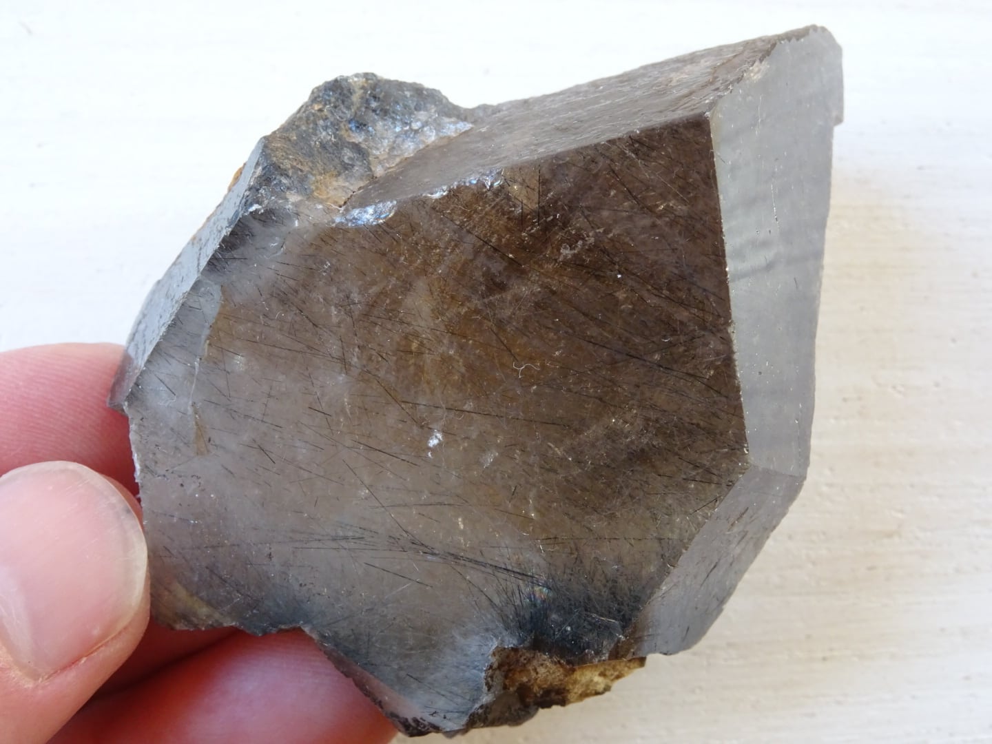 一部が薄っすらと青みがかって見えるのは、内包された針結晶(リーベカイト)ゆえ。