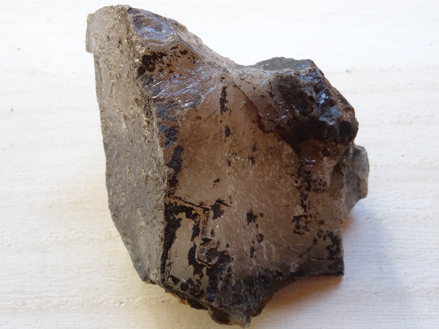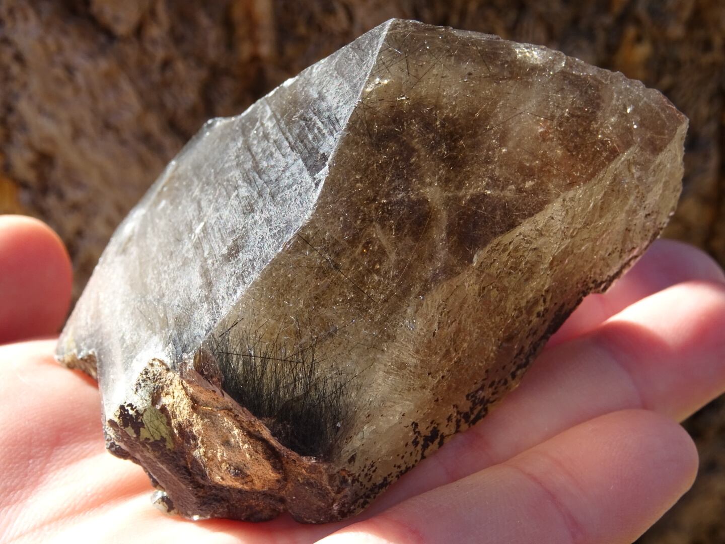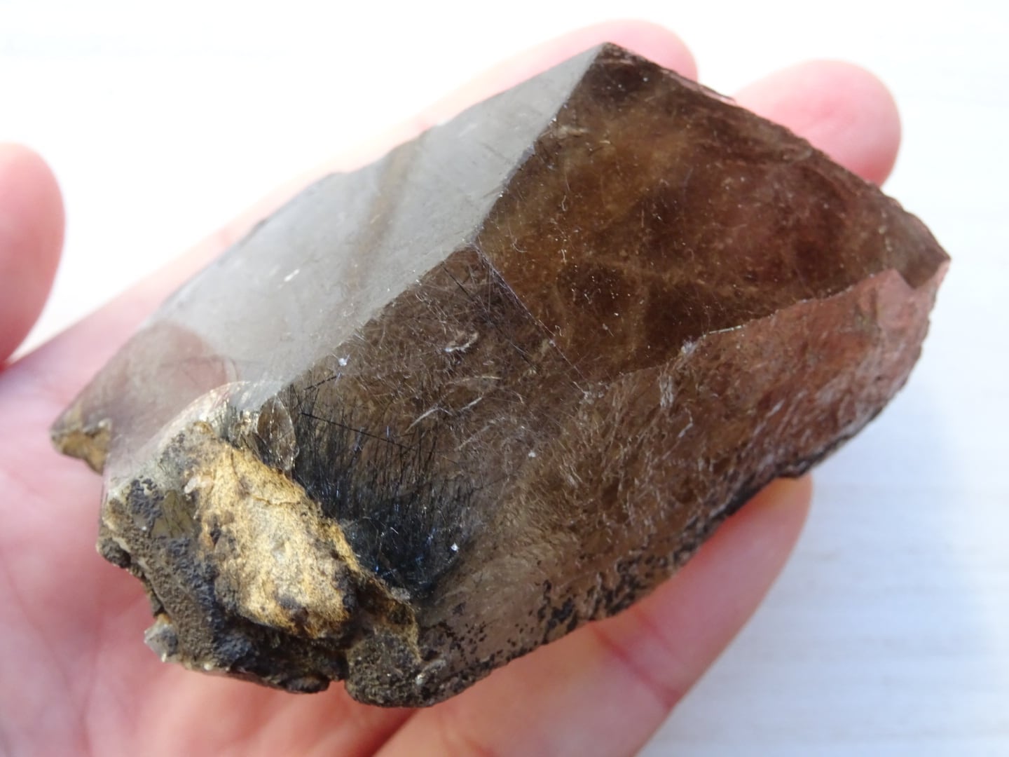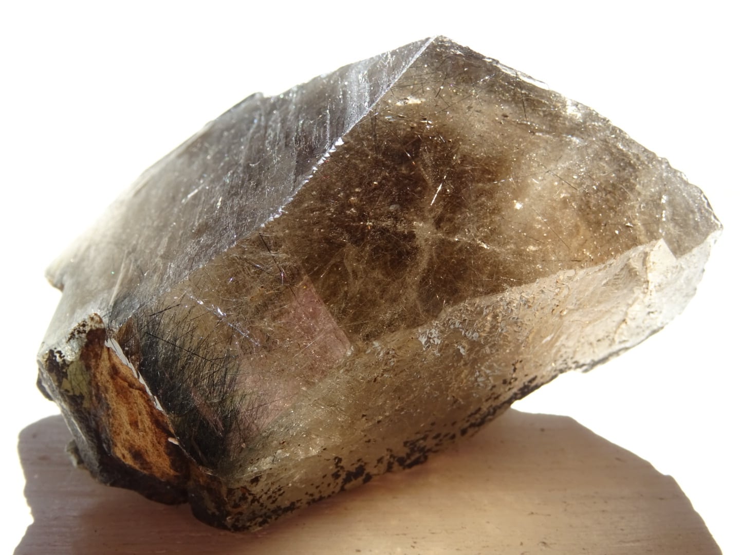 一部が薄っすらと青みがかって見えるのは、内包された針結晶(リーベカイト)ゆえ。