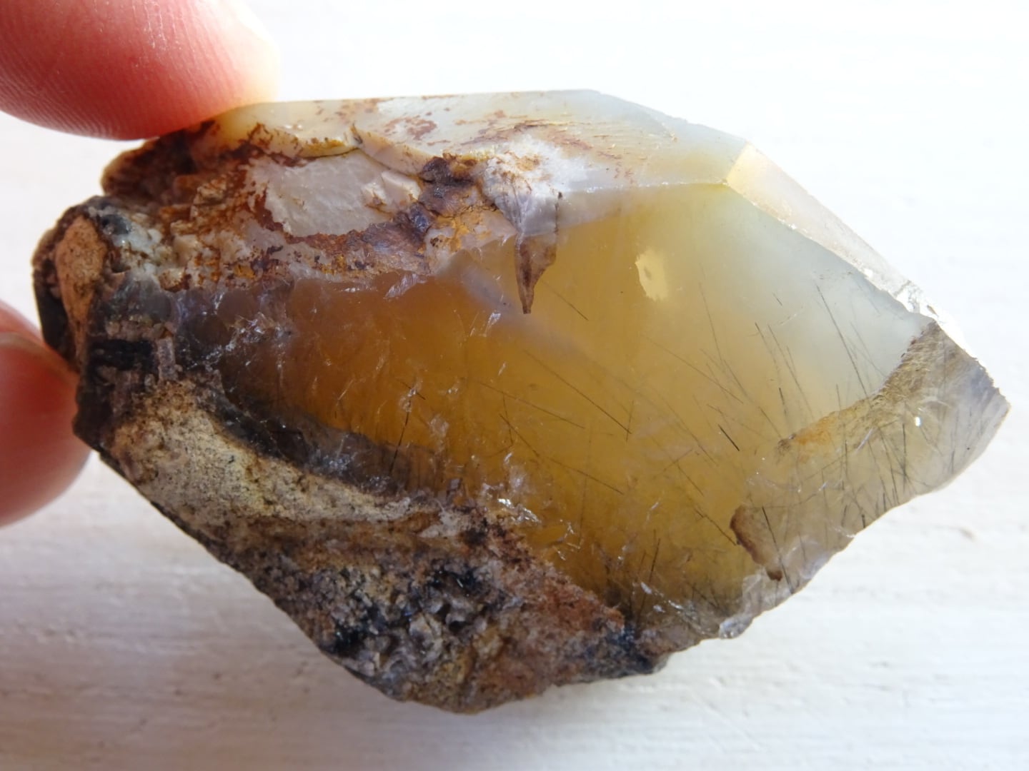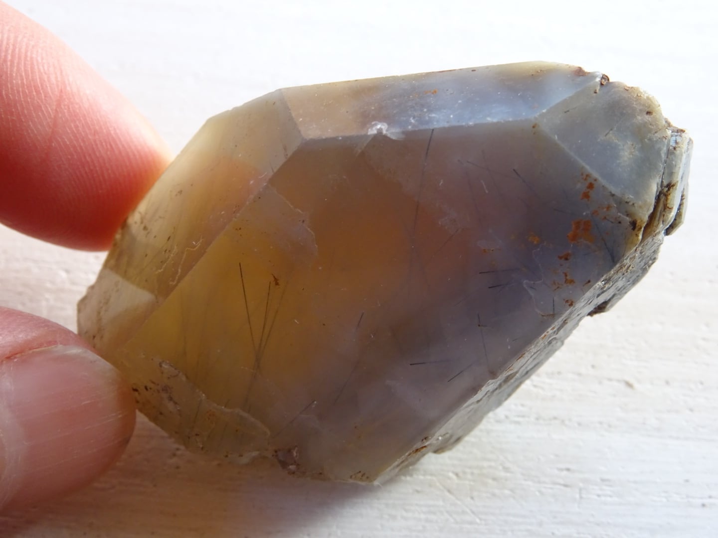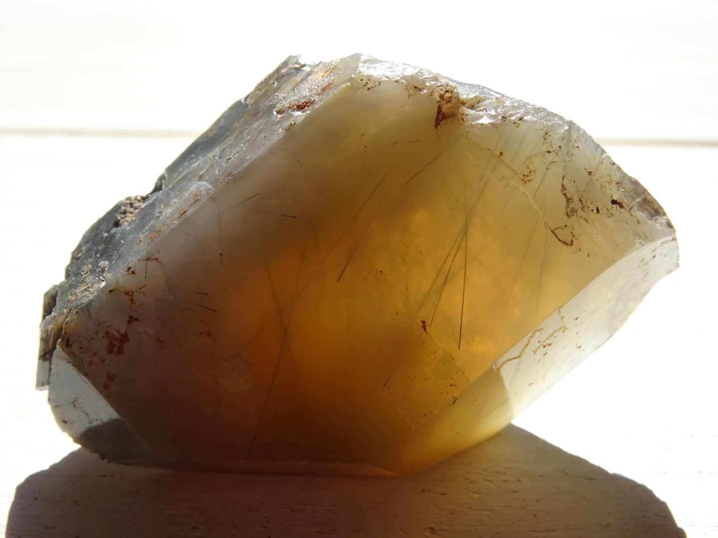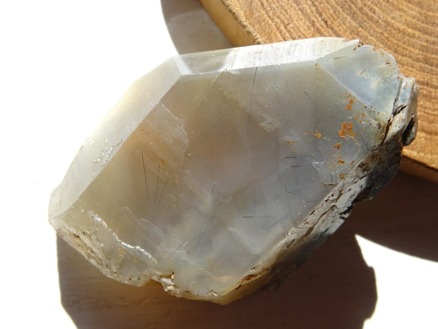 全体がリーベカイトによってクリーミーに青みがかっていて、美しい針たちを内包しています。