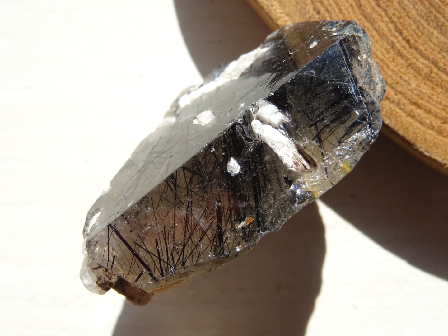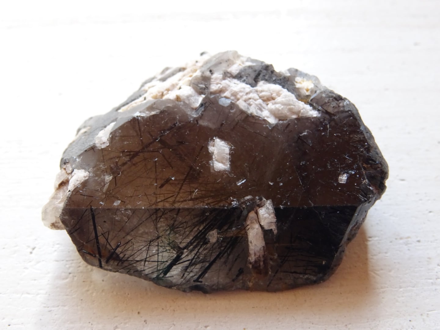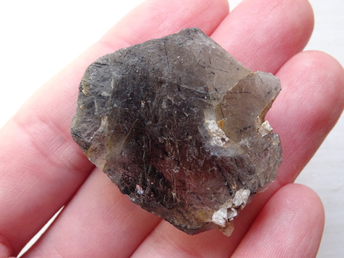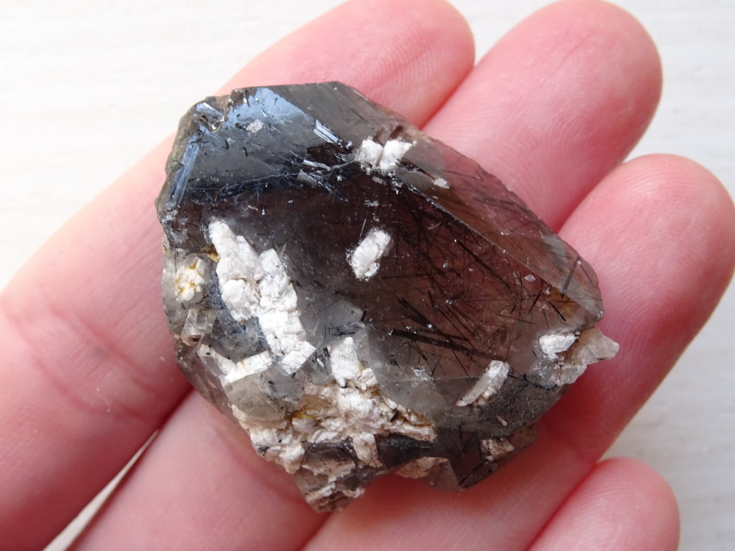 全体がスモーキーカラーになっているのですが、うっすらと青みがかっている部分もあることから、内包されている黒い針結晶はリーベカイトと思われます。