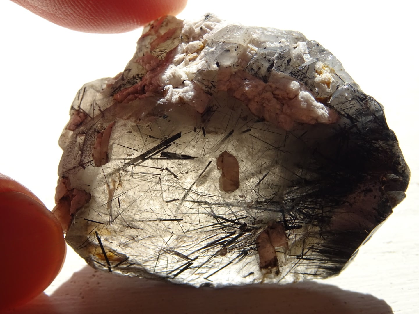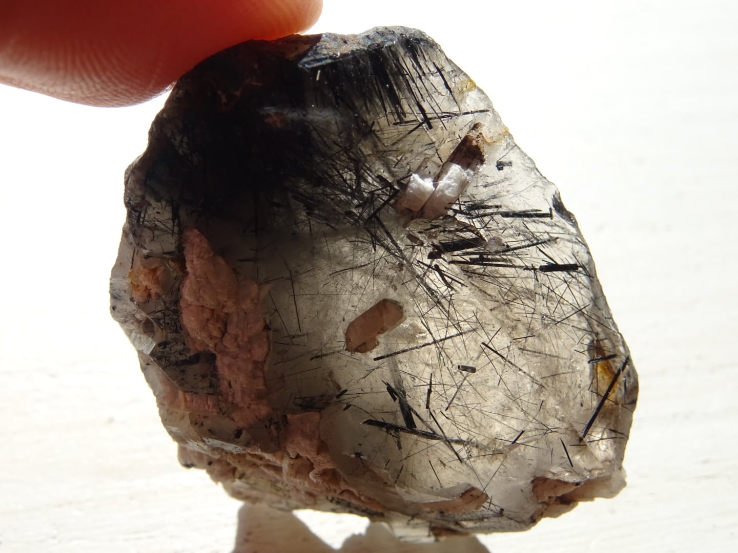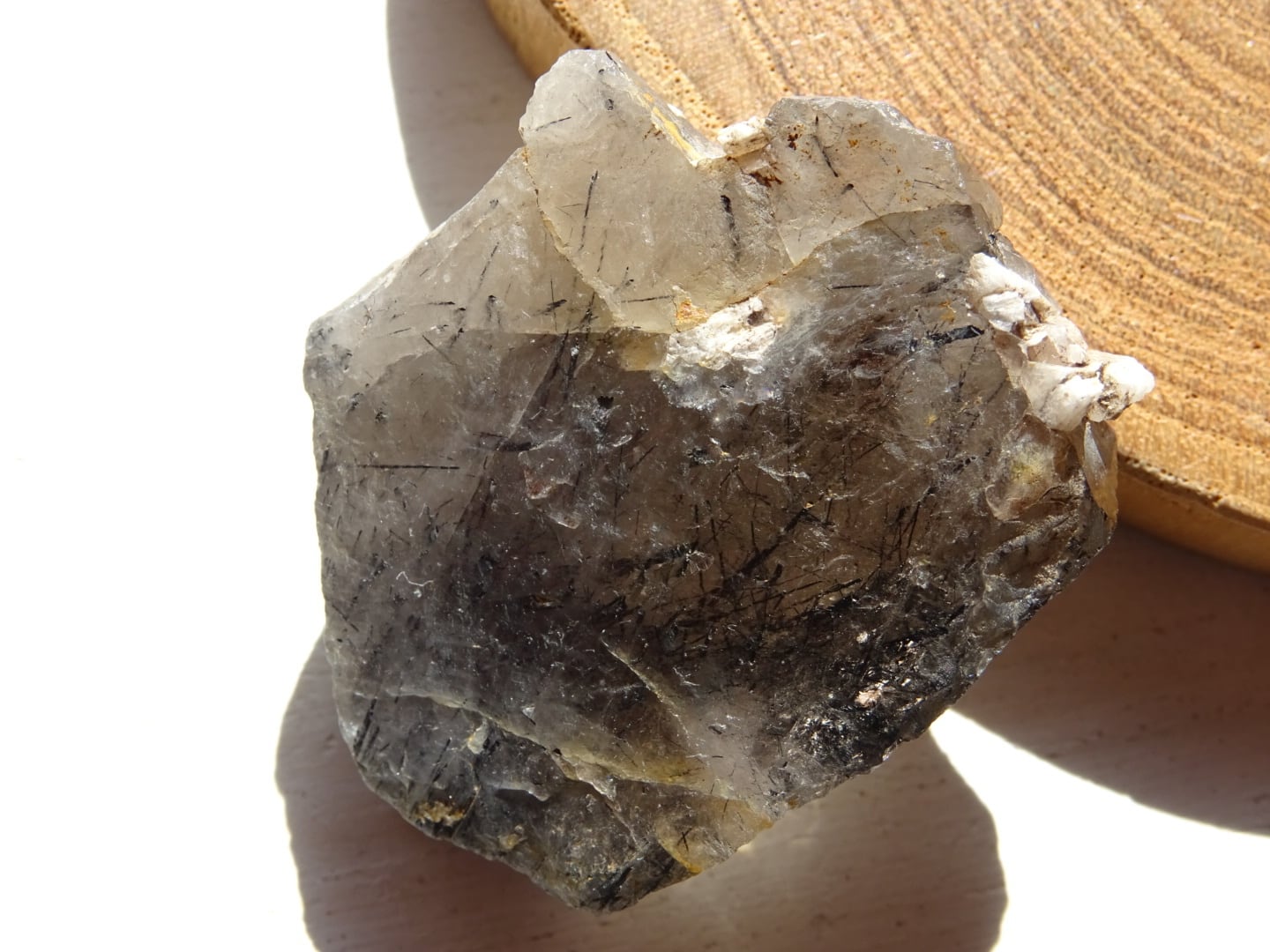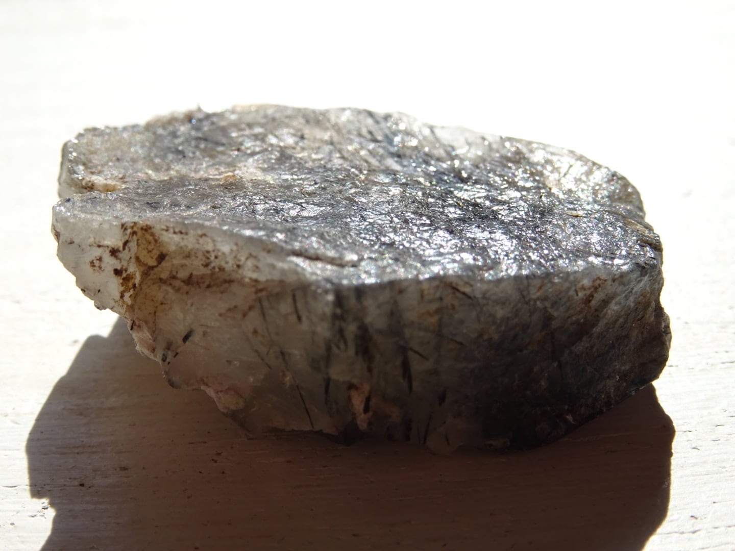 全体がスモーキーカラーになっているのですが、うっすらと青みがかっている部分もあることから、内包されている黒い針結晶はリーベカイトと思われます。