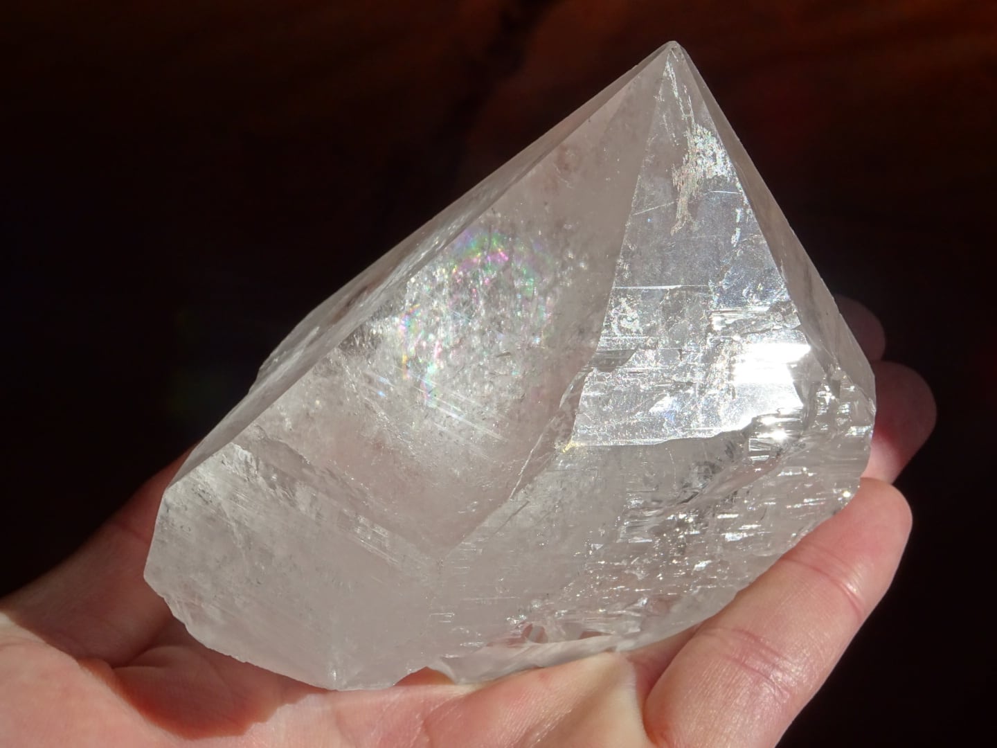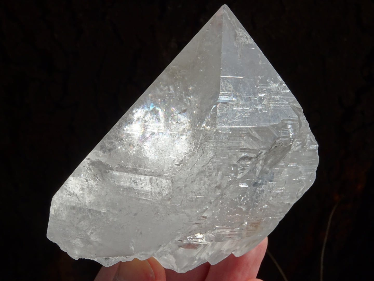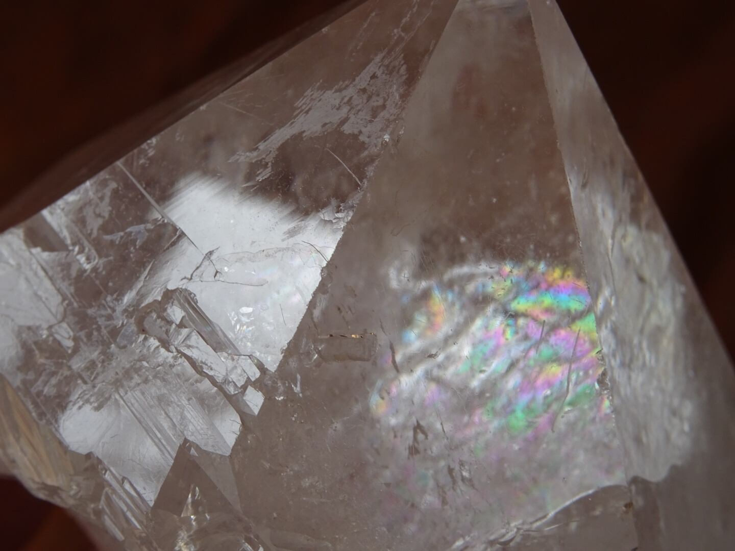 また、結晶の中部に綺麗に虹が出ているのと、根本のセルフヒールドしている部分にも虹が出ているのもポイントです。