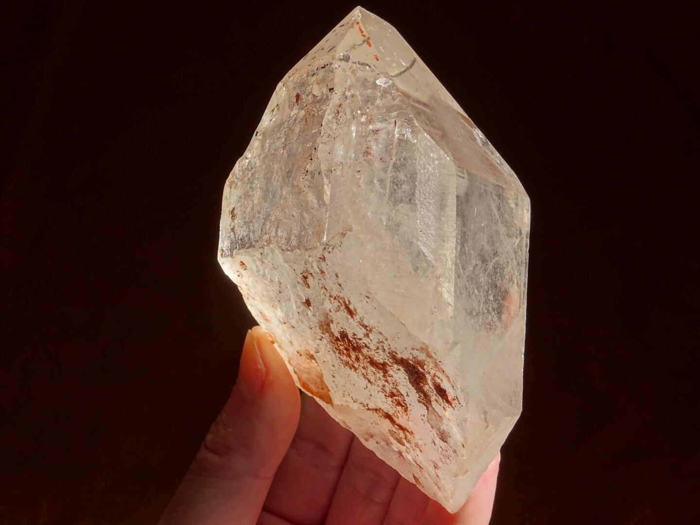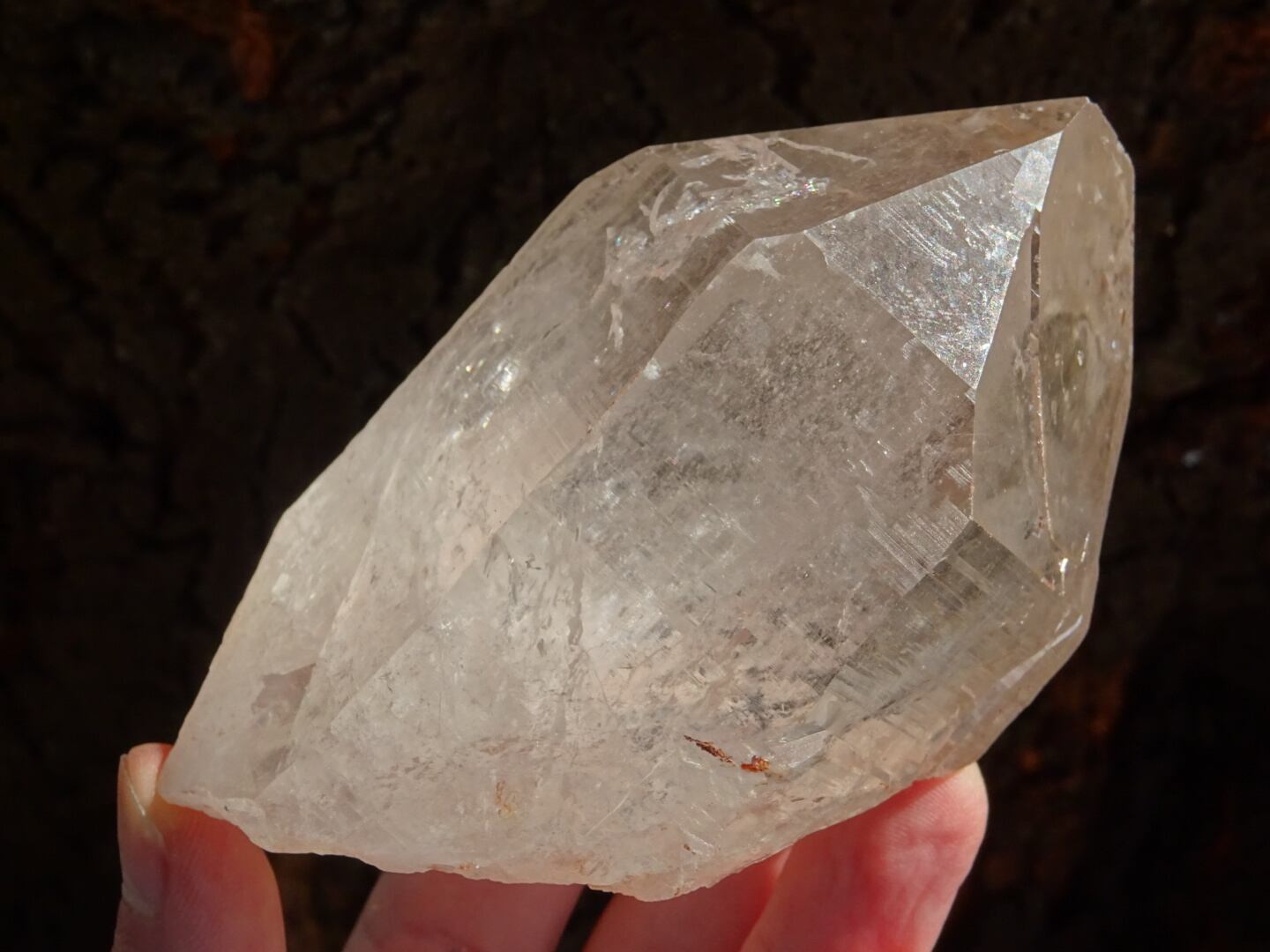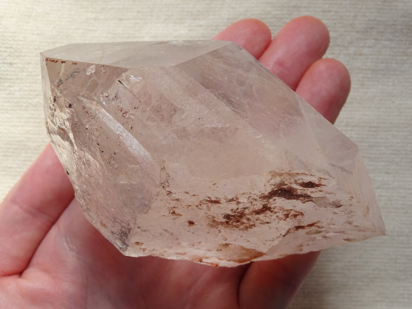 根本に付着している成分と、おそらく内側にヘマタイト(鉄分)を含んでいる影響でうっすらとピンクカラーになっています。