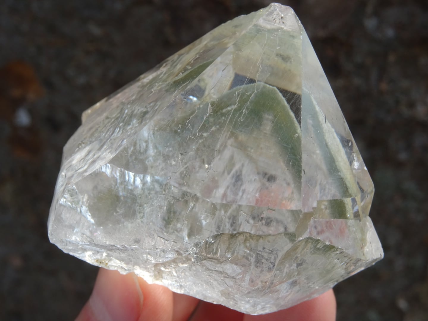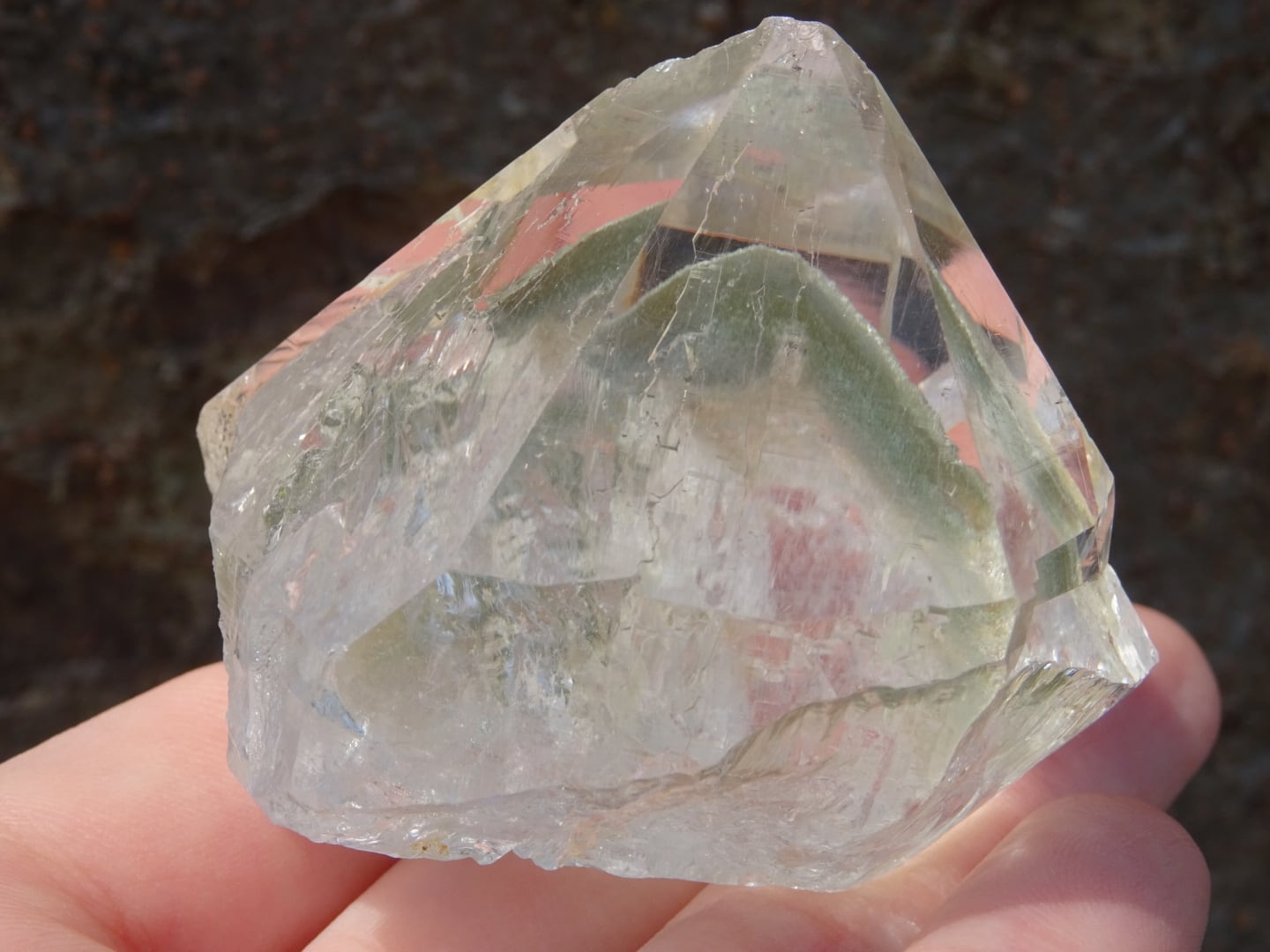 広く開けたファセット面の美しい結晶の内に、淡いGreenのクローライト(緑泥石)がファントム状に内包されていて、とても幻想的。キチンと自立もしてくれます。