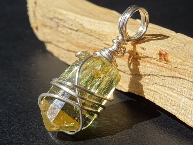 見ていると元気をわけてもらえそうに明るいイエローが美しい、「フローアパタイト」のペンダントトップ。