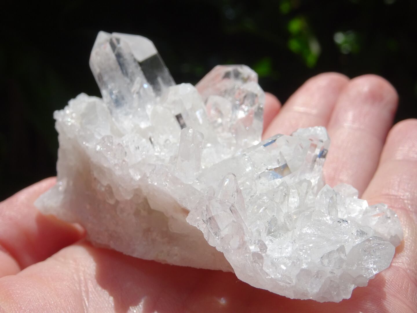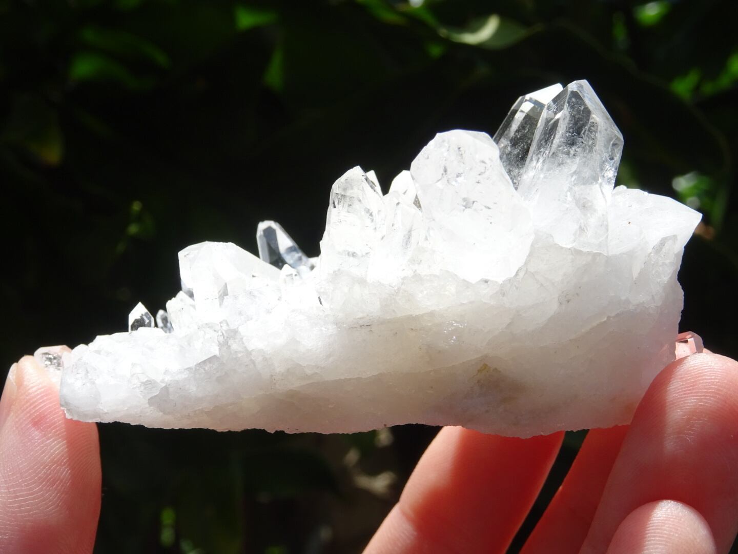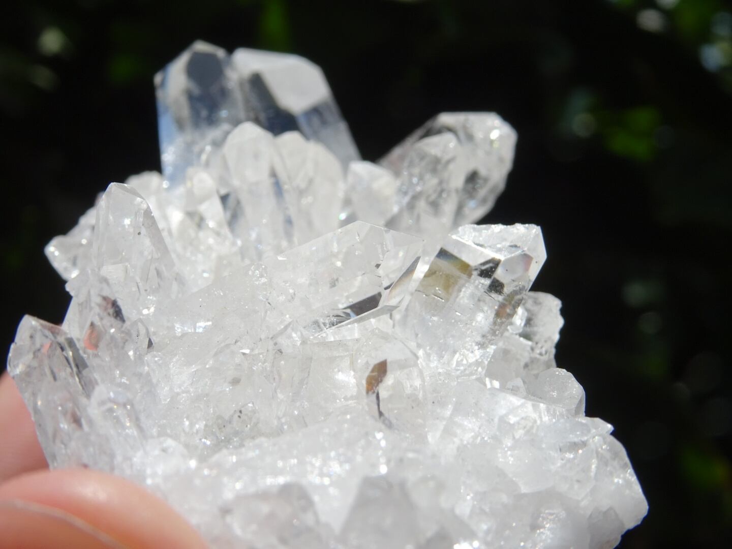 よく見るとクラスターの中にまるで「クレバス」のような細長の溝があったり、側面の結晶にとても小さな洞窟のように隙間があったり、結晶のひとつに虹を発見したりと、クラスターは細かい部分の観察に発見があって面白いです。ジオードなどもそうですが、クラスターはどれも「小さな世界」を内包していて素敵。