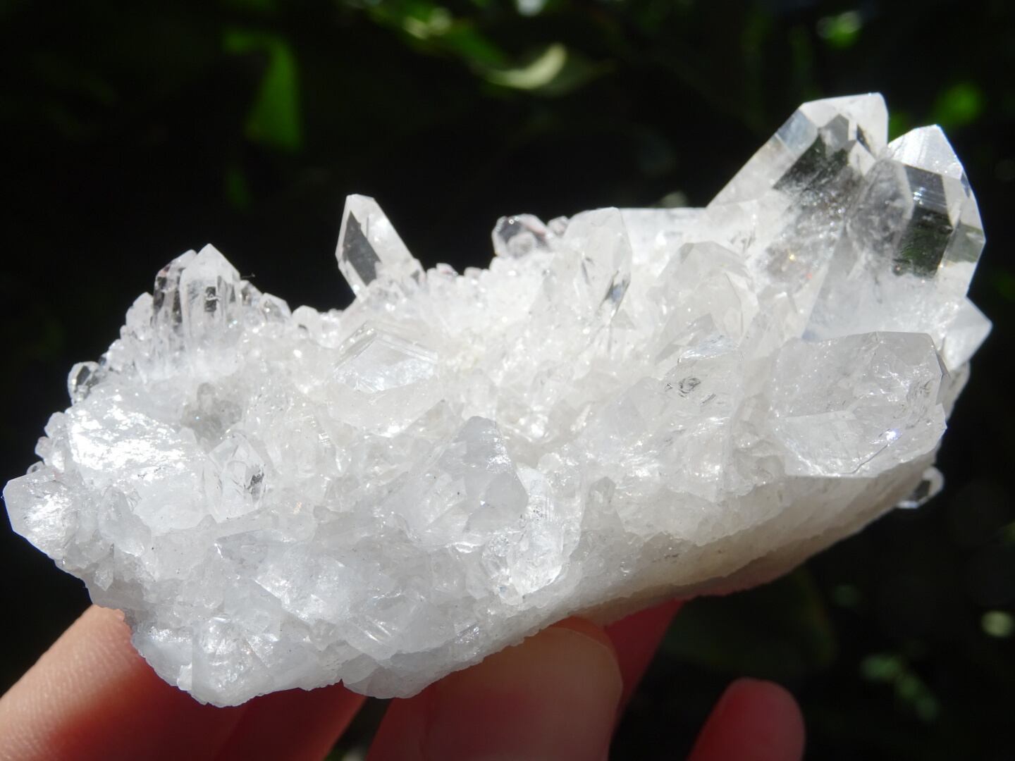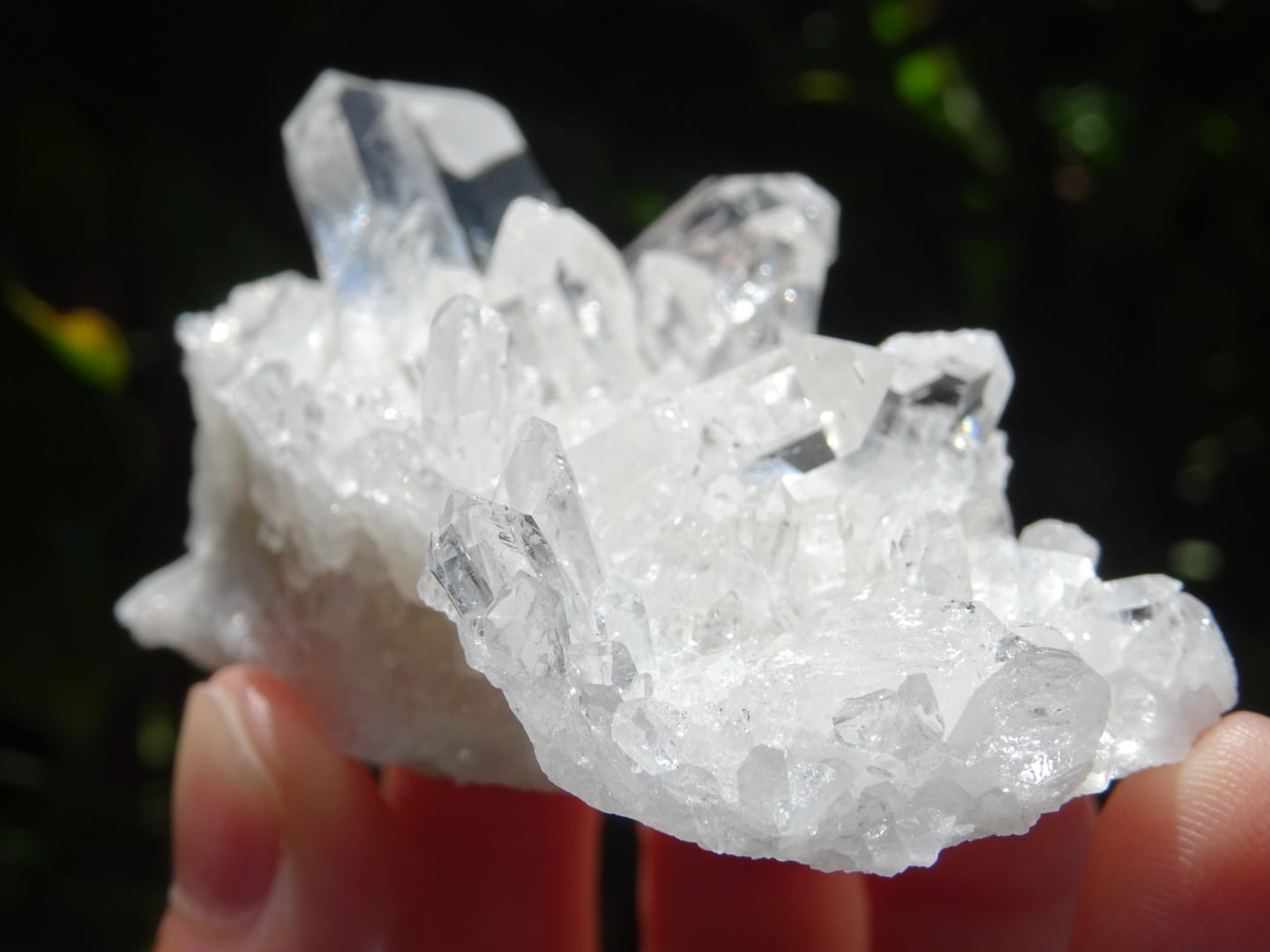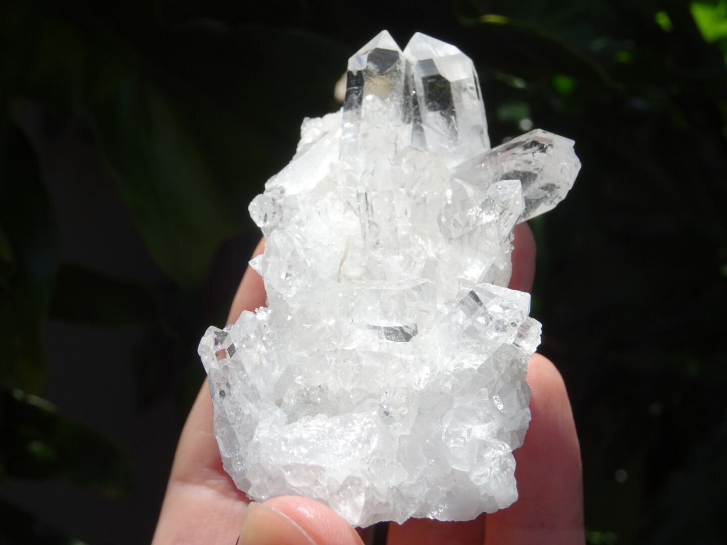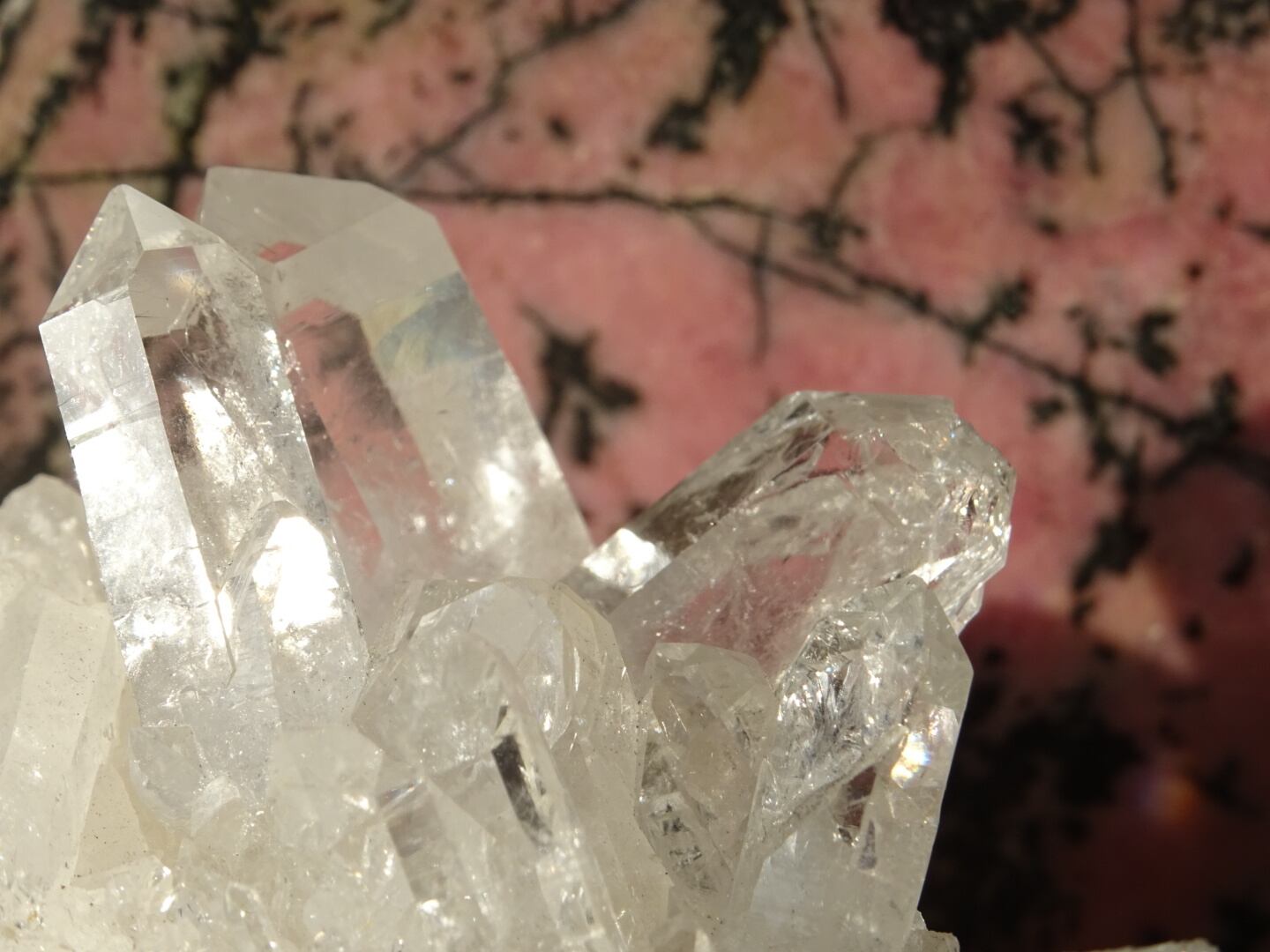 よく見るとクラスターの中にまるで「クレバス」のような細長の溝があったり、側面の結晶にとても小さな洞窟のように隙間があったり、結晶のひとつに虹を発見したりと、クラスターは細かい部分の観察に発見があって面白いです。ジオードなどもそうですが、クラスターはどれも「小さな世界」を内包していて素敵。