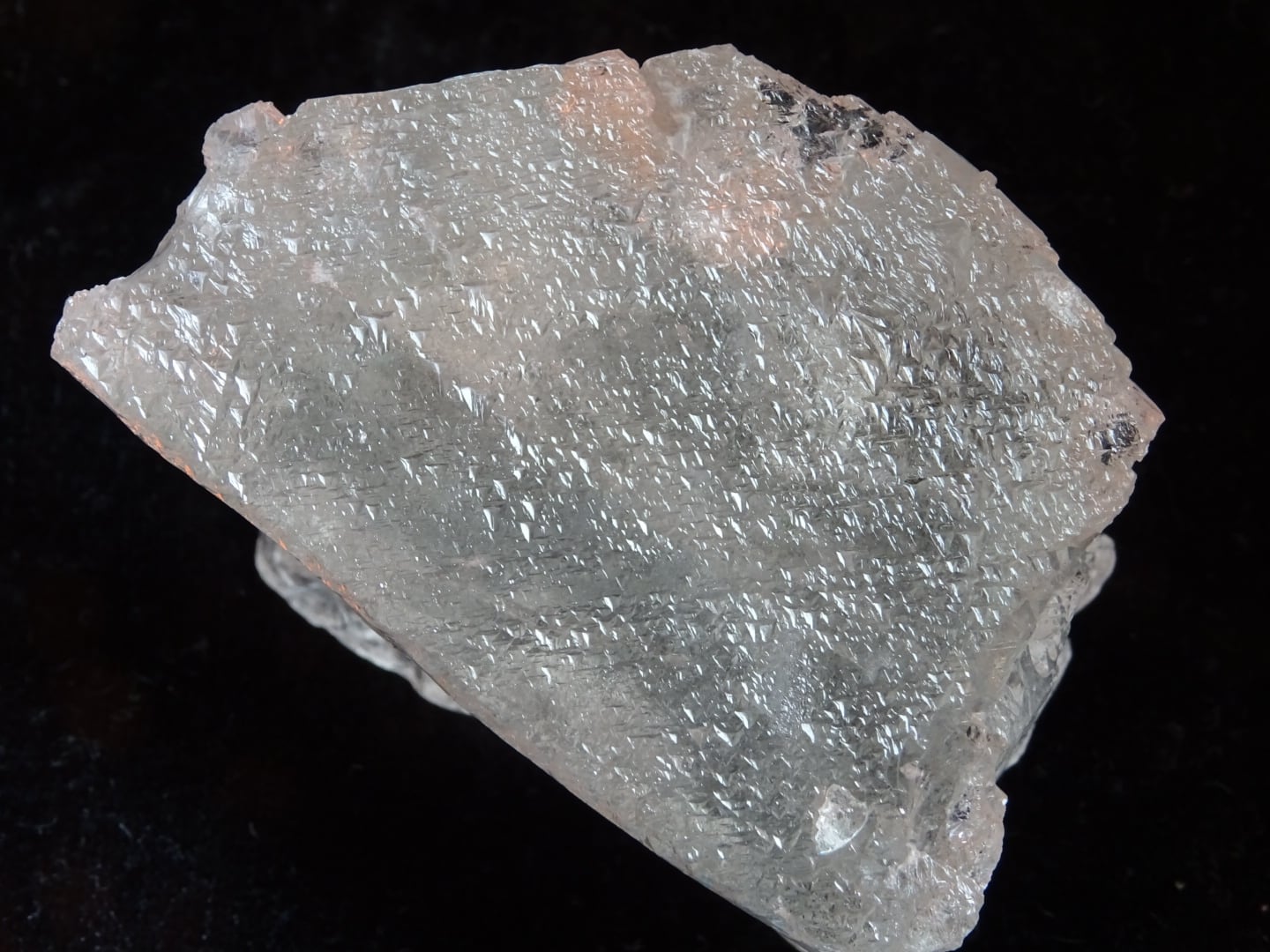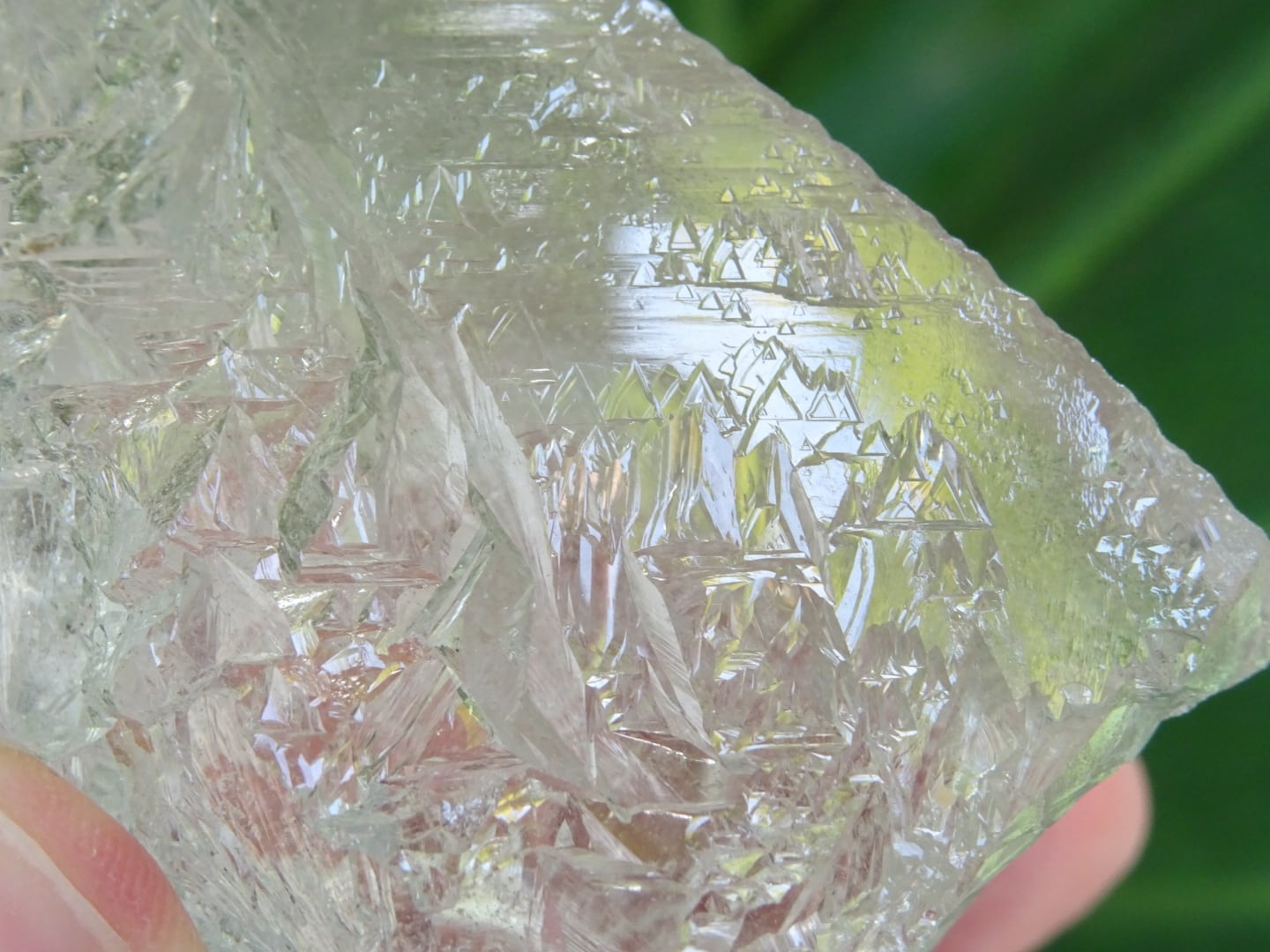 また、平な面に隆起することなく連なっている三角形状の結晶たちはやはりそのほとんどが溶かされてそうなったものか、またはそこから浅く再結晶したものと思われます。本当によく観察していくと、その向きとは逆方向の小さな▽のキーたちも見られ、この石全体のおびただしいトライゴーニックのパワーを強く感じます。