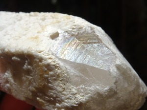 唯一クリスタルが露出している根元部分は不思議とうすい虹色になっており、ファセットはよく見ると蝕像(エッチング)を受けたような浅い刻みや窪みも見られます。