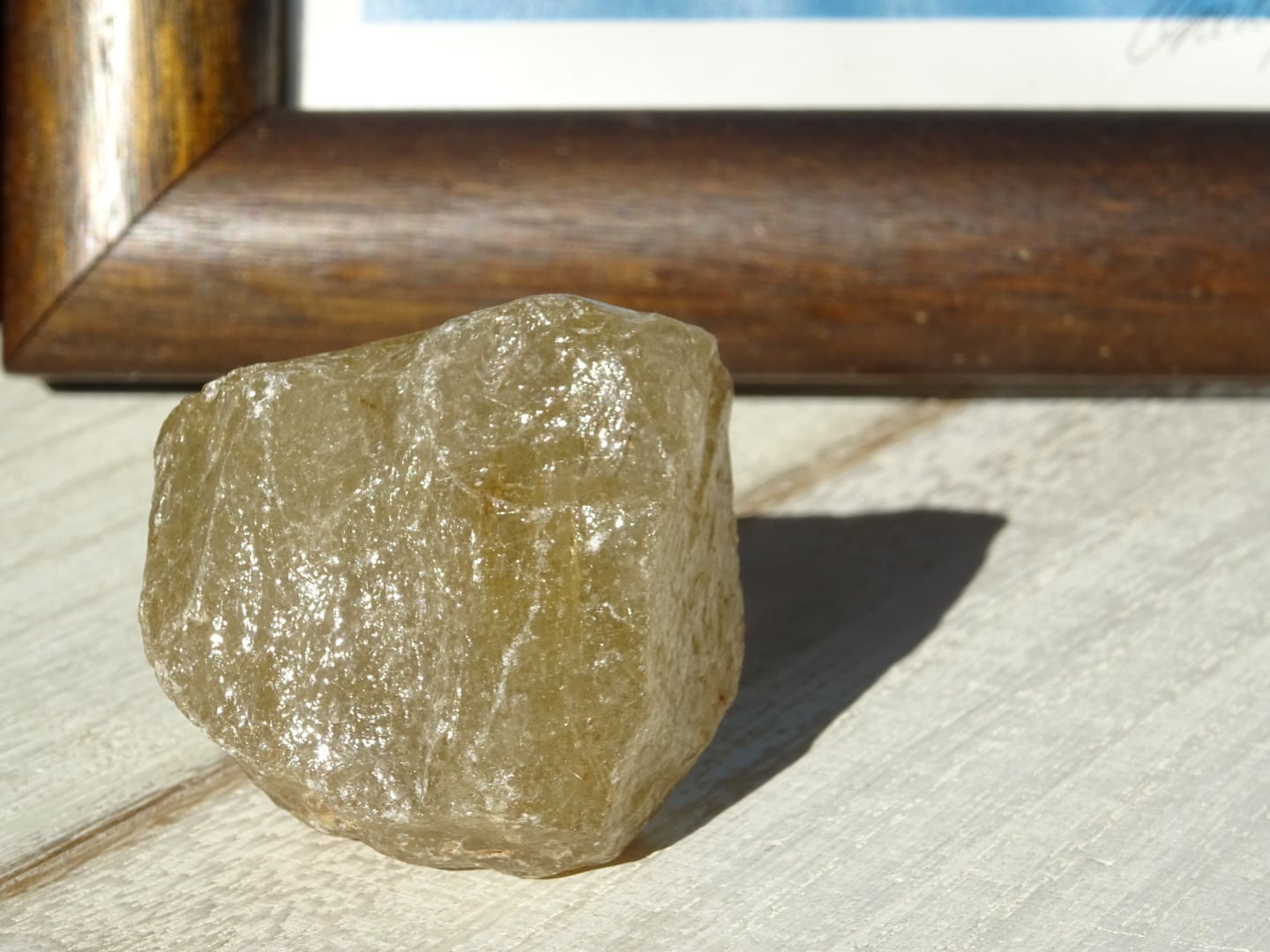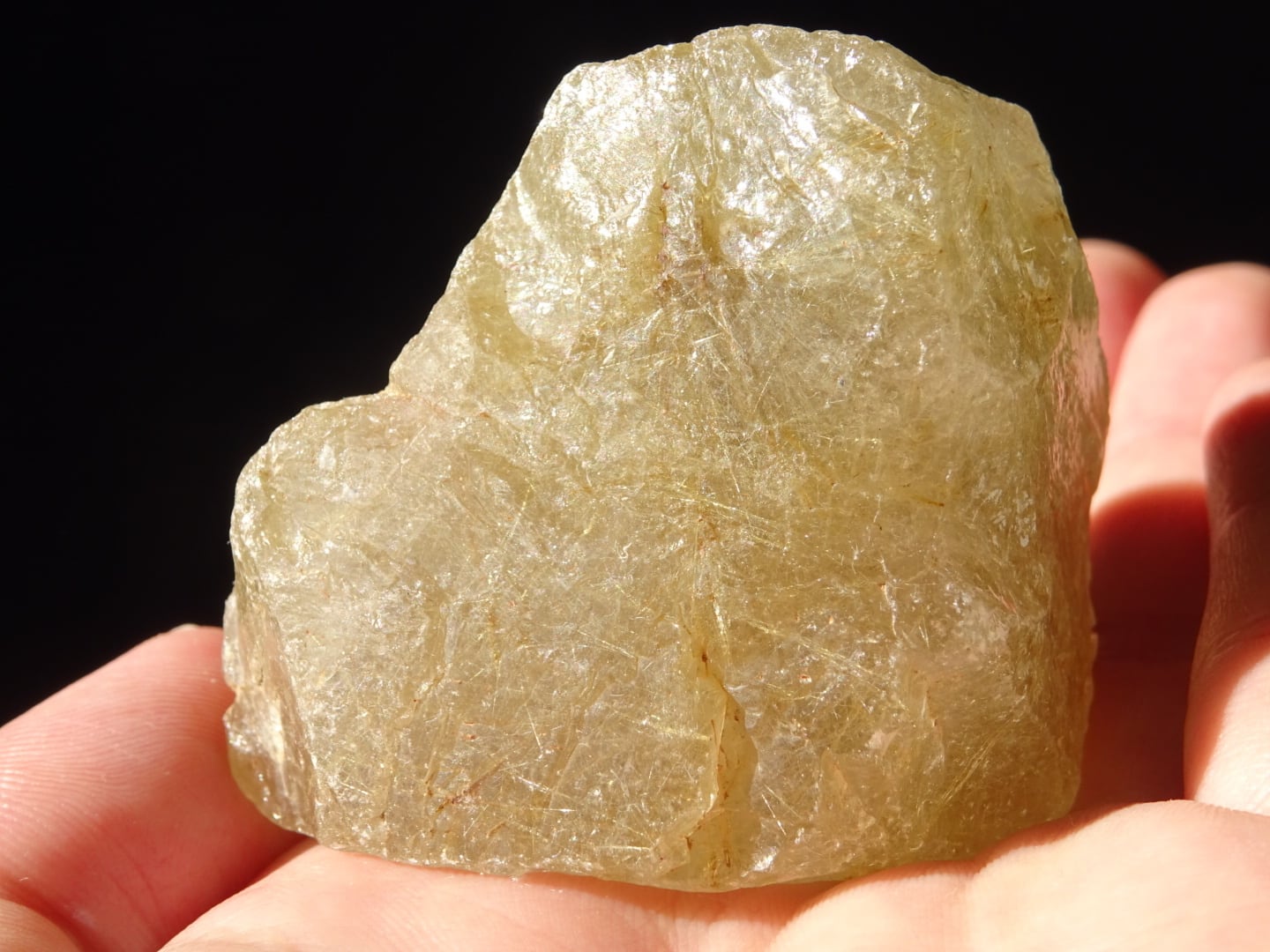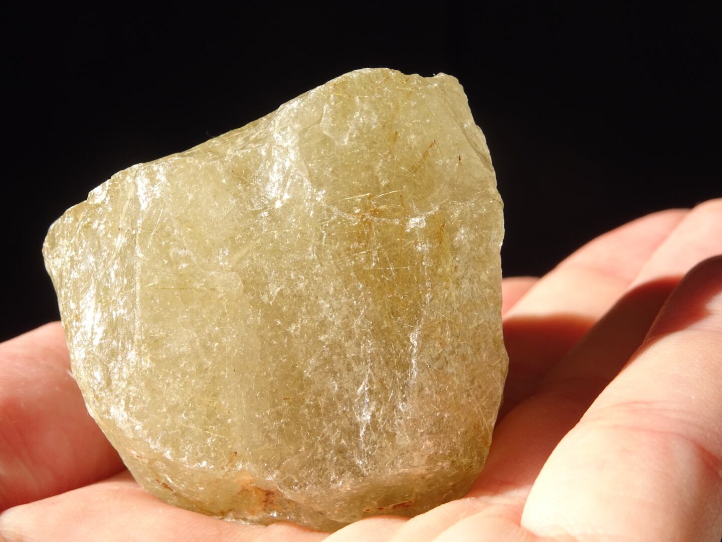 黄緑色の石肌にゴールドのルチルを広げた、パワフルなラフ原石。