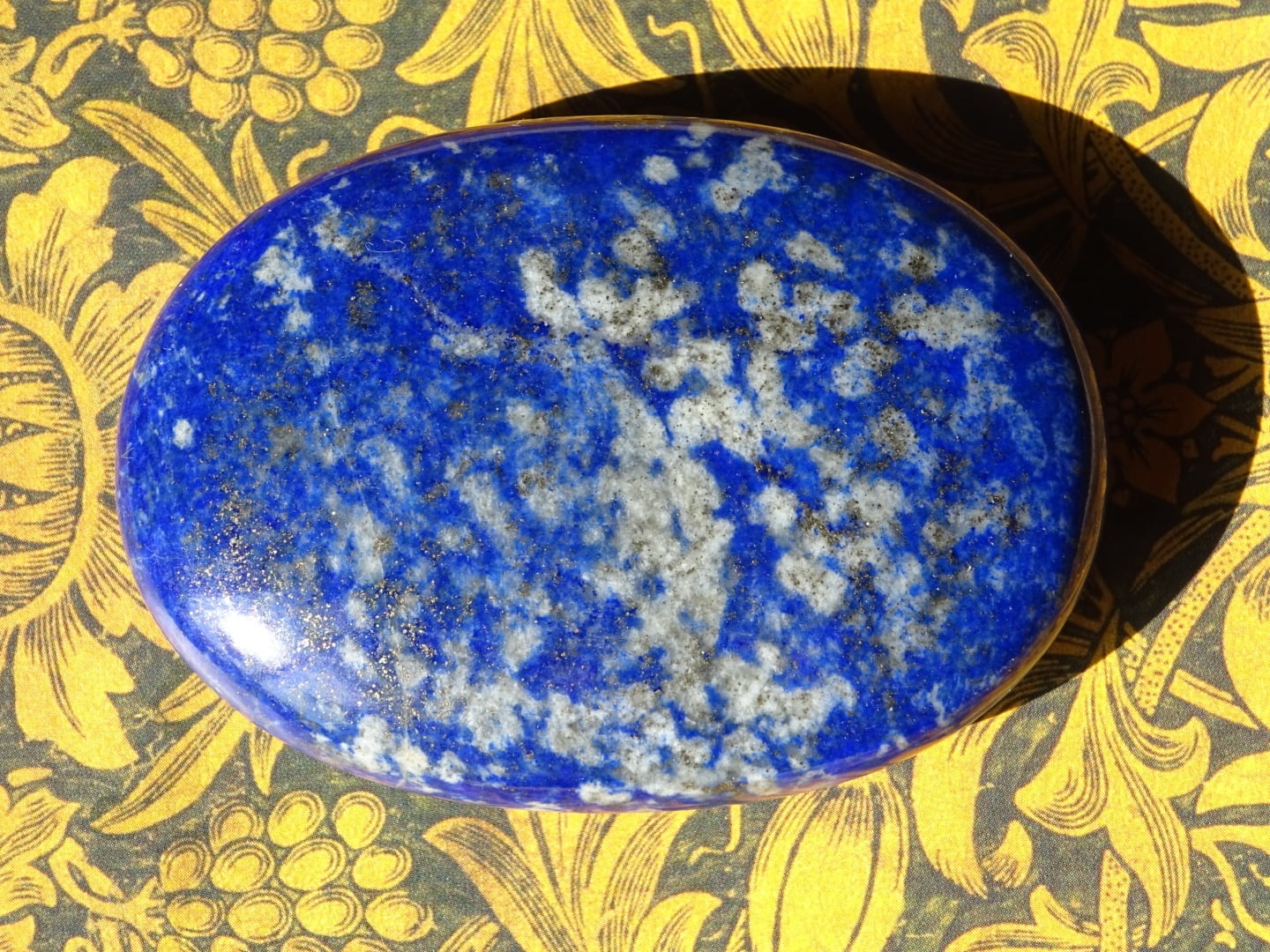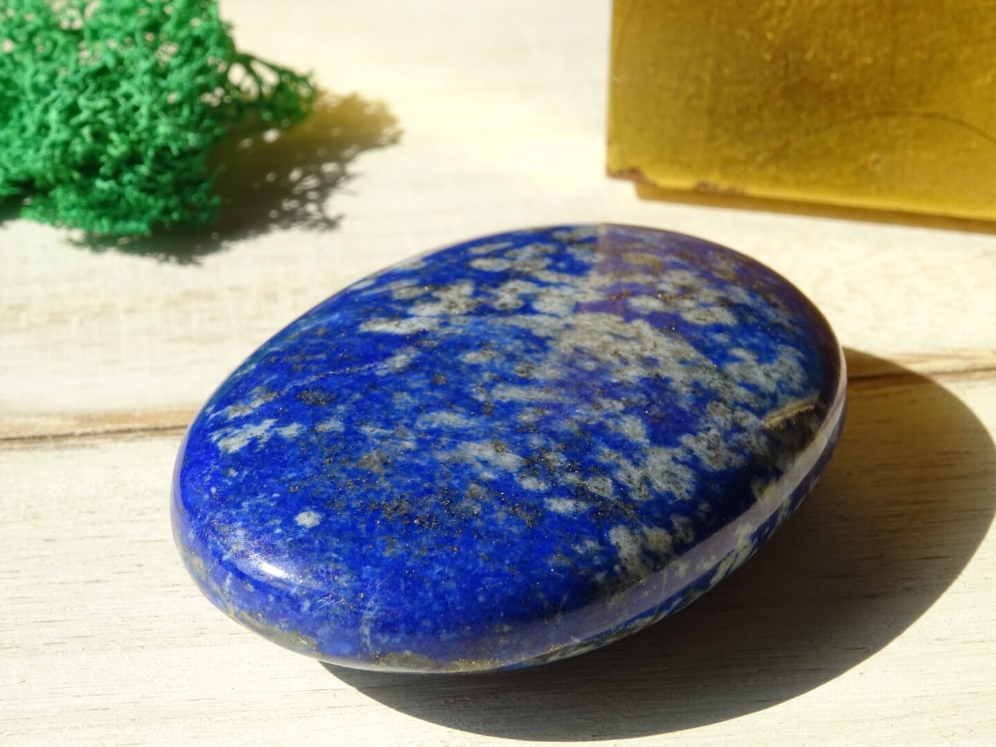 もう片面はラピスブルーの地色はそのままなのですが、ちょっとむせかえるほどにパイライトのゴールド粒子たちが散りばめられています(笑)それゆえ片面はより鮮やかではっきりしたブルー、もう一方は渋い金色の成分がとても多め、という印象。