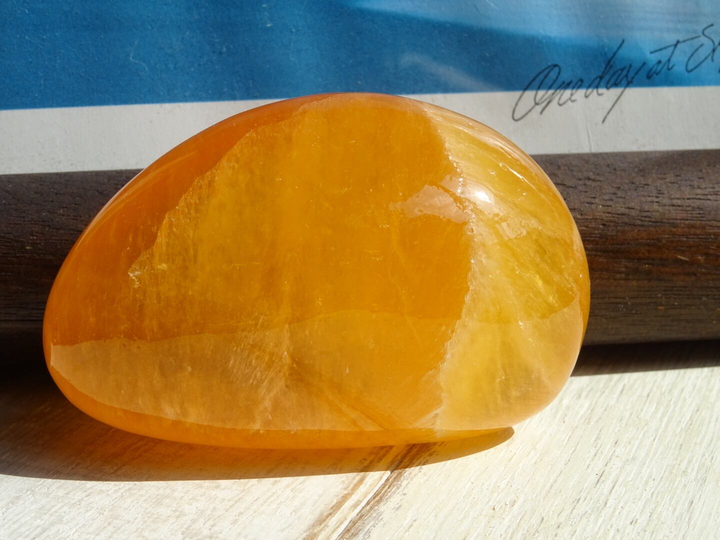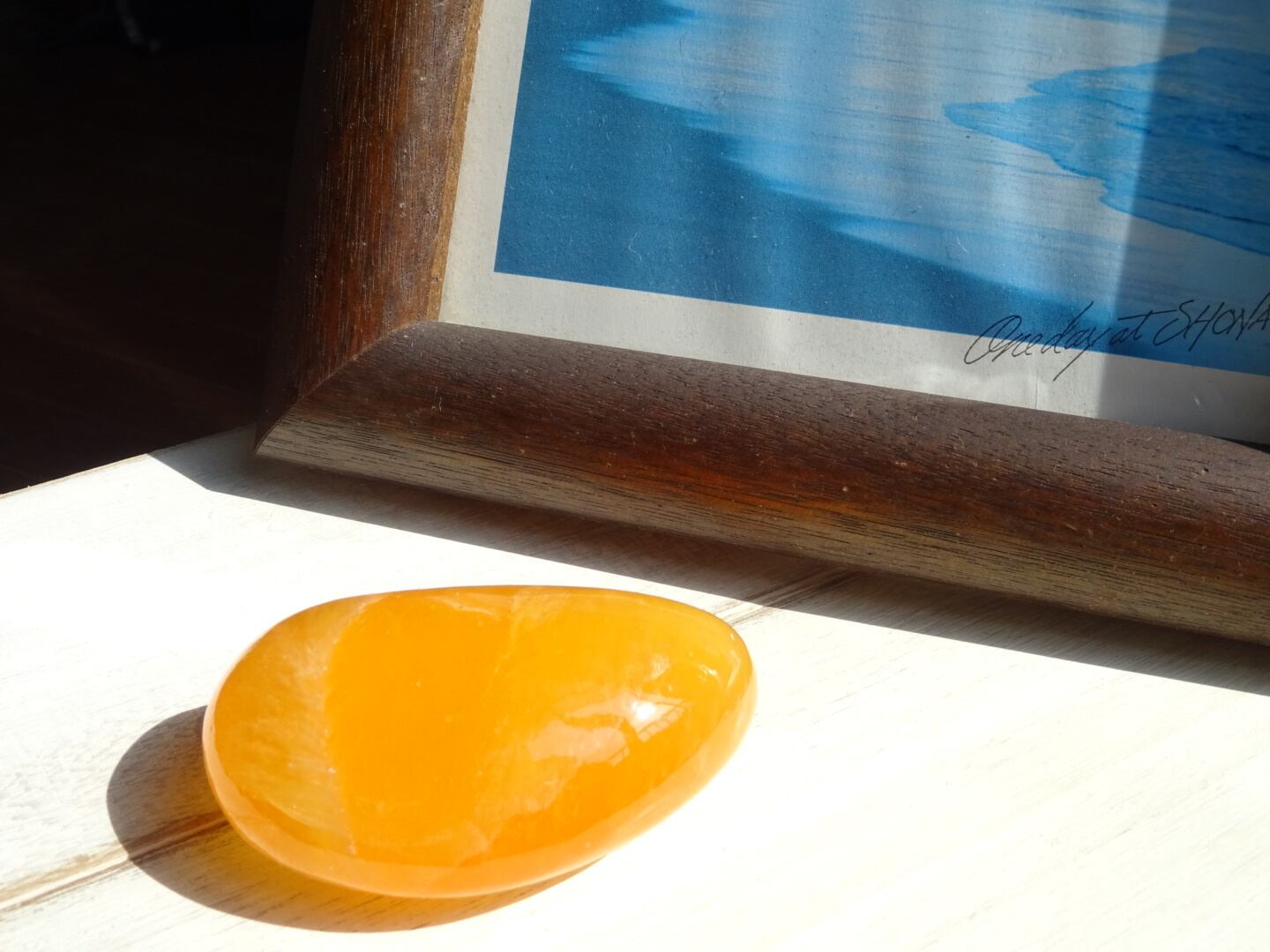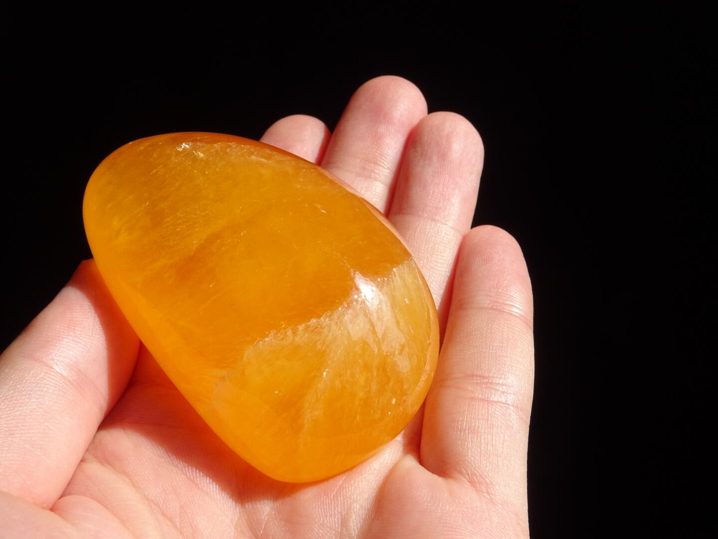本当にオレンジの果肉をそのまま鉱物にしたようなこちらの石。とってもフレッシュで、眺めているだけでも前向きさをもらえそうですし、瑞々しいオレンジ色の光の世界は見ていると惹きこまれます。手にしての瞑想にも心地よく、握りのよいカタチ。
