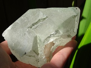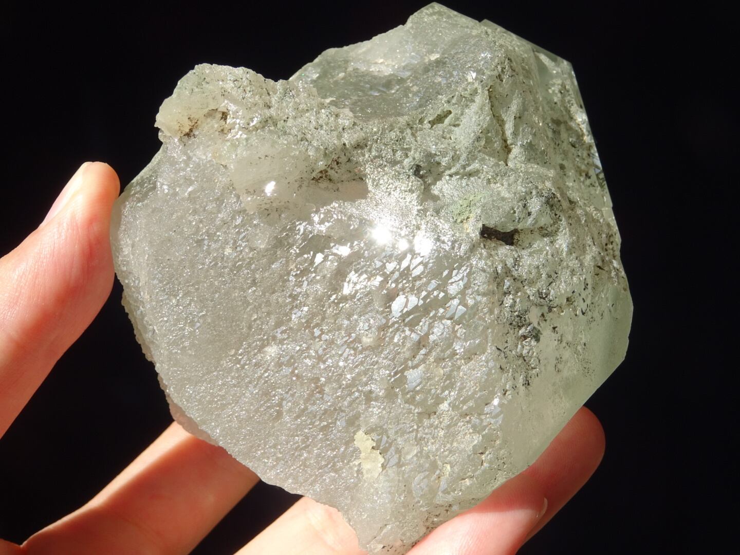 仕入れ元の情報によるとマイカ(雲母)が混ざることでこの色合いになっているそうですが、濃淡のあるグリーンの石肌は、それでも透明な側面から覗くと内部がとてもクリアであることがわかります。