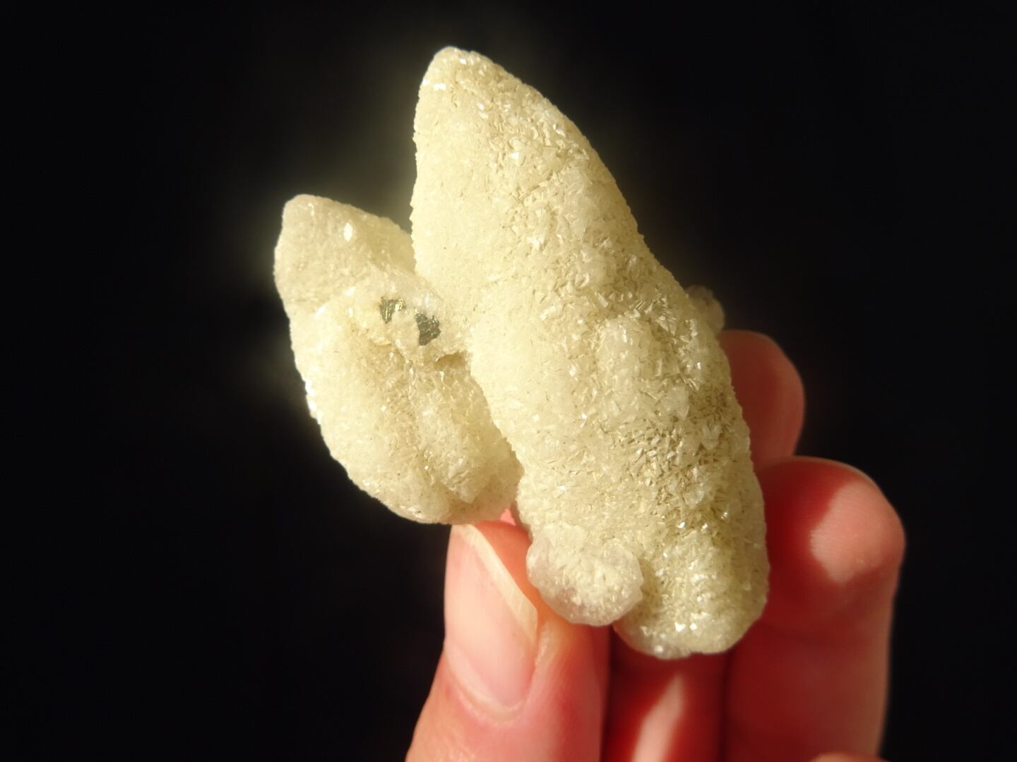 産地もさることながら、このフェアリーチックでエンジェリックな雰囲気に惹かれてセレクトしました。無条件に愛でたくなるような、童話の中に登場しそうな愛らしさを持っています。サイズも程よく、森や植物が似合う、小さな宝物といった風情。根元まで覆っている白いきらきらの結晶たちもいい味出しています。