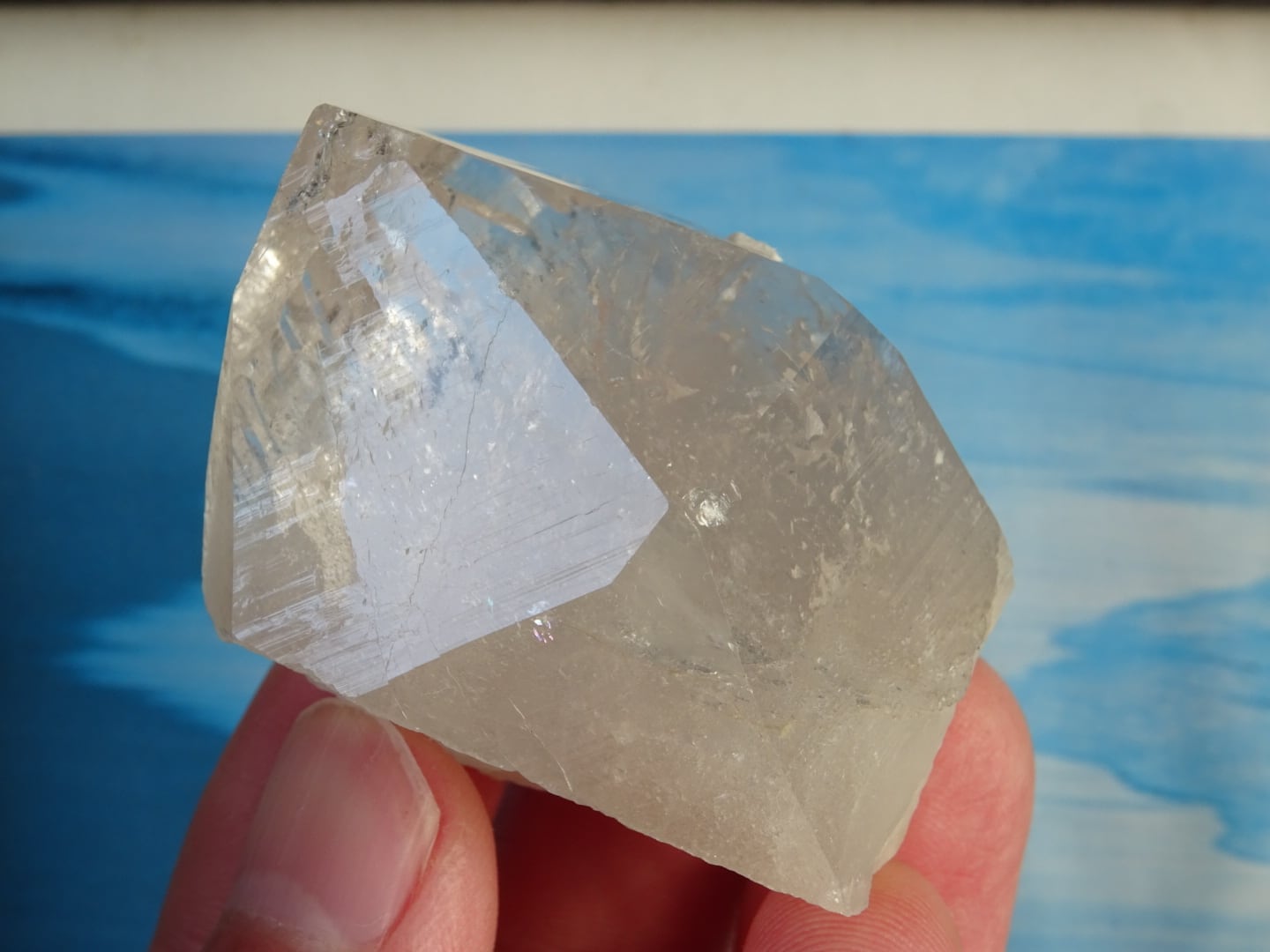 根元~柱面はインクルージョンやクラックによってフロスティに。底面はセルフヒール(再結晶)しているのか、とても細かに連晶しています。