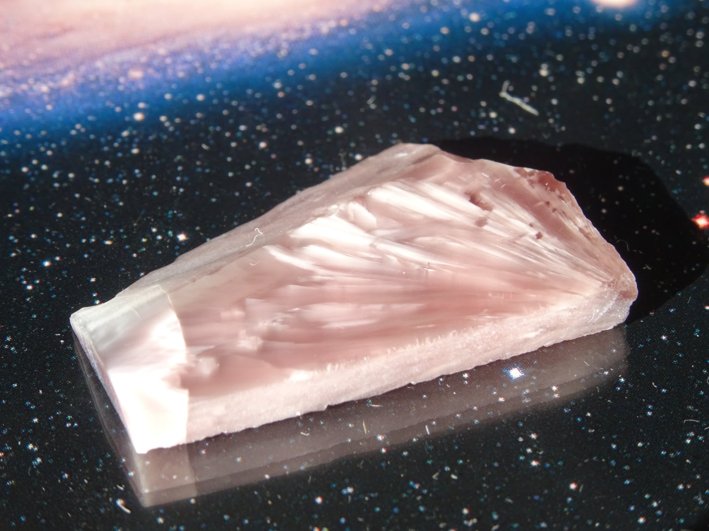シルバーがかった上品なピンク色をしており、セラフィナイトに似た模様の光が濃淡をつけながら浮かんでいてとても美しいです。角度によってさまざまに芸術的な光の模様を魅せてくれます。