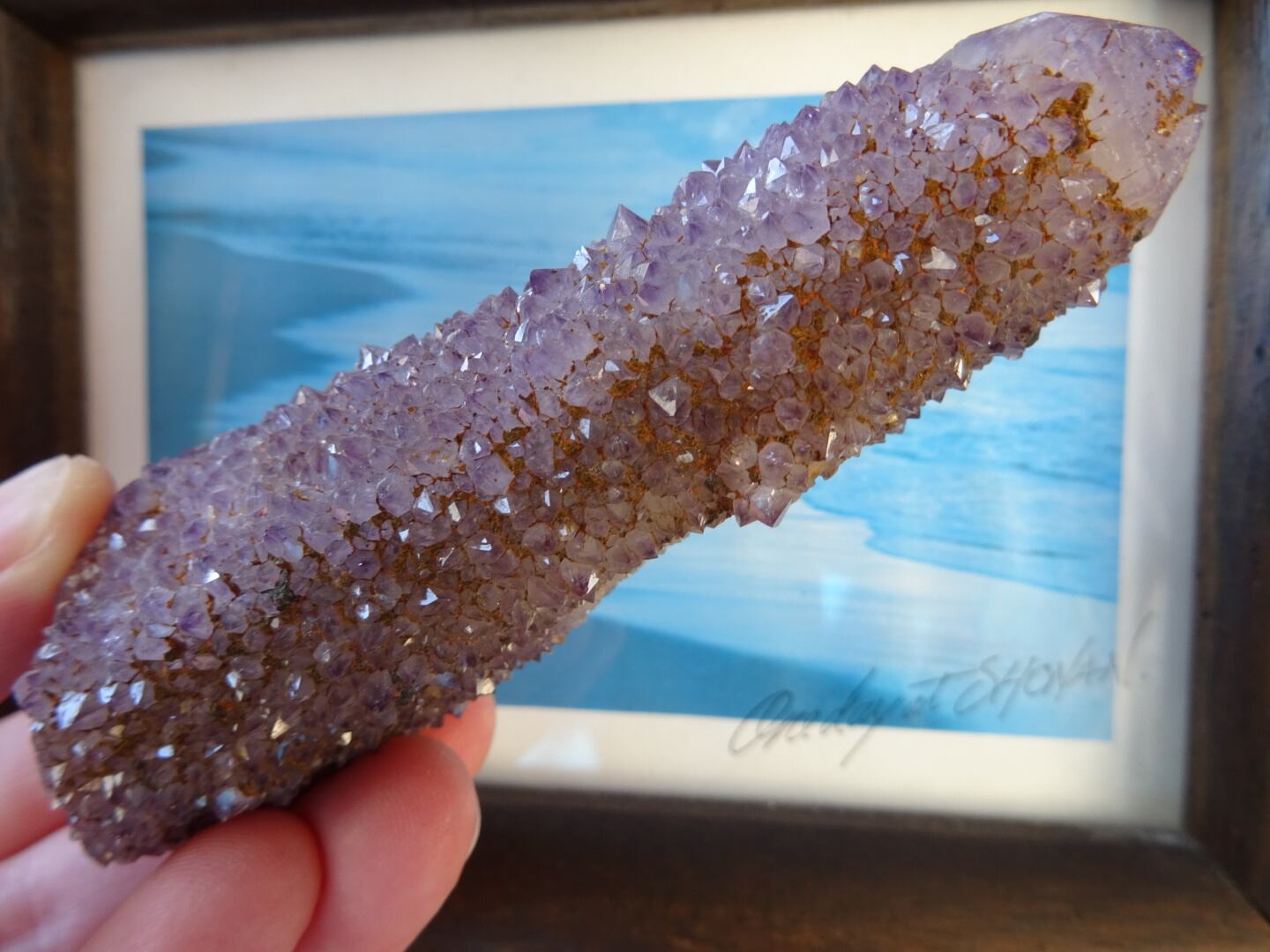 こういったカクタス(サボテン)の石はクラスターよりも微細にその響きを周りに届けてくれるので、いわゆる浄化やヒーリングにもお勧めです。カクタスアメジストの波動はライラックの光のシャワーのように、とても清らかで優しいものです。