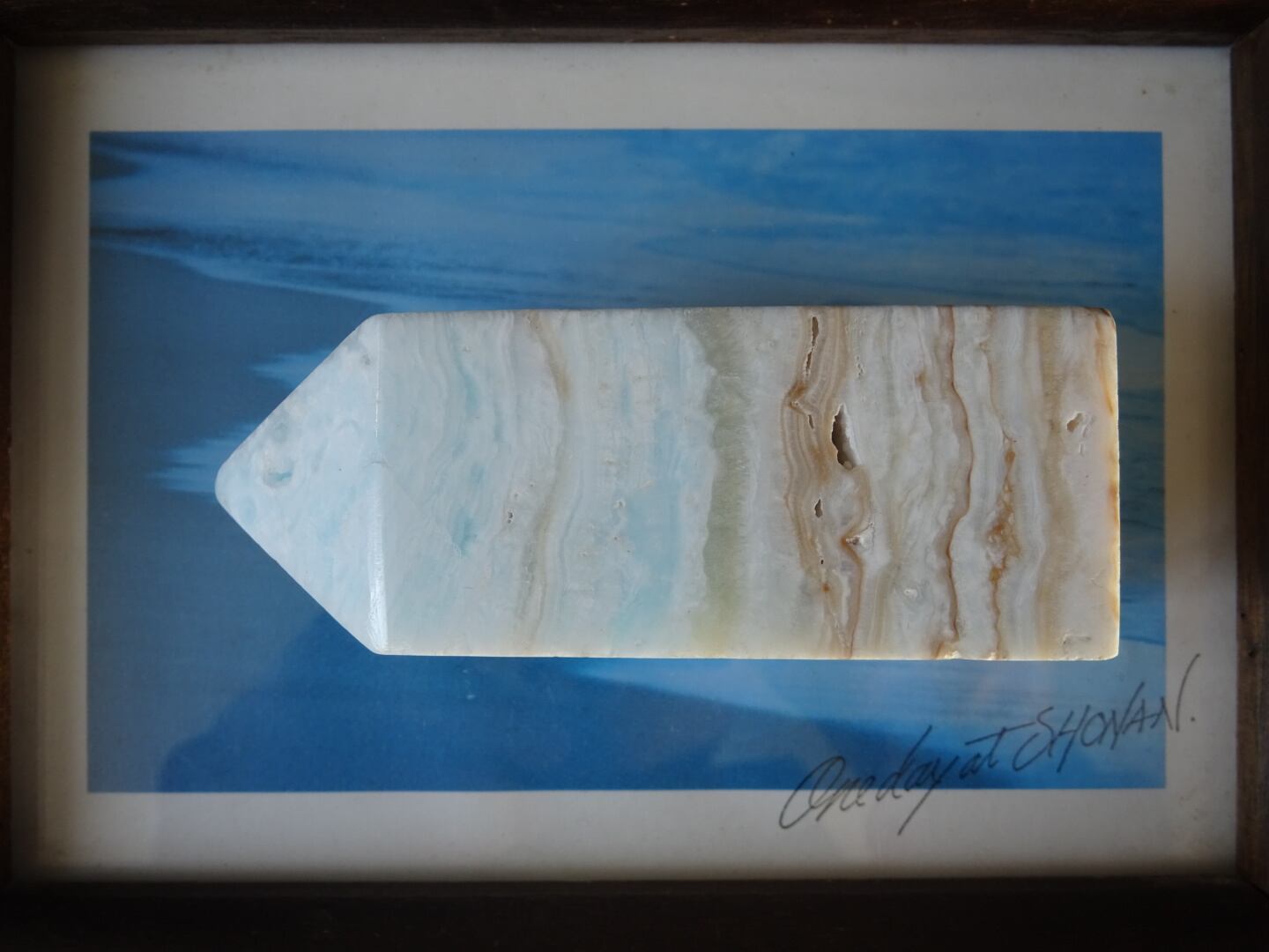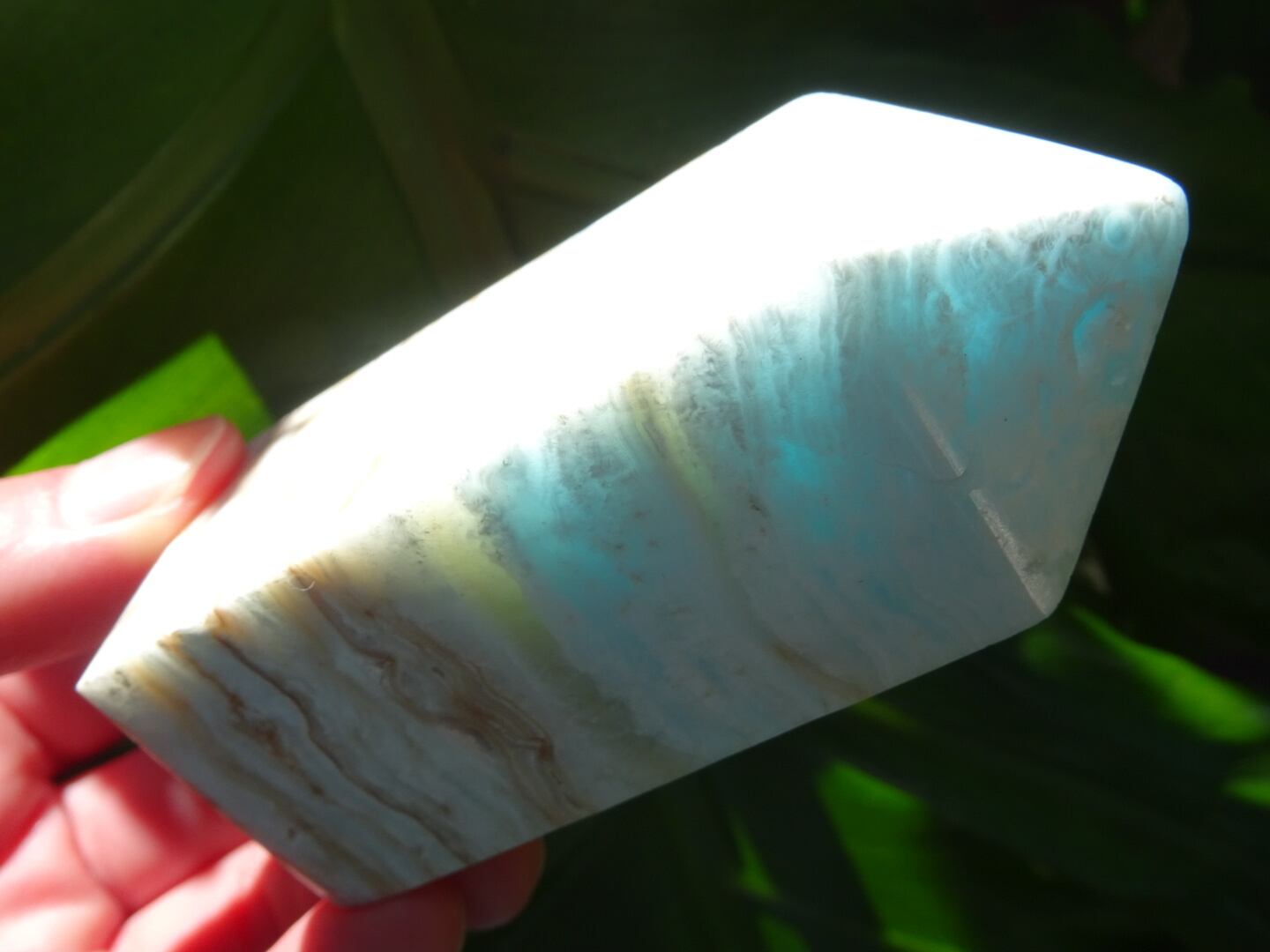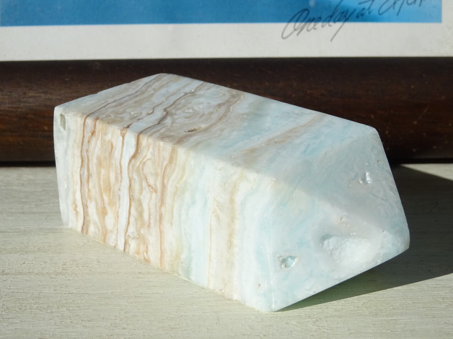 こちらはラリマーにも似た淡く優しいブルーとブラウンが流れる層のように浮かんでいるオベリスクです。フォルムも色合いも美しく、お洒落で絵になる逸品です。