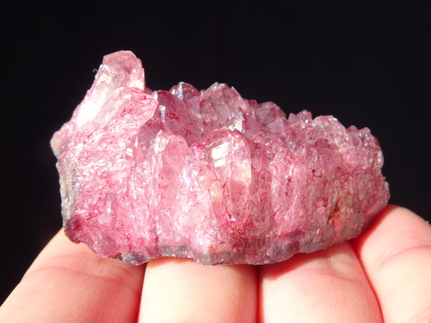 全体が赤みを帯びたピンク色になっており、結晶面からはグリーンやパープルのオーラカラーが反射しています。ミドルサイズの島のようなフォルムで、情熱的な色合いが素敵な一点です。