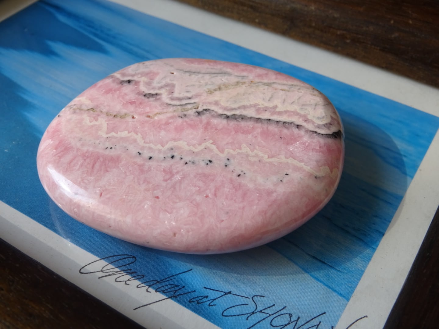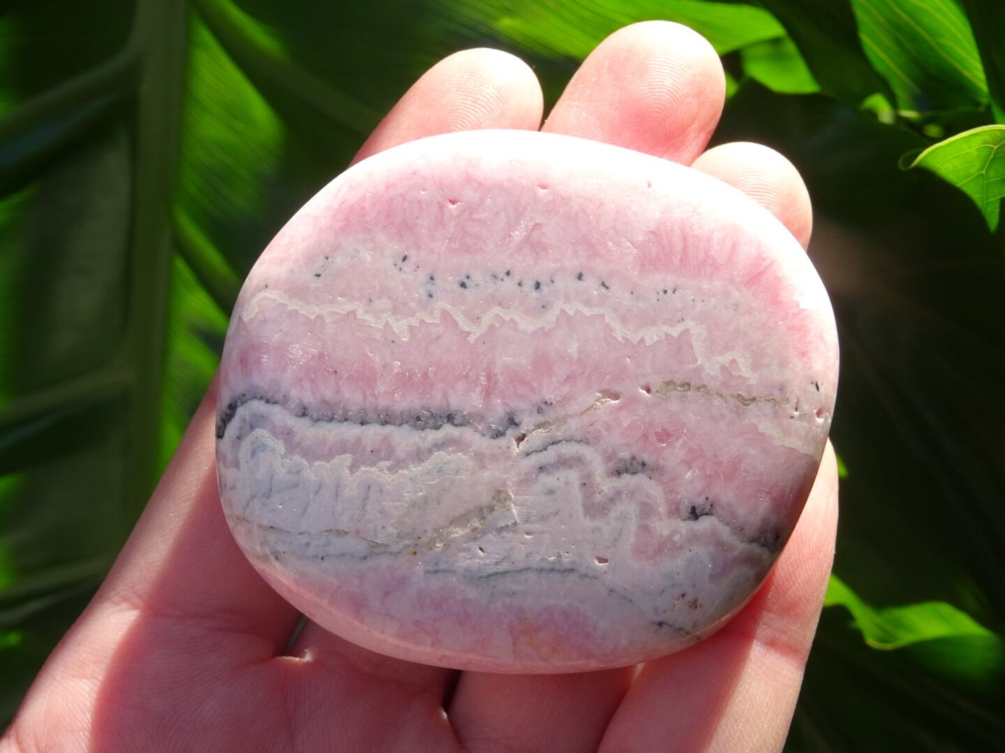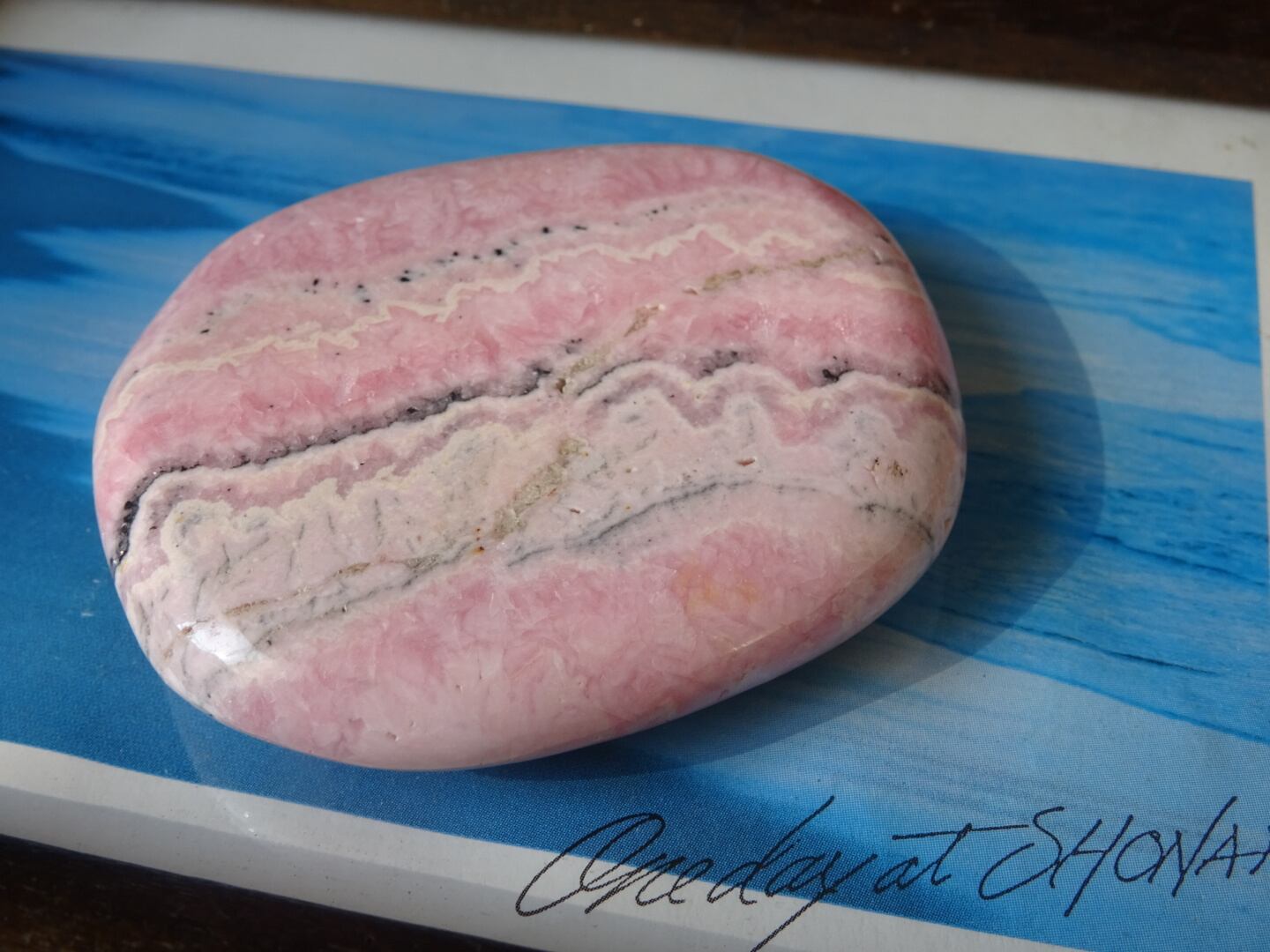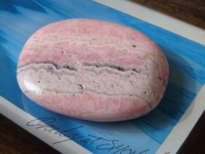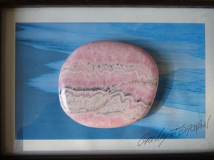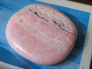 柔らかいピンクの色模様が美しい、ロードクロサイトの磨き石。層状になった白とピンクが優しい世界を広げています。ツルツルの石肌も心地よく、平たいスラブのお洒落な1点です。