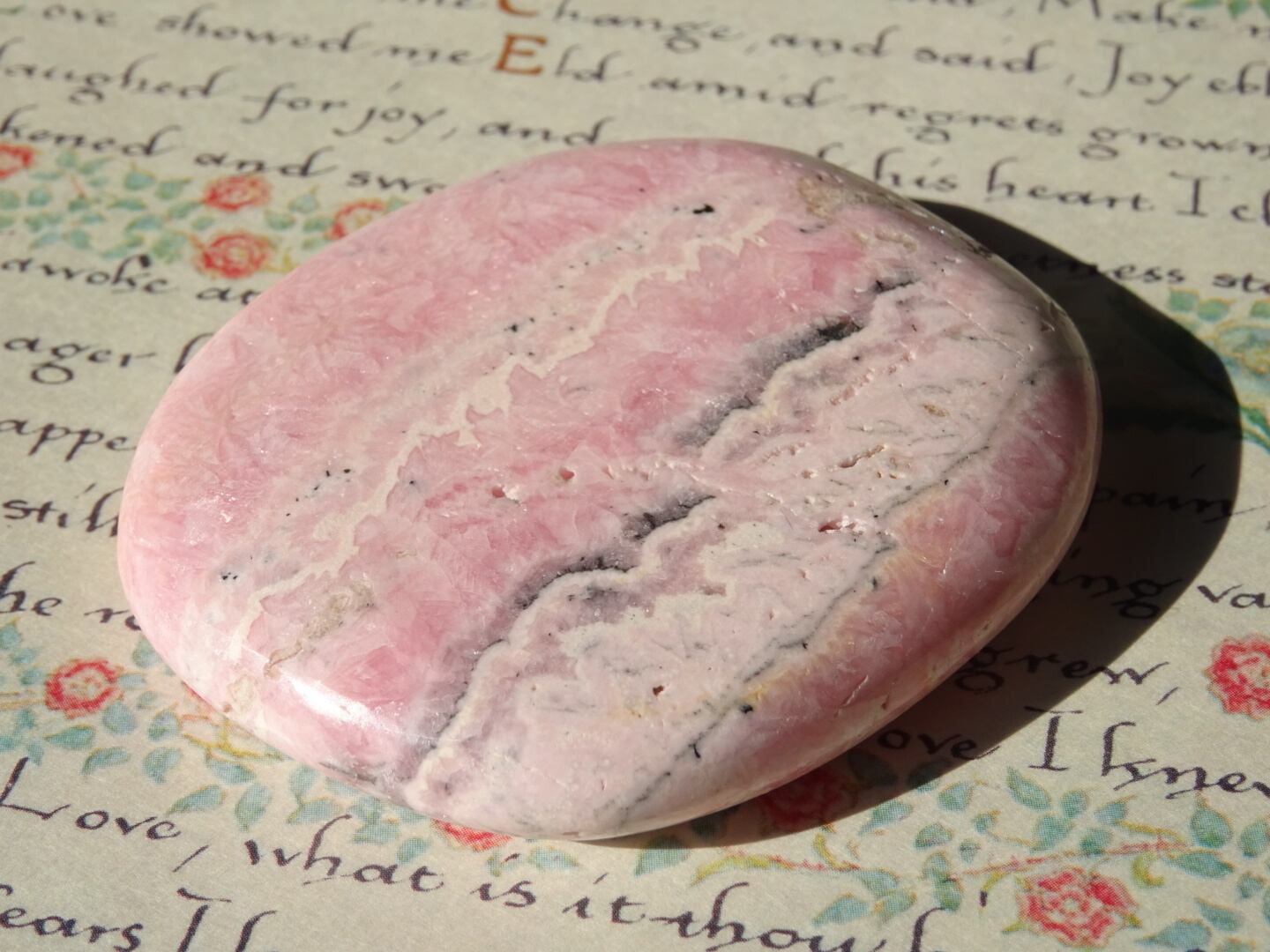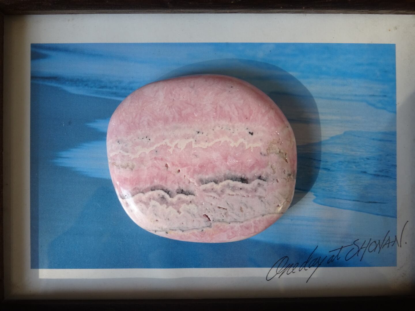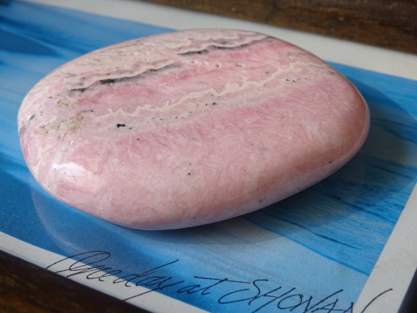 柔らかいピンクの色模様が美しい、ロードクロサイトの磨き石。層状になった白とピンクが優しい世界を広げています。ツルツルの石肌も心地よく、平たいスラブのお洒落な1点です。