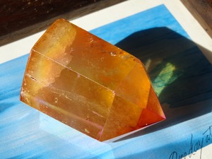 同時にUPしたもうひとつとは仲良く並べていたのですが、ふとした時にキラリと光るオーラカラーはドキっとするような美しさ。透明感のあるオレンジに浮かぶレインボーがただただ綺麗で存在感があります。明るいカラーストーンインテリアとしてもおすすめ。