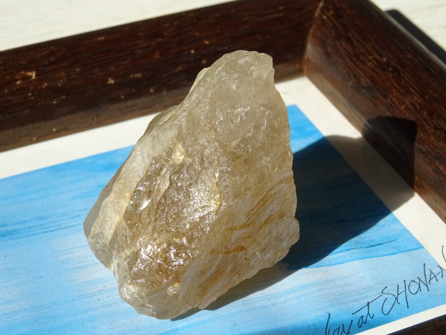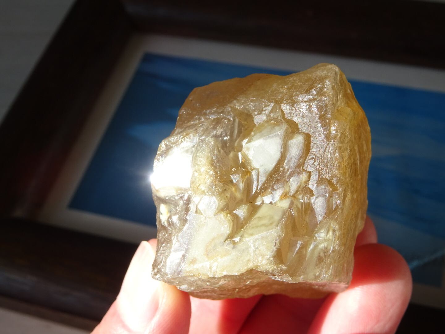 こちらはボリュームある優し気な色合いのゴールデンザギ。ゴツゴツとした岩のようでもありますが、三角形に連晶している部分は光がきらきらと反射していてとりわけ綺麗です。ザギはもともとパワフルな石だと思いますが、やはりこれぐらいサイズがあるとクリスタルワークなどにも頼もしく重宝しますね。