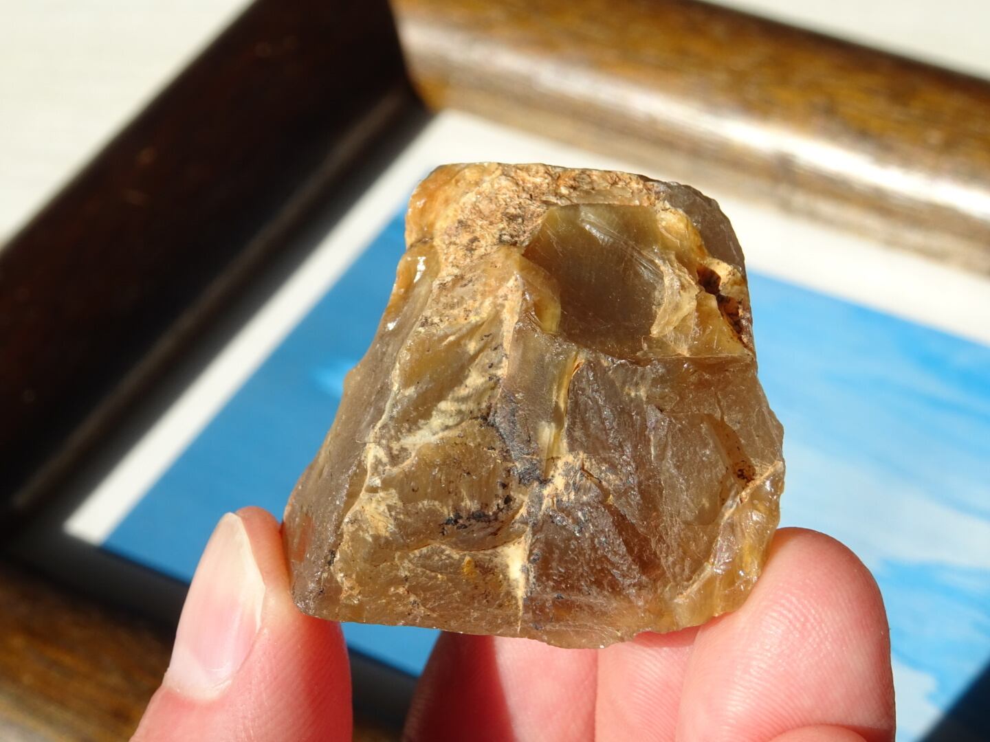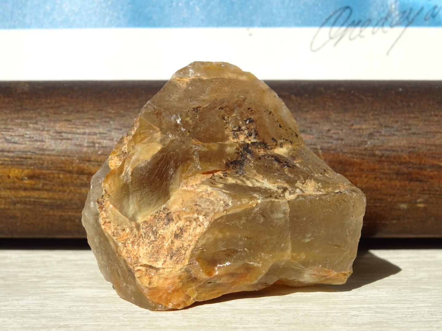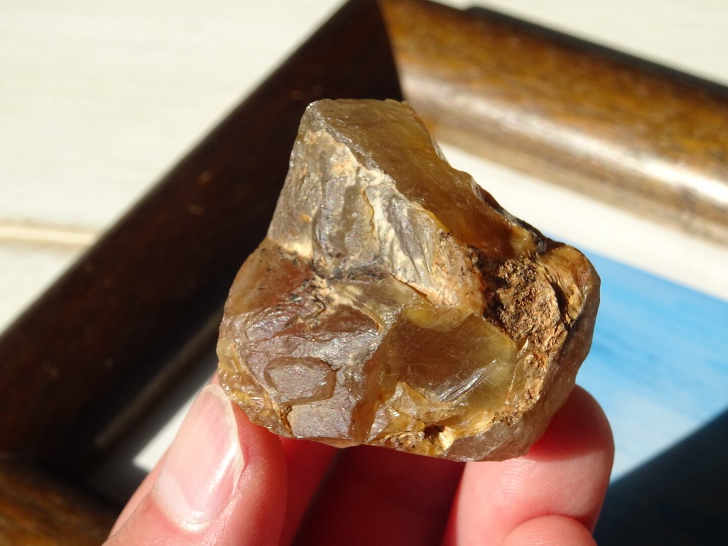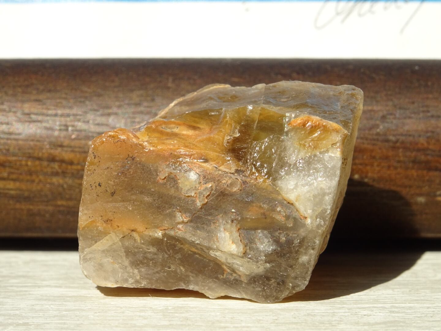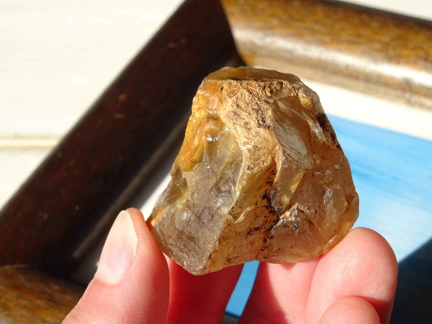 ザギはどんなものであってもお宝のような感覚で眺めてしまうのですが、こちらも濃密なザギカラーがよく出ていてくゥ~っと唸ってしまった1点。ザギのキャラメルソースがけのようでとても「美味しそう」な姿をしています。アストロフィライト、またはアンフィボールが溶けだしたように沁みこんだものは本当に魅力がありますね。こちらはサイズも程よいのでどこへでも連れだせます。