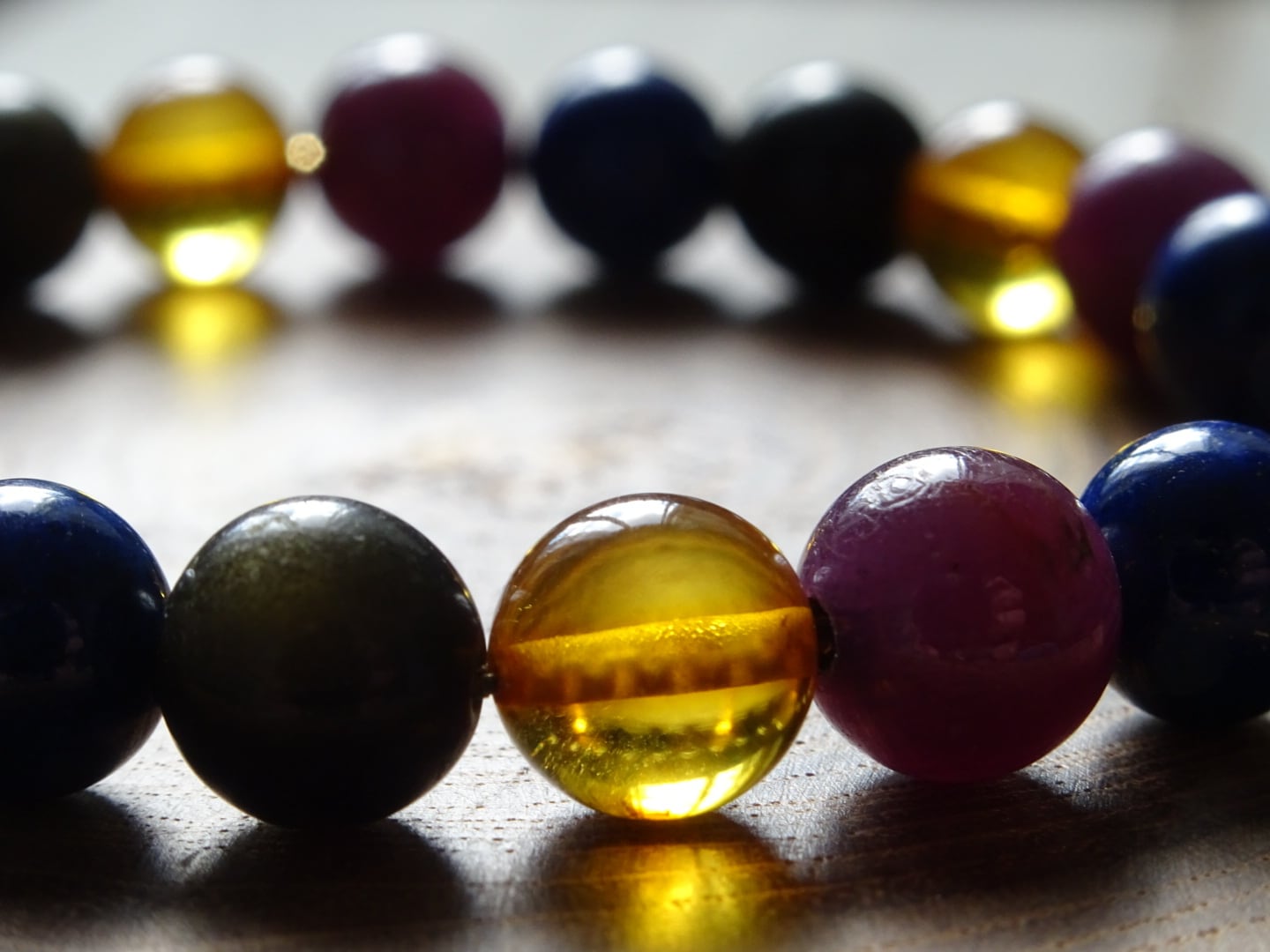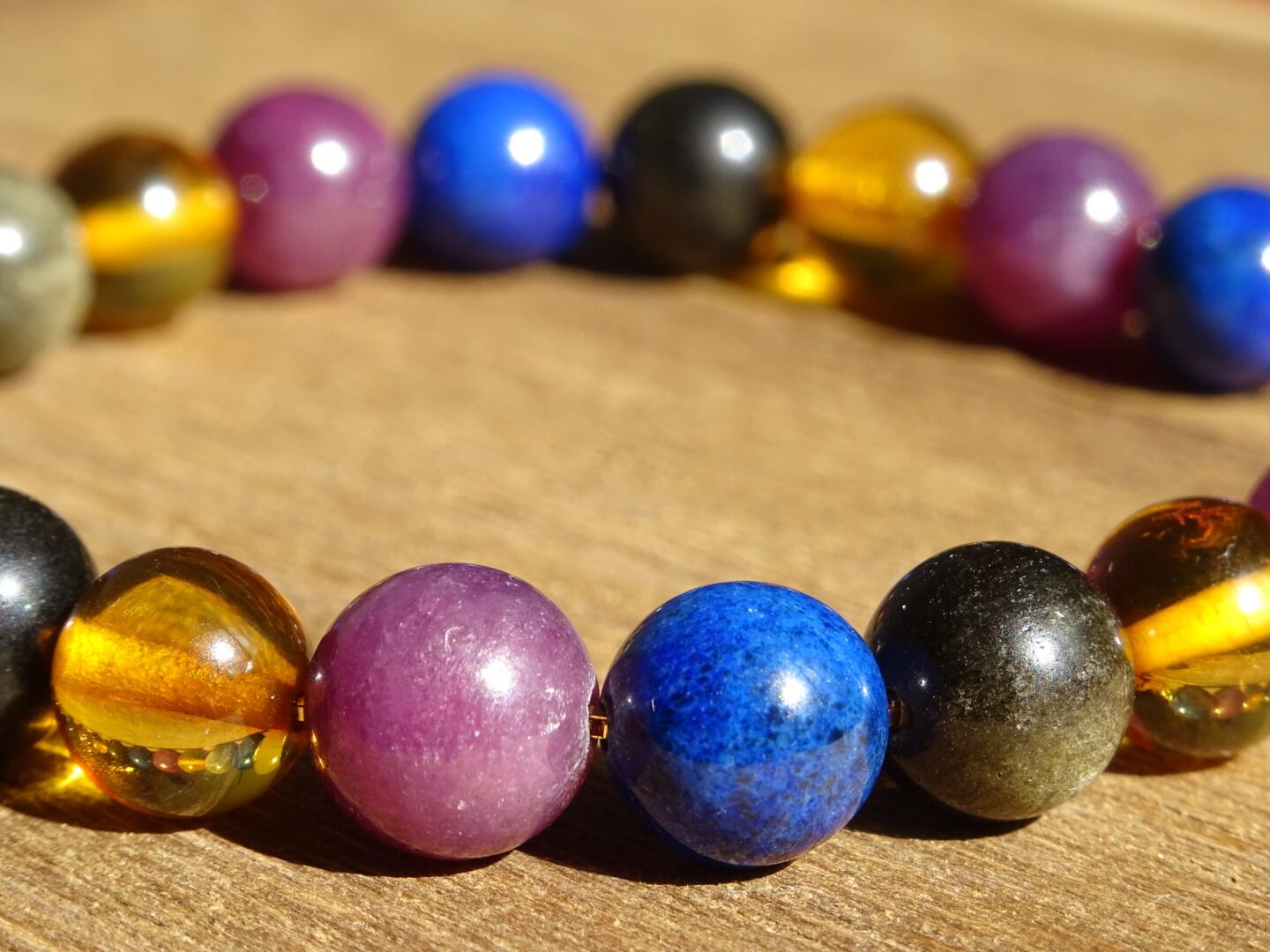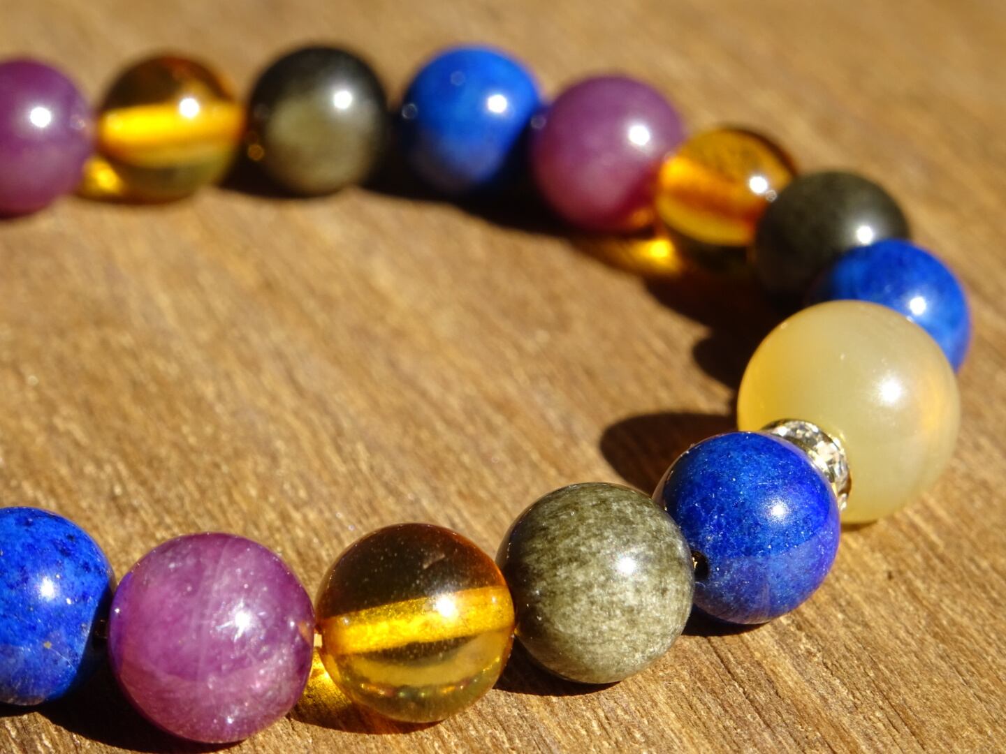 ブレスレットを創作することの面白さは「ある頭のなかにある世界」やイメージをこの世界に雫のように目に見えるカタチで落とせることだと思いますが、ひとつひとつの石の個性がきらりと光りつつ全体で調和するよう、フィーリングで作品を編んでみました。