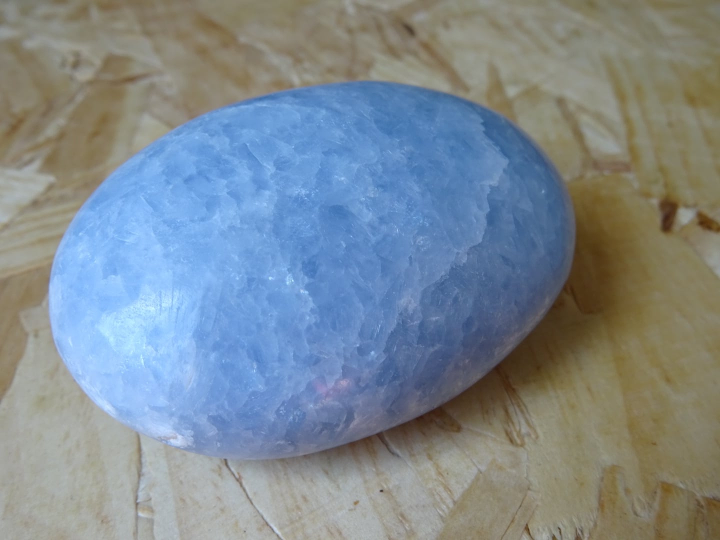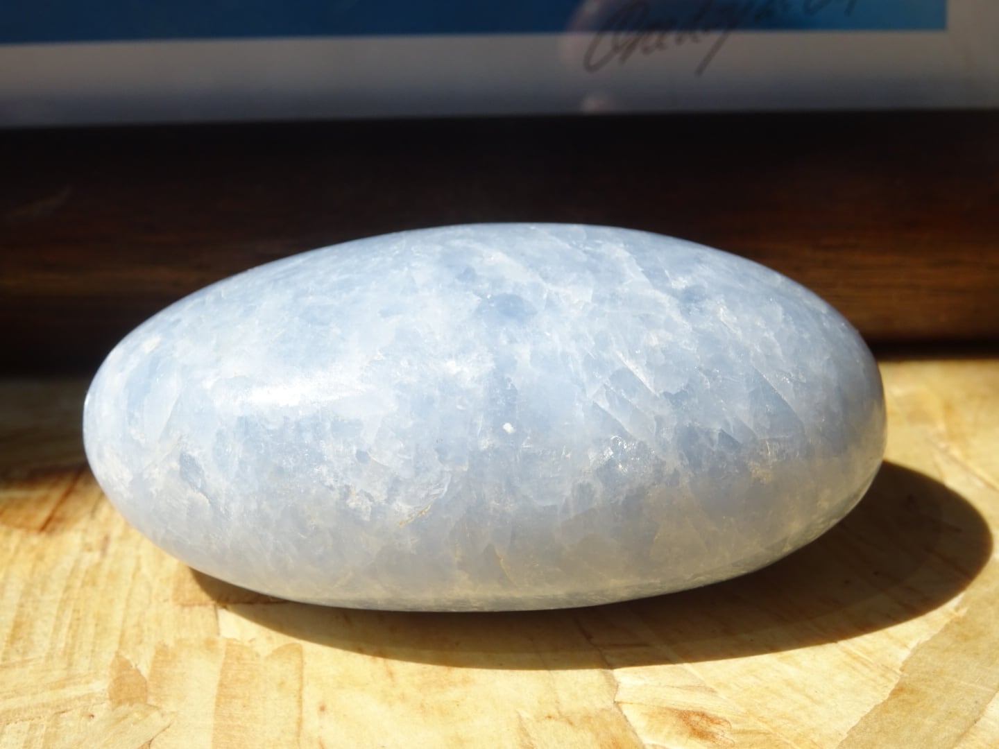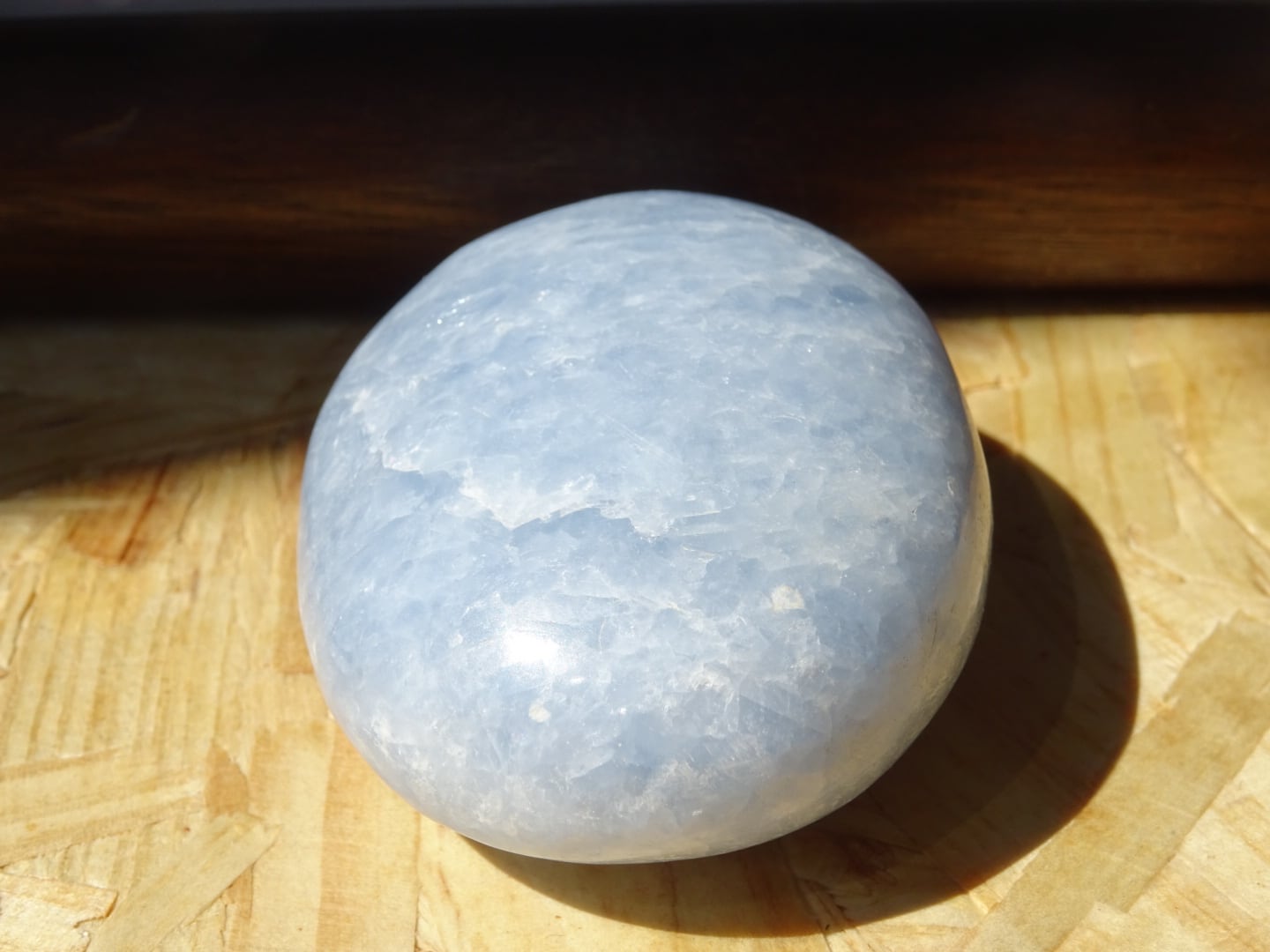 淡いホワイトブルーが美しいカルサイト。ツルツルの石肌は片面がたいらに、もう片面はふっくらしたフォルム。こちらはフチ部分に白い擦れ、浅いカケのような跡が見られますのでご承知おきくださいませ。
