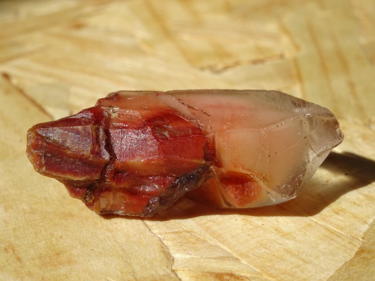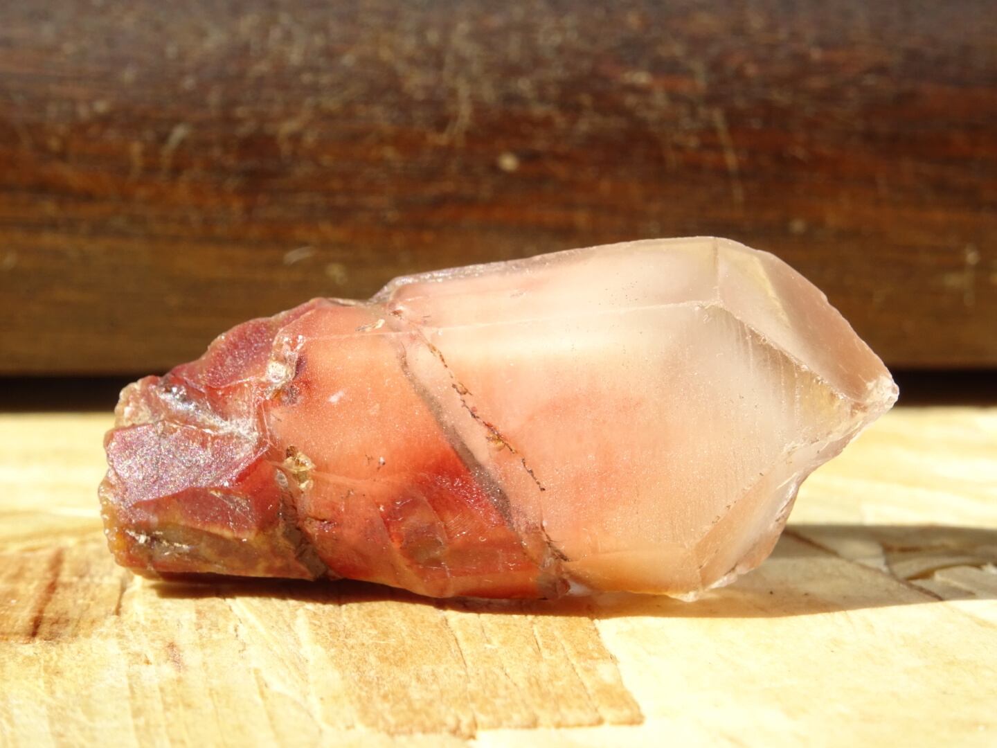 よく見るとカテドラルのように上と下に結晶面があるのですが、背面からみるとちょうどナタでスパっと切ったような境目があるのがわかります。ですので、一度にんじん水晶として結晶したのちに成長をとめて、やや成分のことなる鉄分を取りこみながらベージュの結晶を作っていったのだと思います。