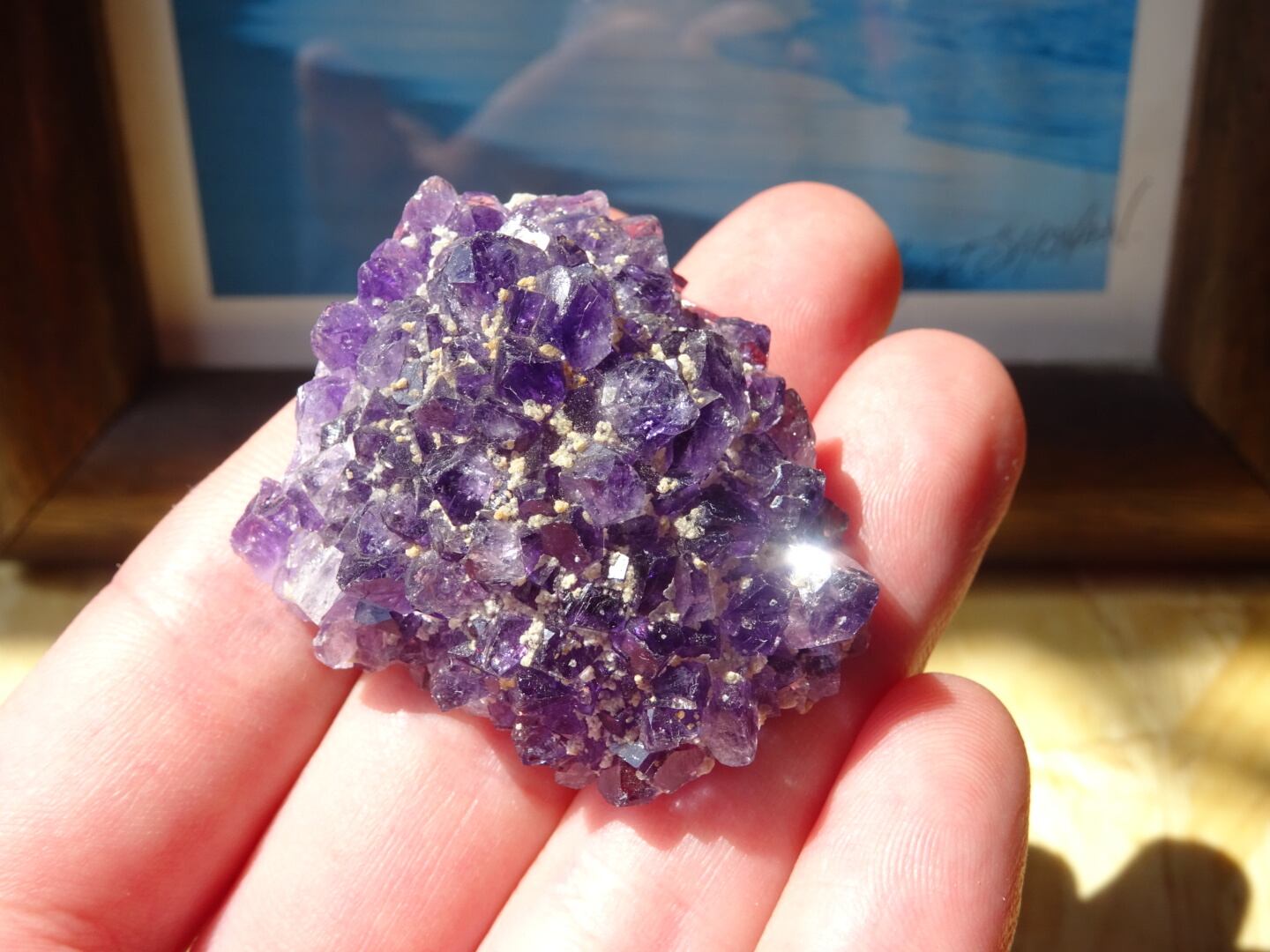 ハリネズミ、または小さな島や丘のようなフォルムのアメジスト。白っぽい粒々をまぶしているのが可愛くてセレクトしてきました。