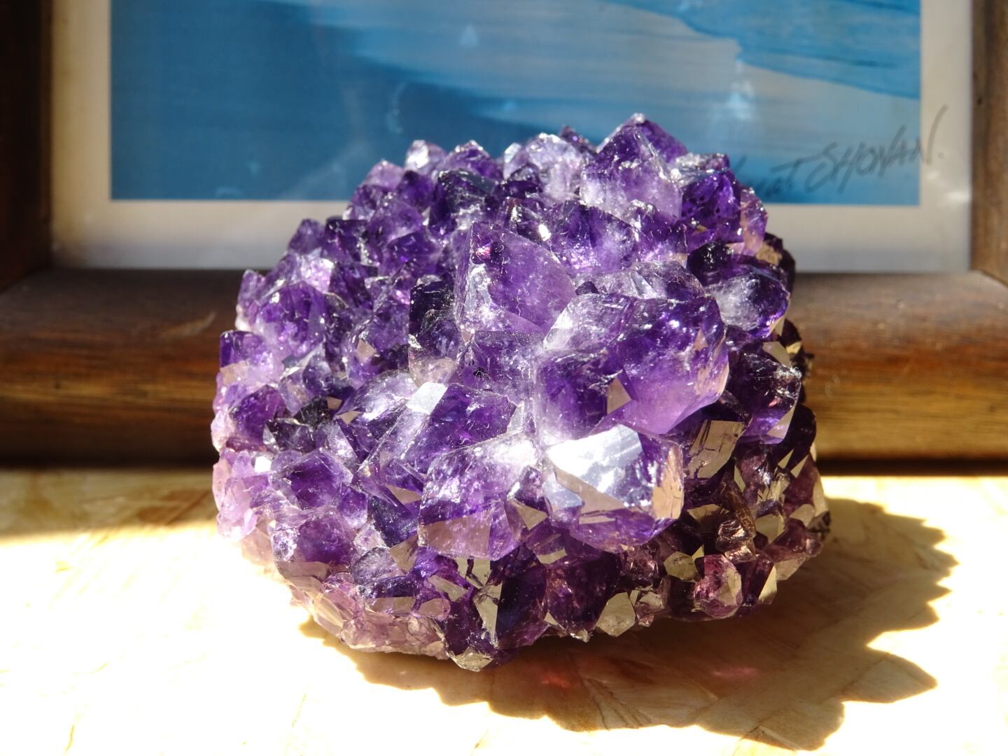 濃いめの紫がしっかりと出ており、照りのある石肌をしています。背面には洞窟のような穴が空いています。クラックで若干白っぽくなっている部分もありますが、色味、形のよい結晶たちによる愛らしいクラスターです。