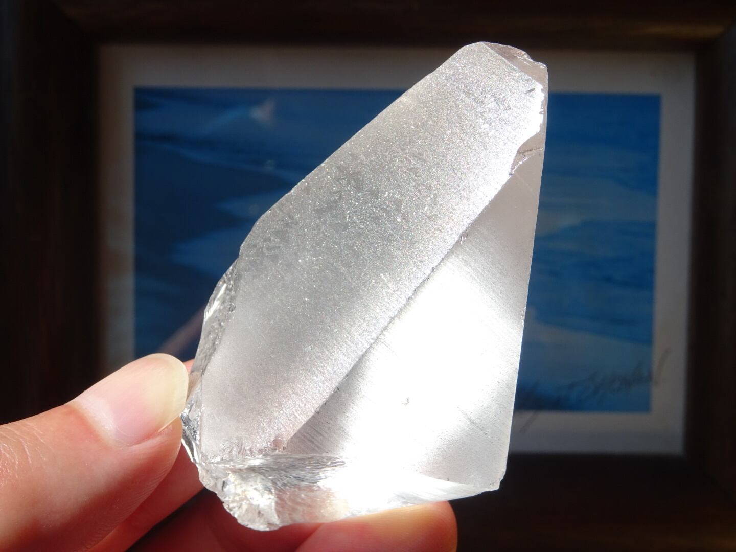 銀色がかった姿が美しく、内側はクラックやインクルージョンもなくとてもクリア。柱面のひとつには角度によって不思議な三角形のマークがびっしりと浮かび上がります。右側の傾斜をもつ「フューチャータイムリンク」が細長く印象的に出ています。