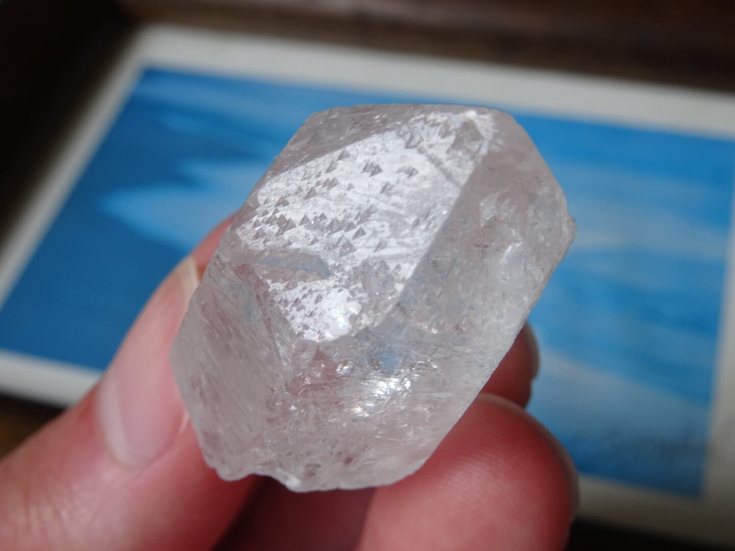 こちらはファセットのほぼ全面に逆三角形の窪みである「トライゴーニック」のキーがたくさん浮き出ています。チョコンと自立する愛らしい石で、蝕像やトライゴンの姿、そして瑞々しい雰囲気を感じる美しいクリスタルです。