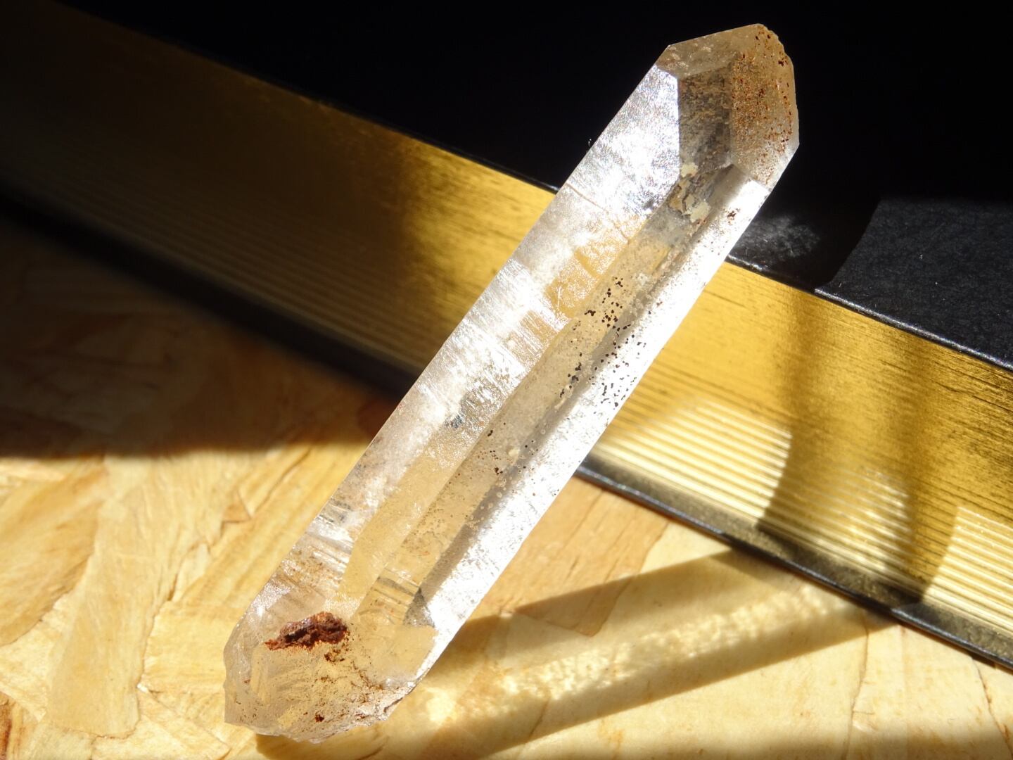 鉄分の影響でどこかブラウンがかって見えるこの石は結晶のバランスが非常によいです。蝕像をうけている部分や鉄分でくぐもって見える面はあるものの、内側はクラックやインクルージョンがなくとてもクリア。また、非常に美しい平行四辺形(パストタイムリンク)が出ています。