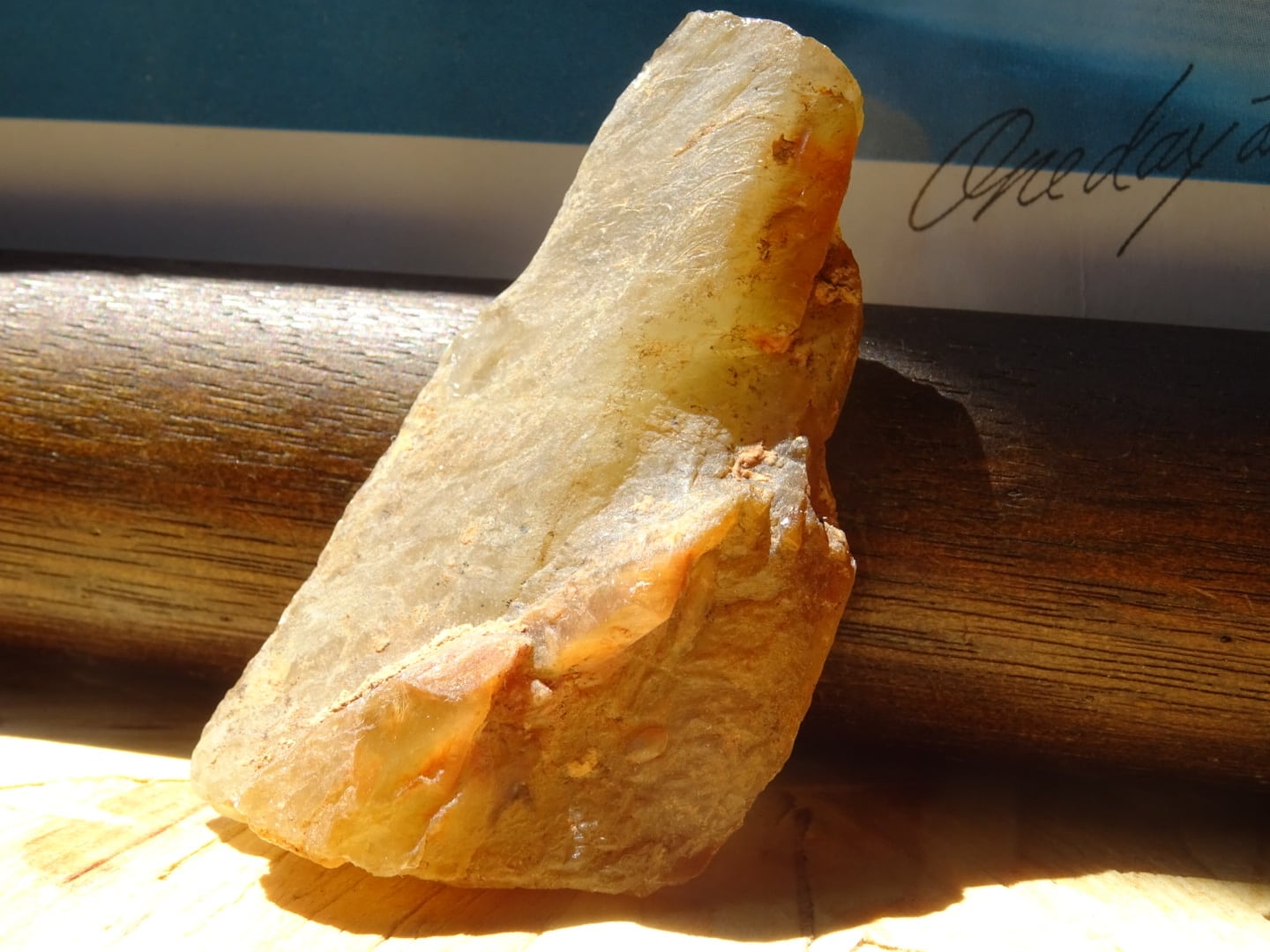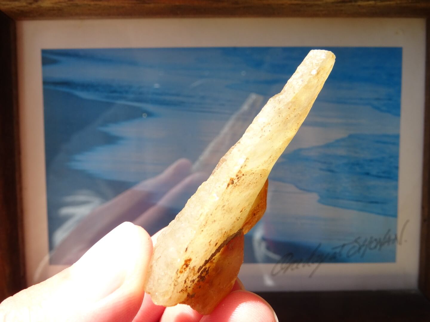 こちらは薄い板状結晶のユニークさん。成分が沁みこんで濃淡のあるうっすらブラウンゴールドを広げて、どこか懐かしい色合い。けれど、やはり魅力のひとつは裏面のセルフヒールでしょうか。母岩から離れたあと、ザクザクに再結晶を始めた再生のちからをもったザギ。
